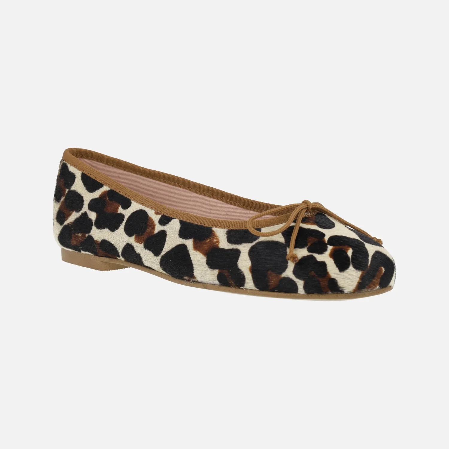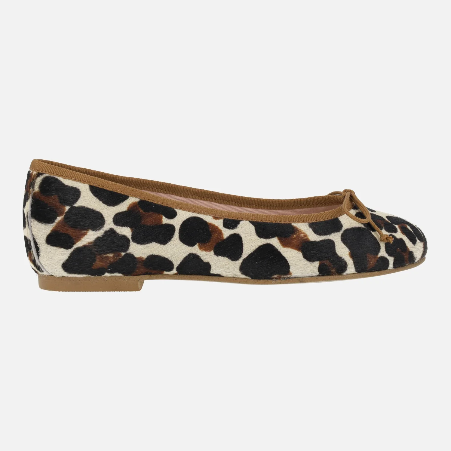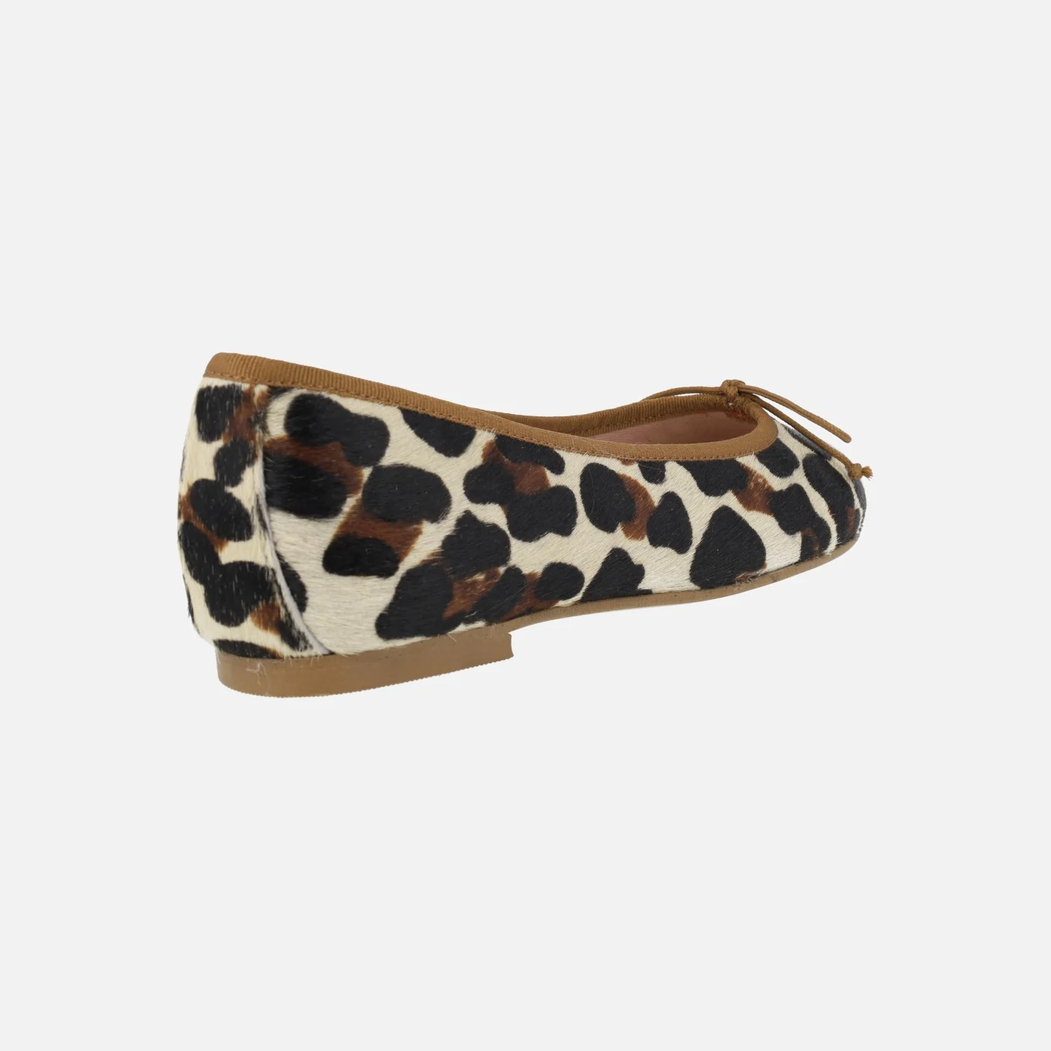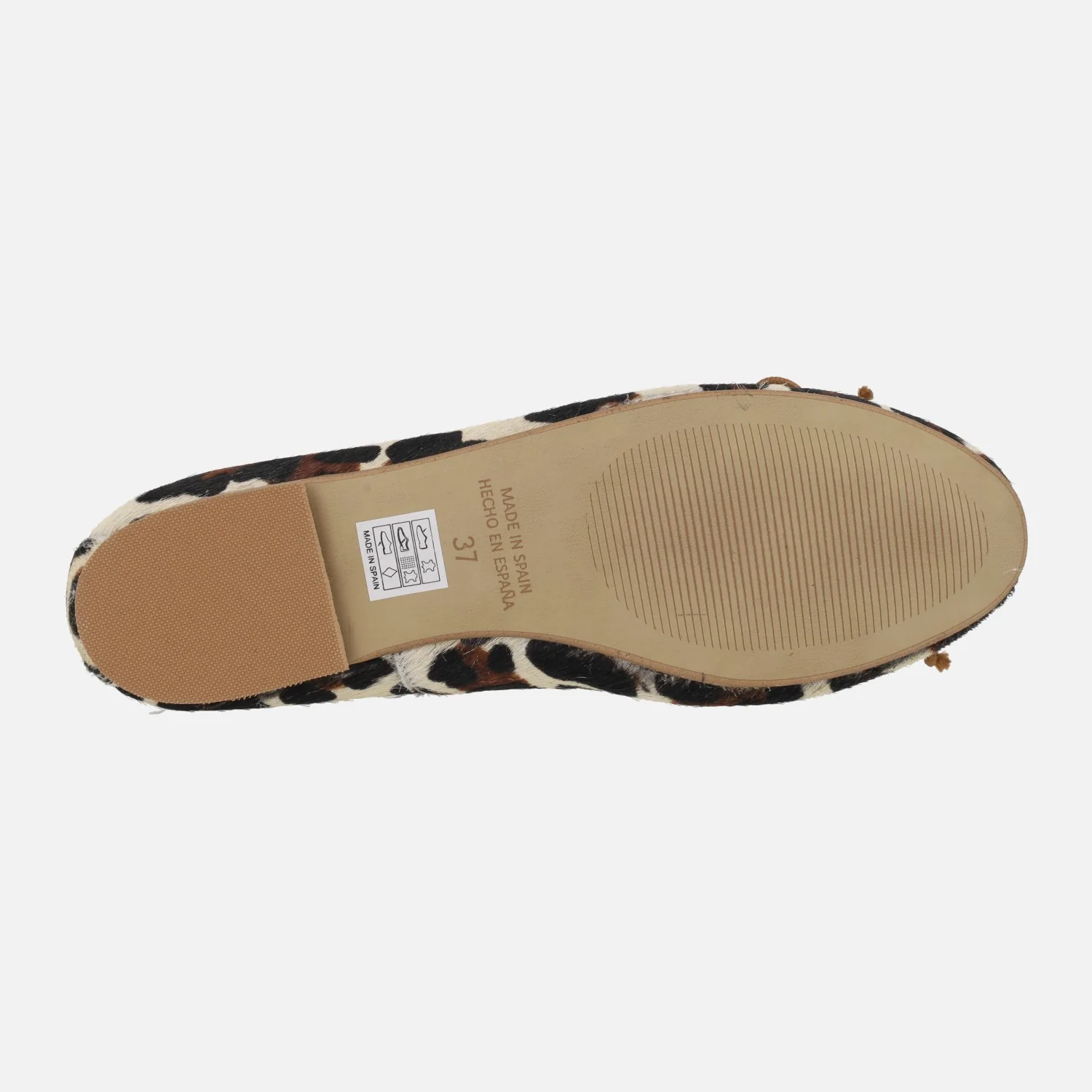 Bailarinas en pelo print leopardo de la marca Euforia modelo Emma Jaguar. Bailarinas de piel en acabado pelo leopardo, con ribete y lazo textiles. Interior mixto, en tejido con planta de piel. Piso sintético, plano, de apenas 2 cms de tacón. Made in Spain.