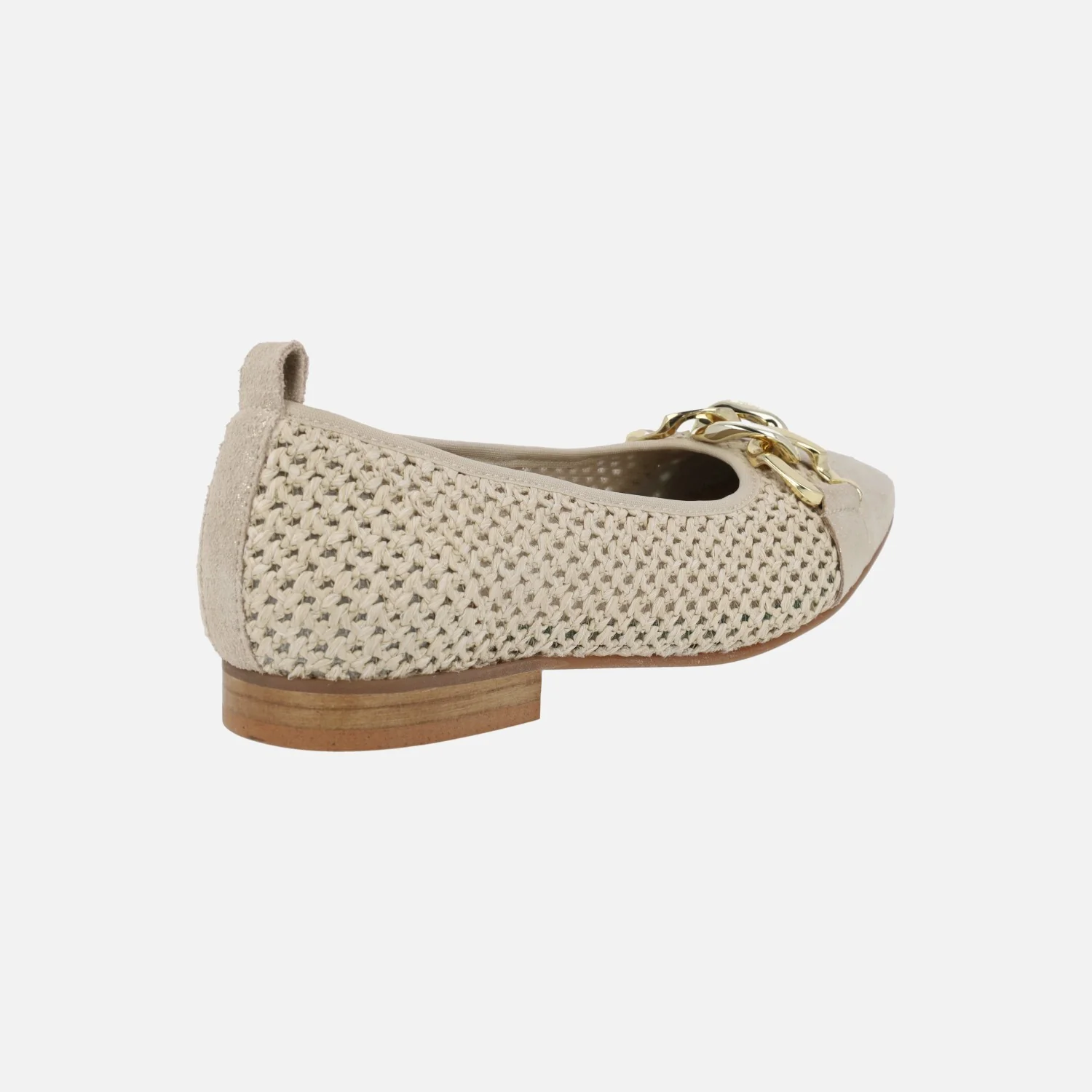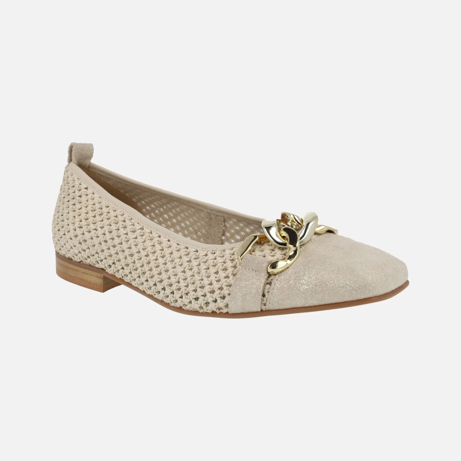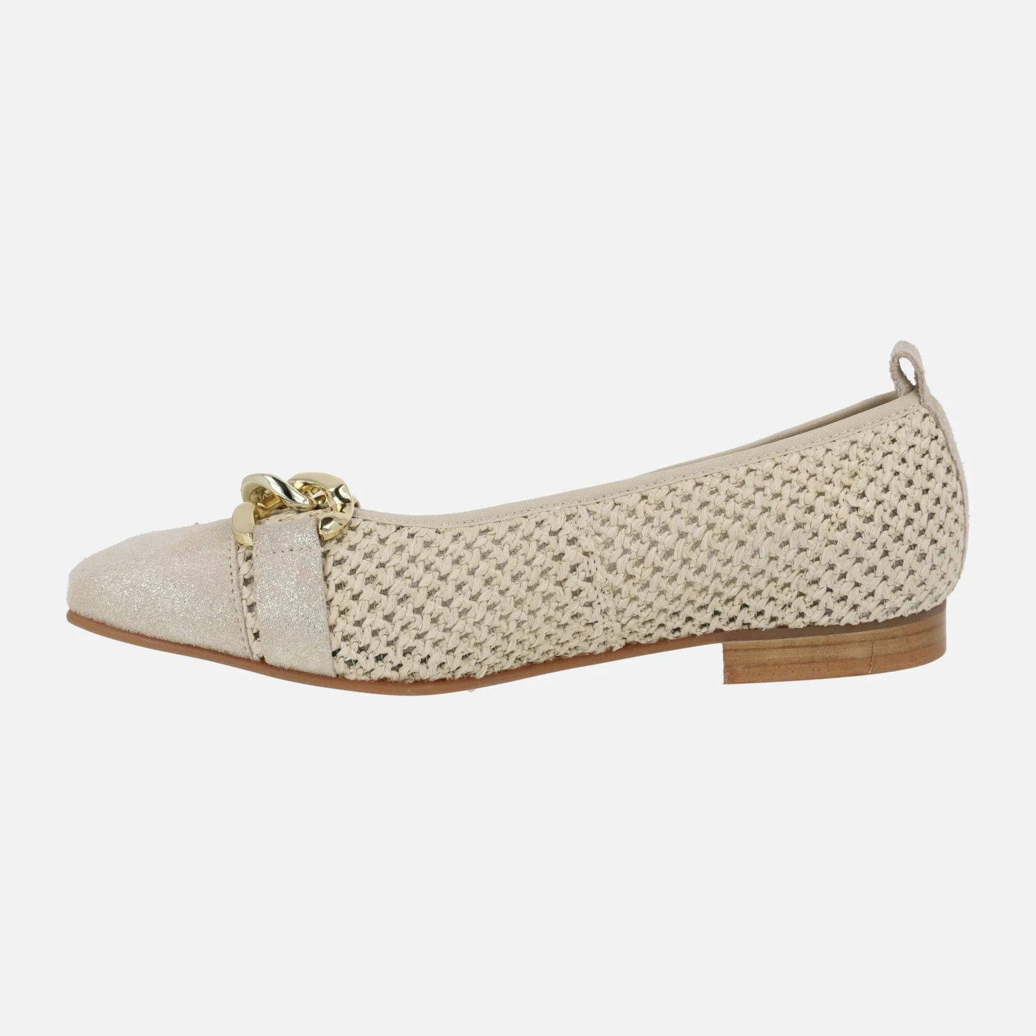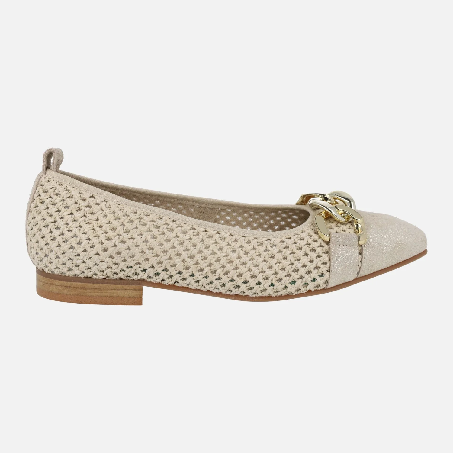 Preciosas bailarinas combinadas en tejido rejilla rafia beige y ante metalizado, modelo Tritus de la marca Salonissimos. Bailarinas con adorno metálico dorado de cadena en la pala. Interior mixto de tejido y otros materiales. Piso de goma con tacones de 2,5 cms de altura. Made in Spain.