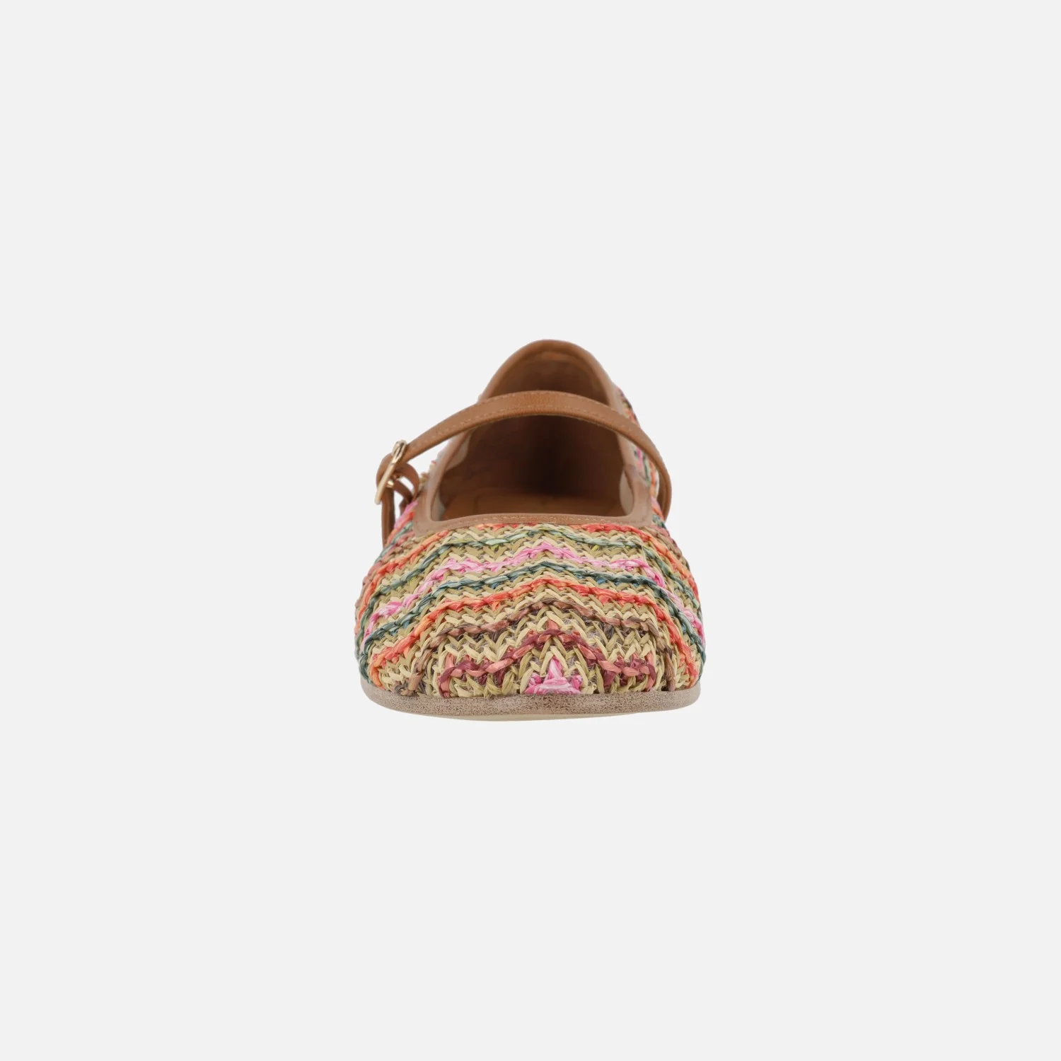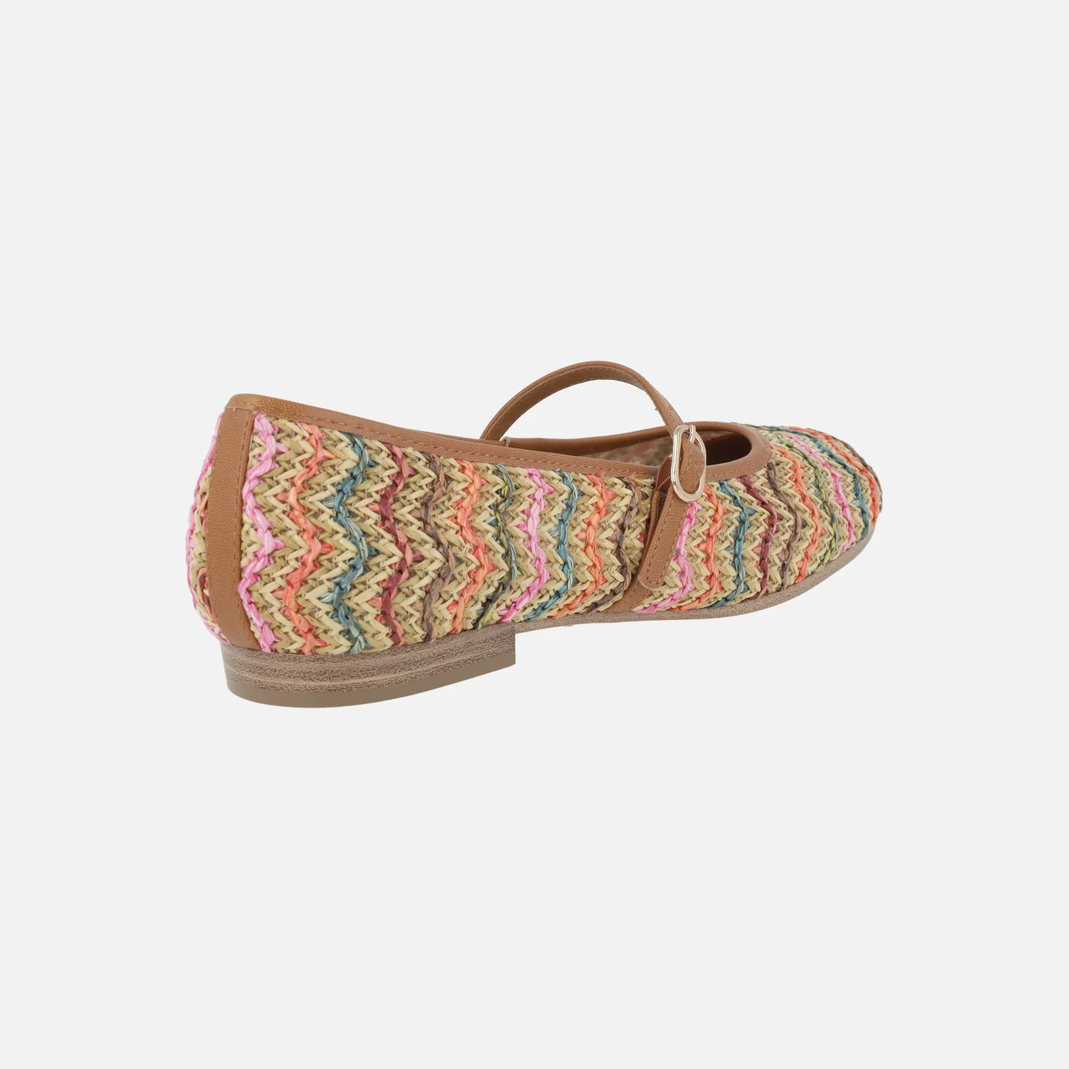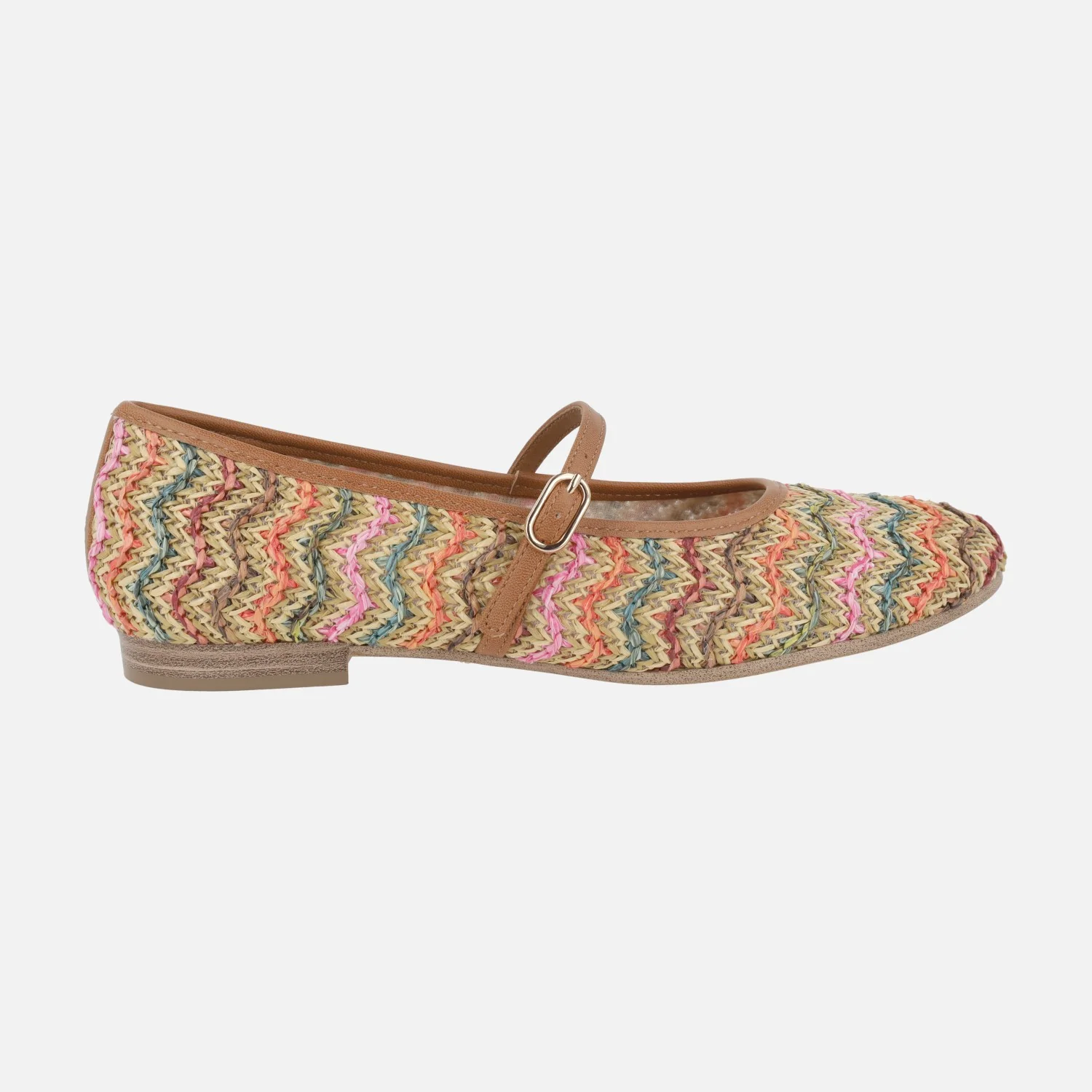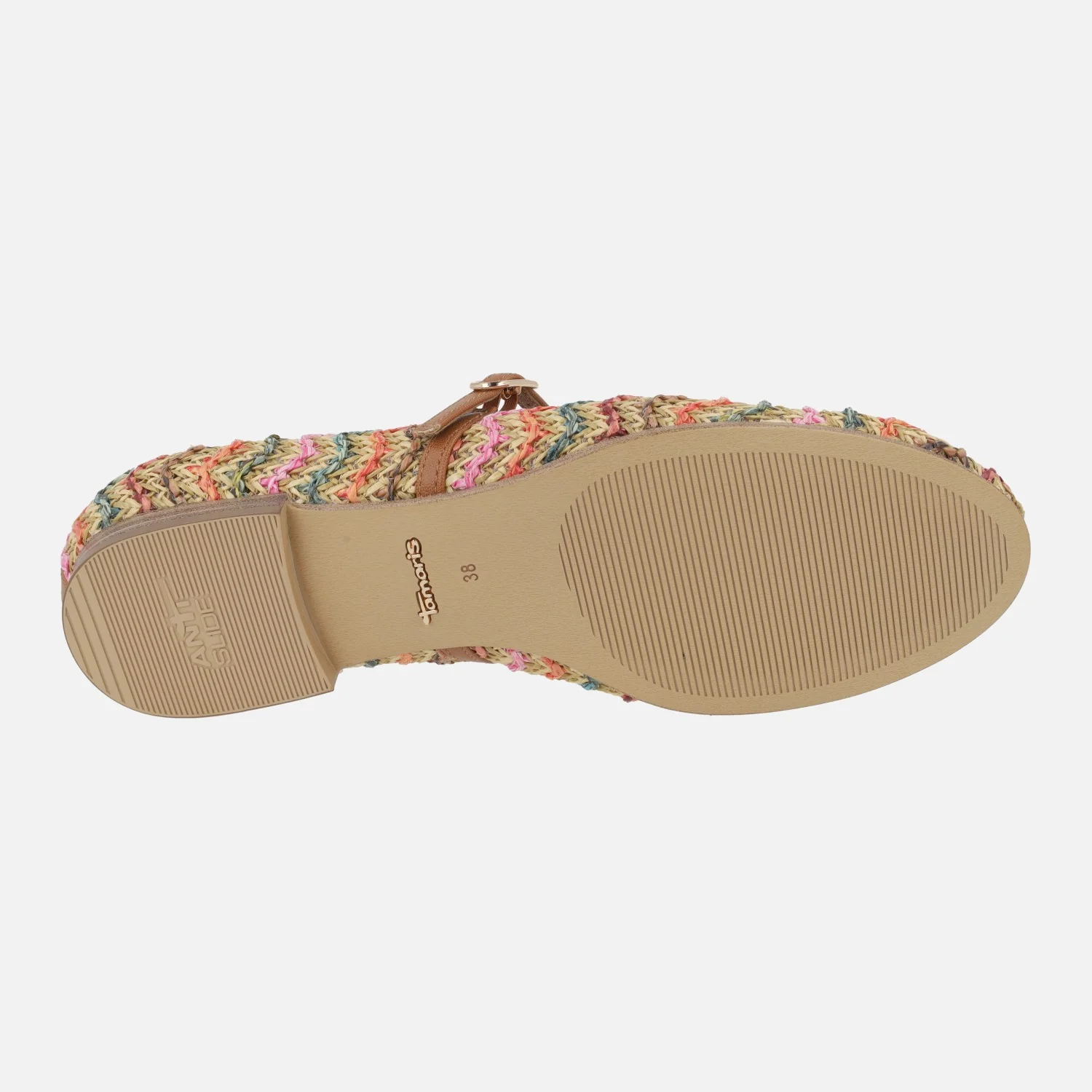 Bailarinas estilo merceditas de la marca Tamaris modelo 1-22146 Multicolor. Bailarinas con exterior en tejido y sintéticos, imitando rafia, en combinado multicolor. Pulsera al empeine con hebilla regulable. Interior en tejido y sintéticos, planta de piel. Piso plano, de apenas 1 cm de altura.