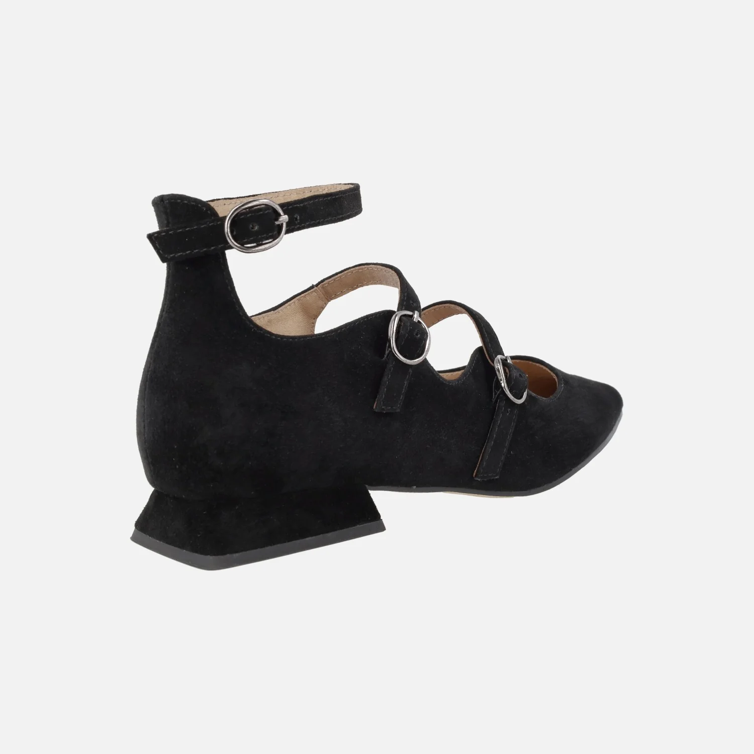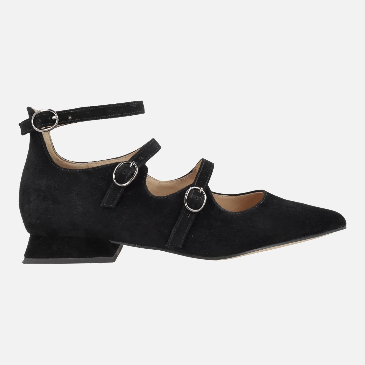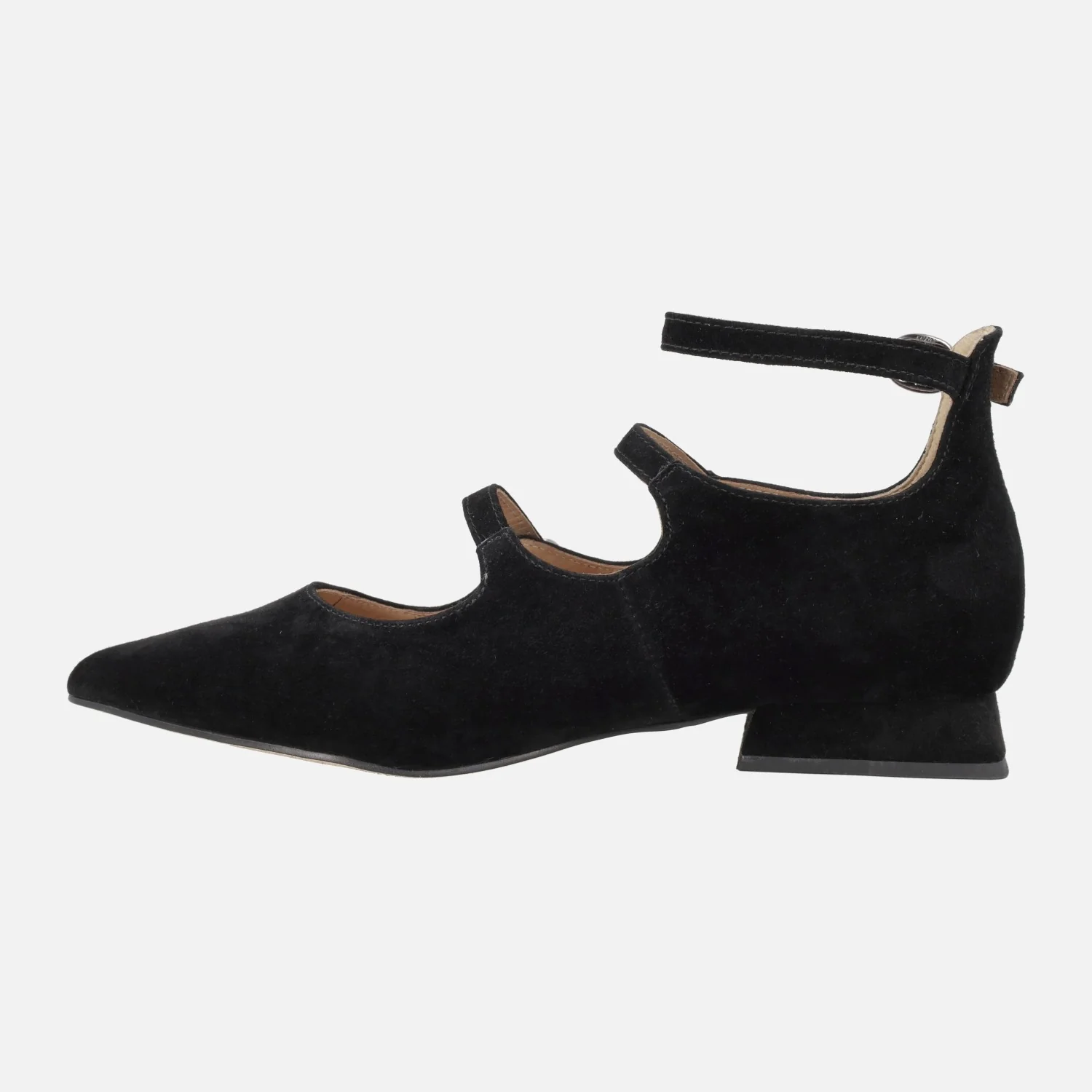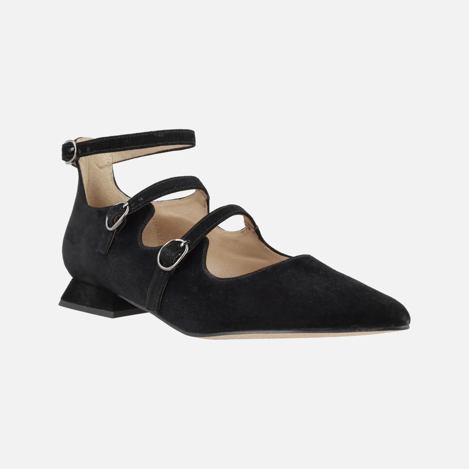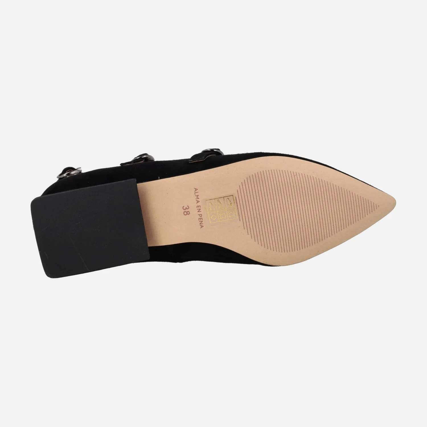 Bailarinas inspiración mary jane de la marca Alma en pena, modelo I240110 Black. Bailarinas negras de ante, con puntera afilada. Tienen dos tiras con hebilla cruzando el empeine así como una pulsera también con cierre de hebilla al tobillo. Interior y planta de piel. Piso sintético, con tacones de 2,5 cms de altura.