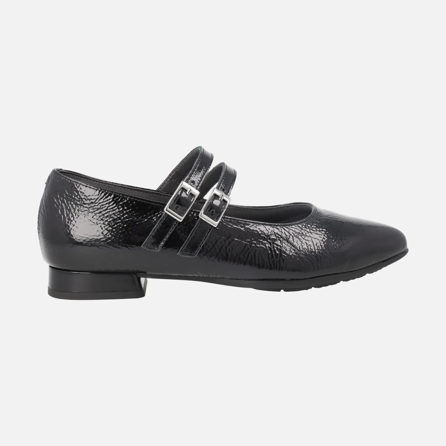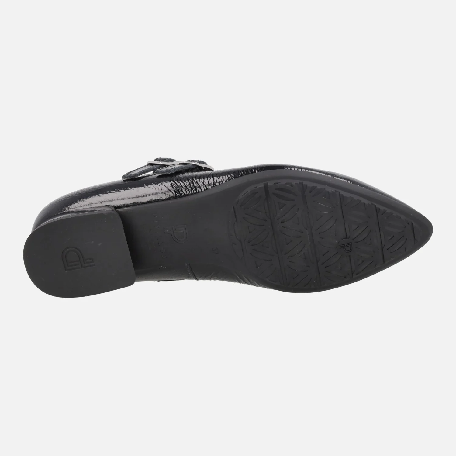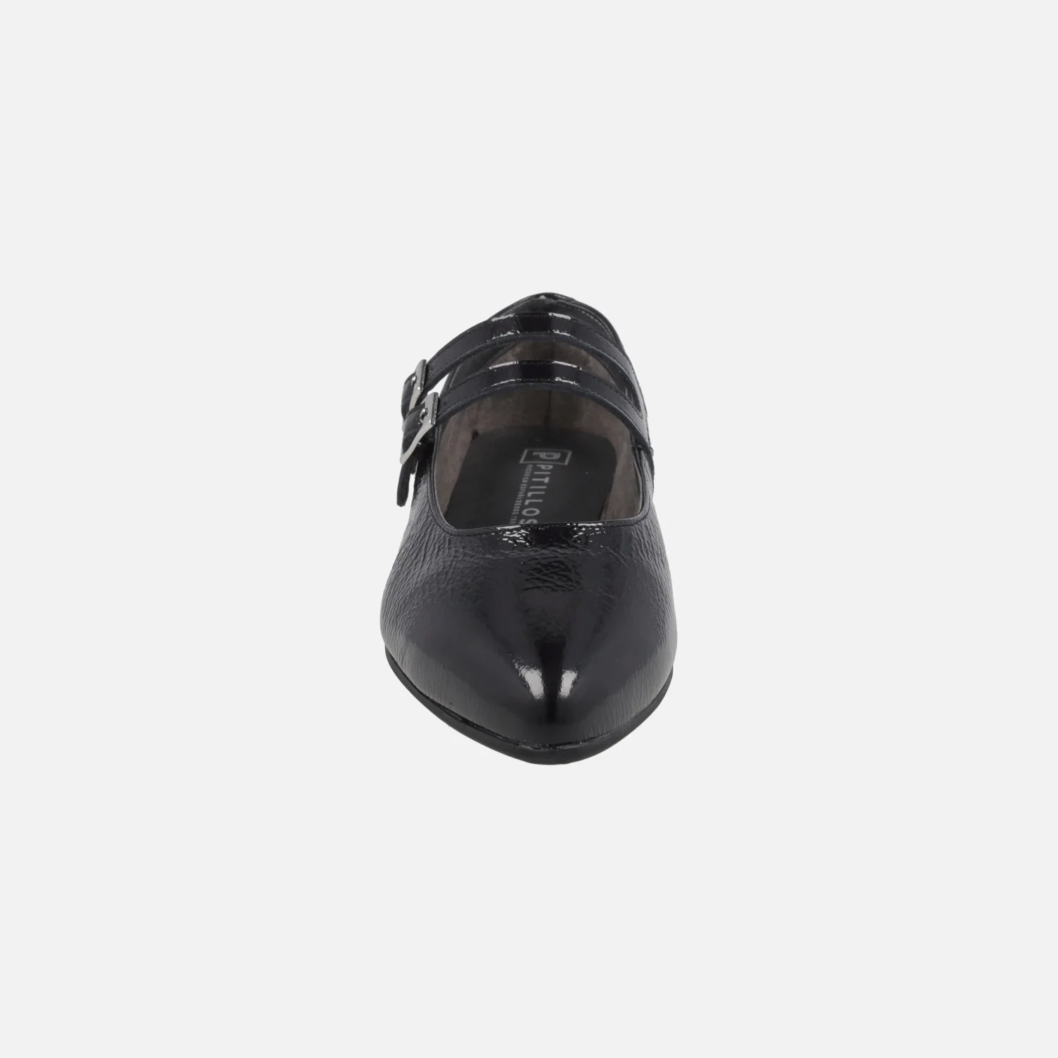 Bailarinas de charol negro marca Pitillos, modelo 10840 Negro. Bailarinas inspiración mercedes (mary jane) con dos pulseras que cruzan el empeine y cierran con hebilla. Exterior de piel, interior textil. Suela sintética con tacones de 2 cm.