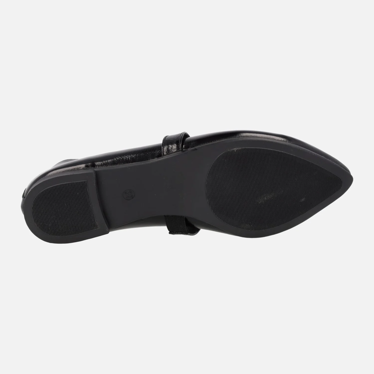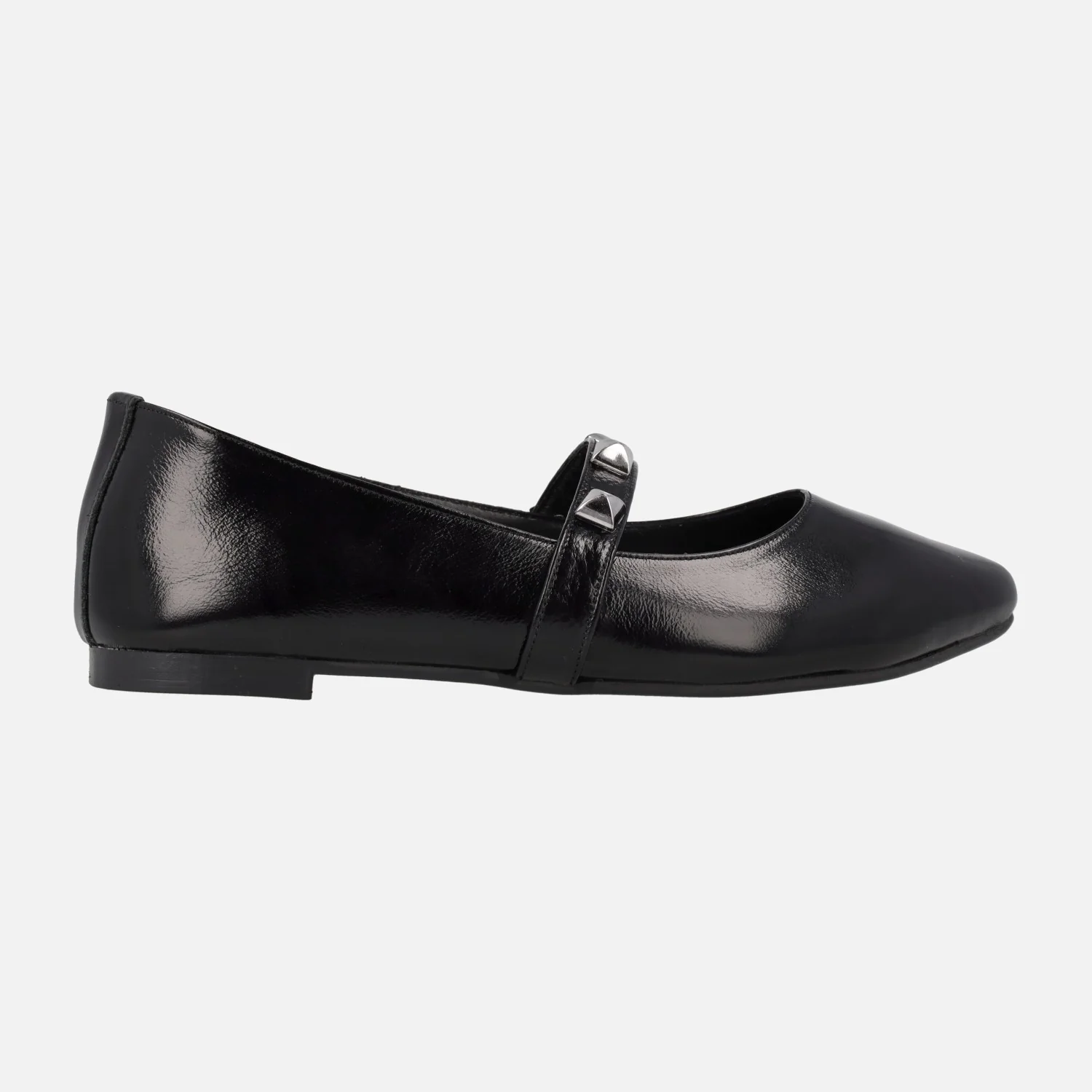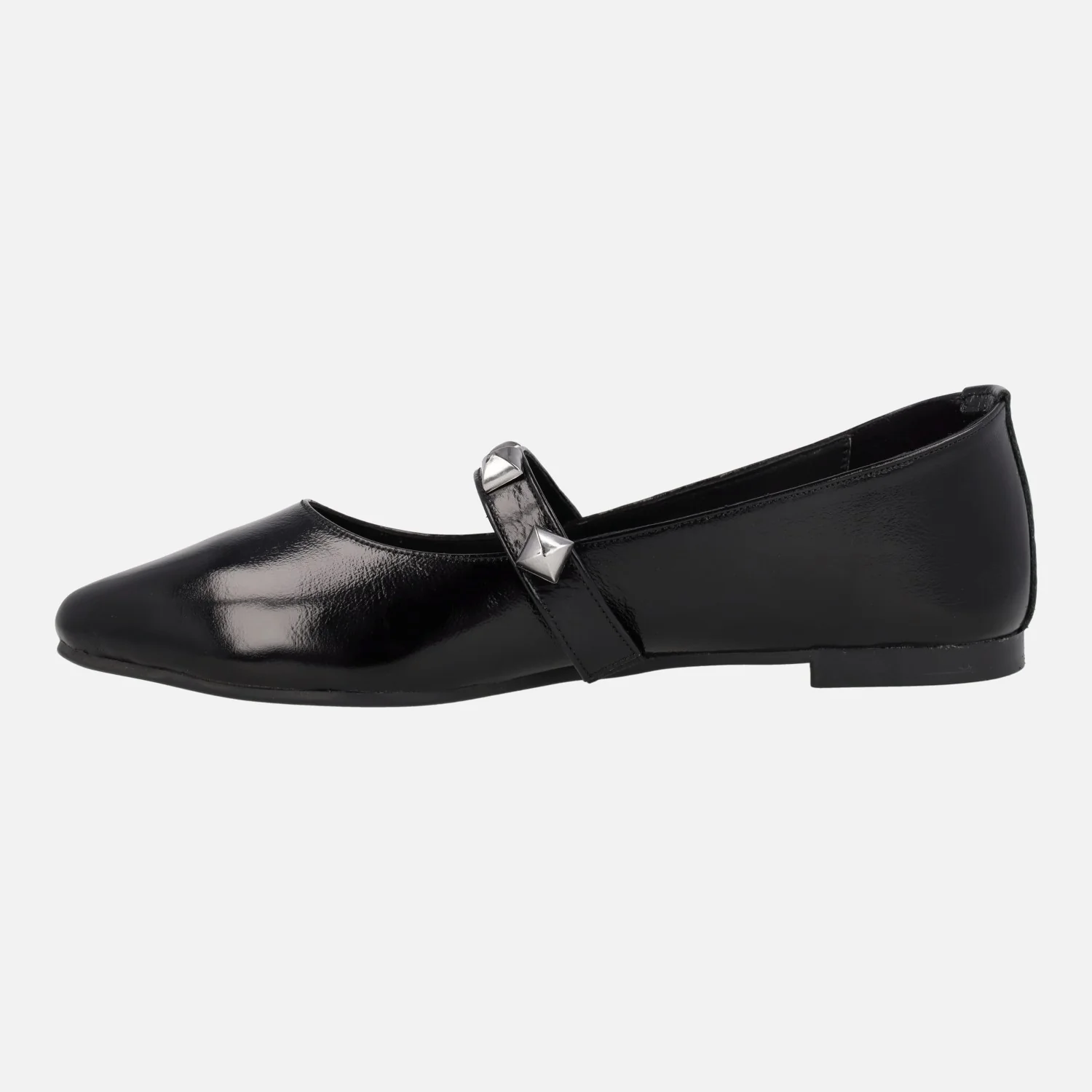 Bailarinas negras de charol para mujer de la marca española Top3 modelo 23656. Merceditas, con tira cruzando el empeine con detalle de tachas metálicas plateadas. Interior de piel. Piso fino de goma, con 1 cm de altura en la tapa.