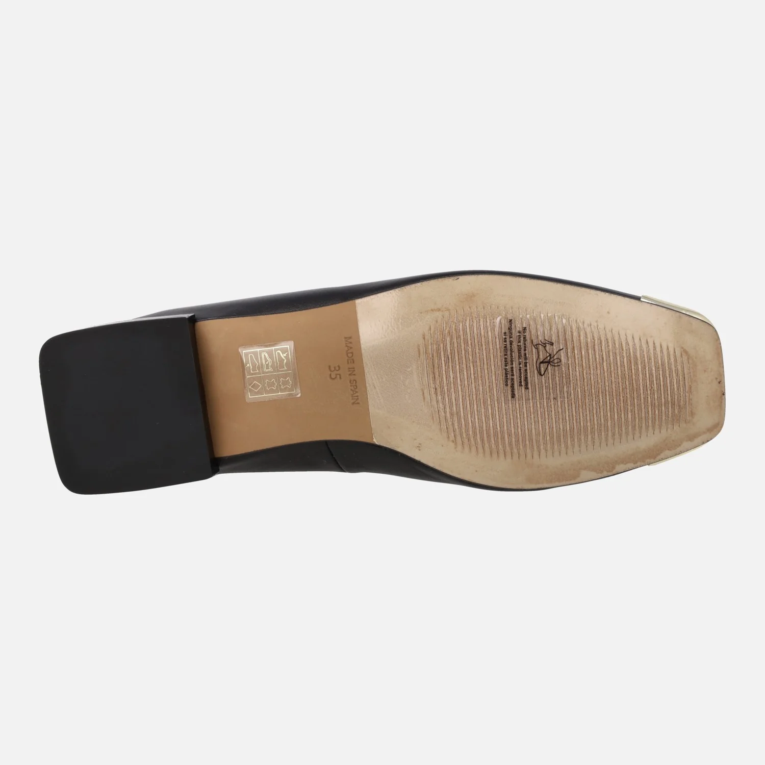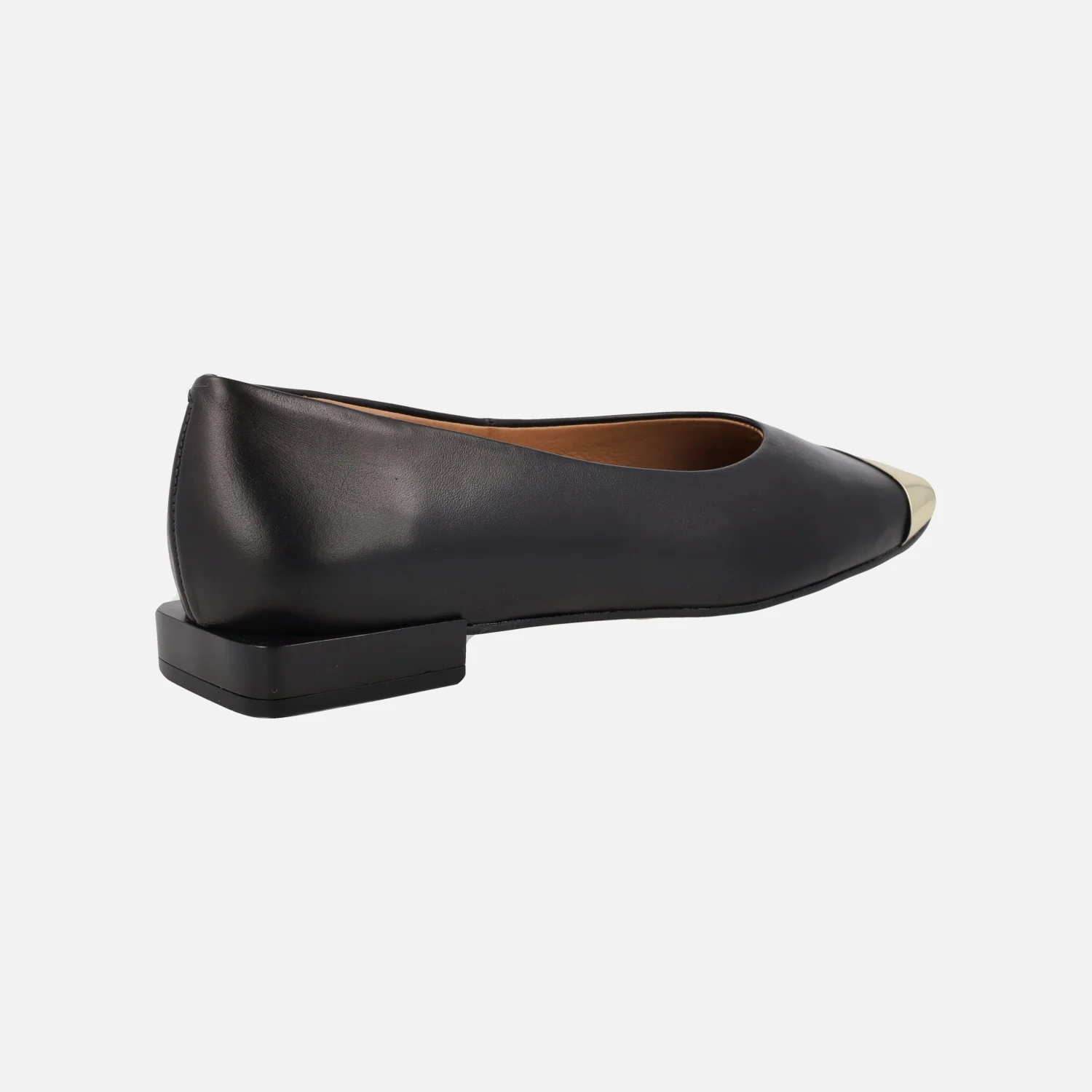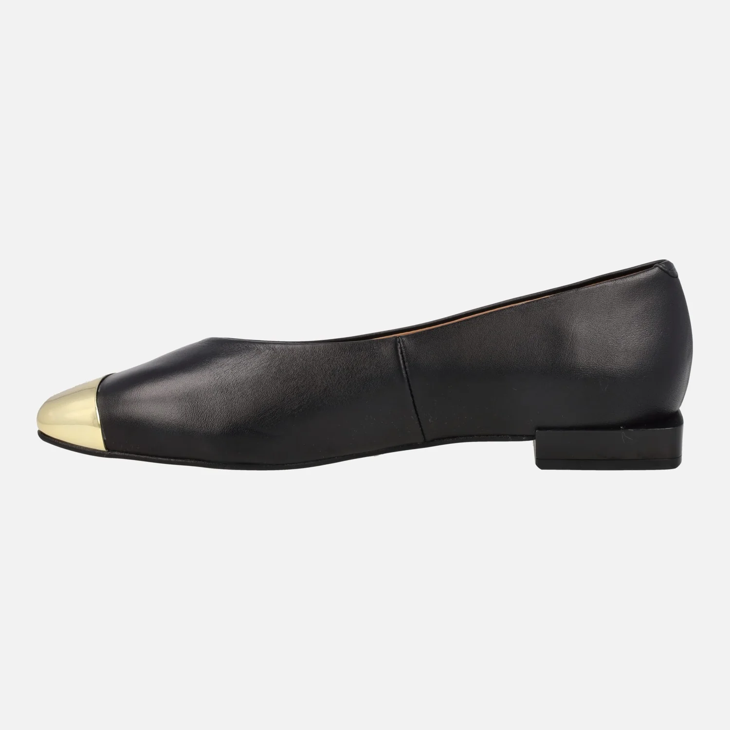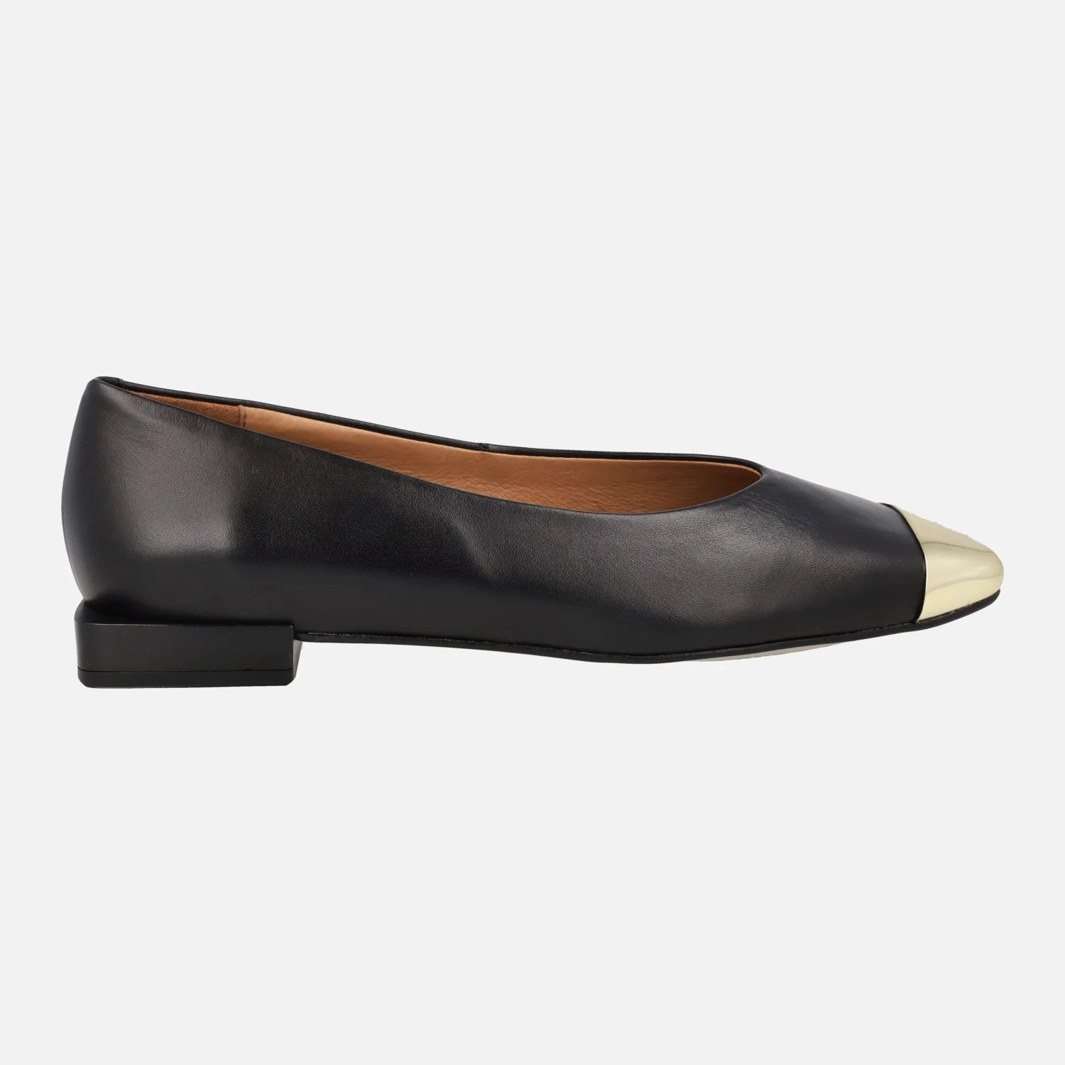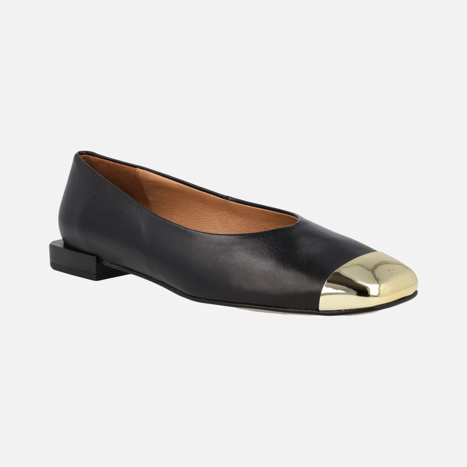 Bailarinas negras de piel de la marca Angel Alarcón, modelo 23512 Negro. Bailarinas elaboradas en piel negra, con puntera en metal oro y horma ligeramente cuadrada. Forro y planta de piel. Piso sintético con una altura de tacón de 2 cms. Made in Spain.