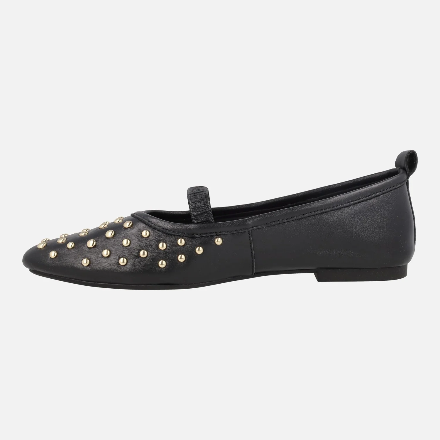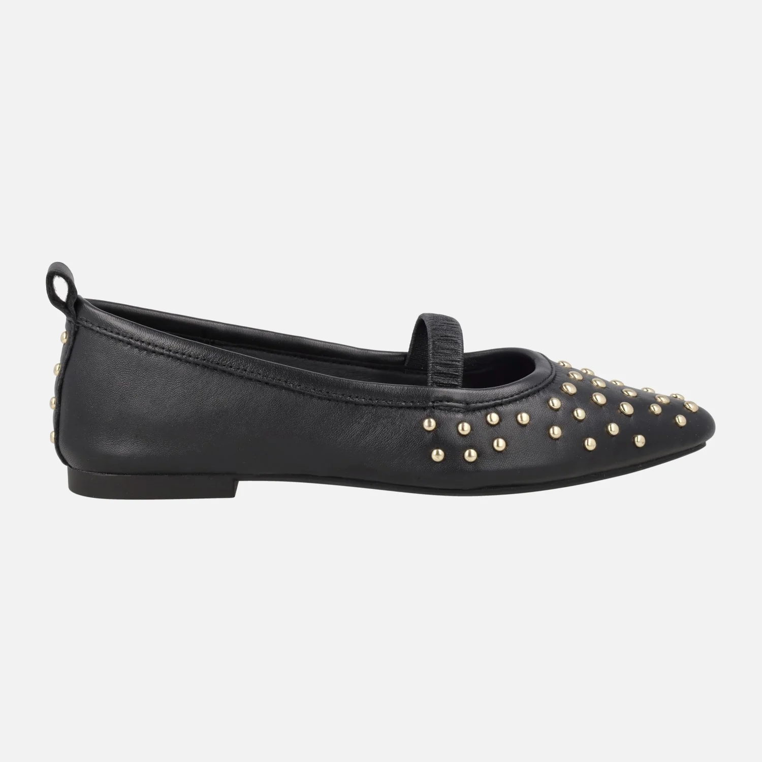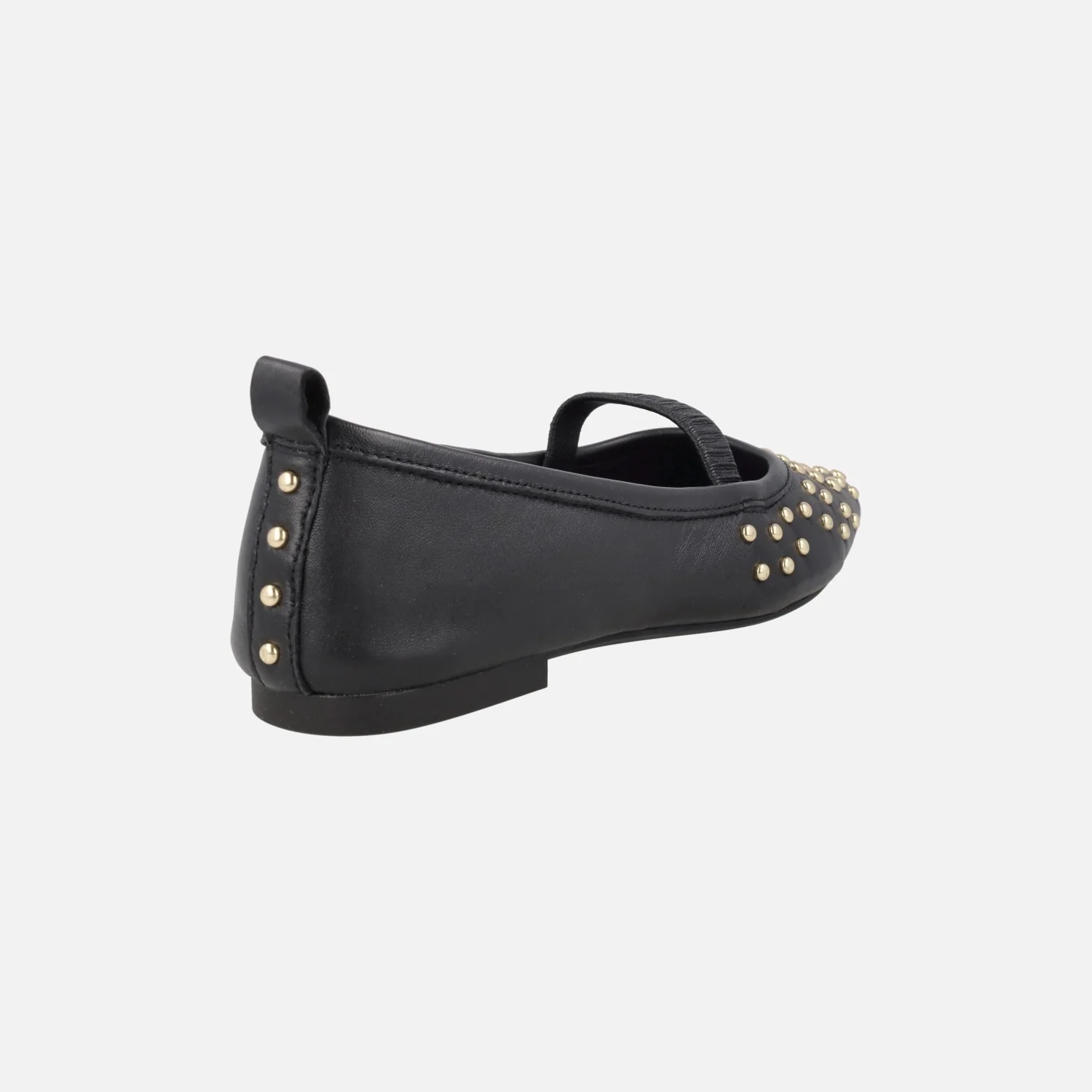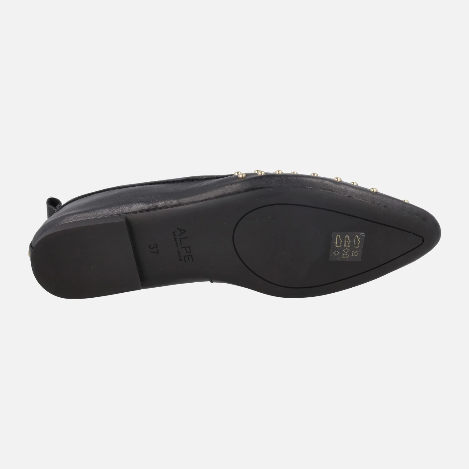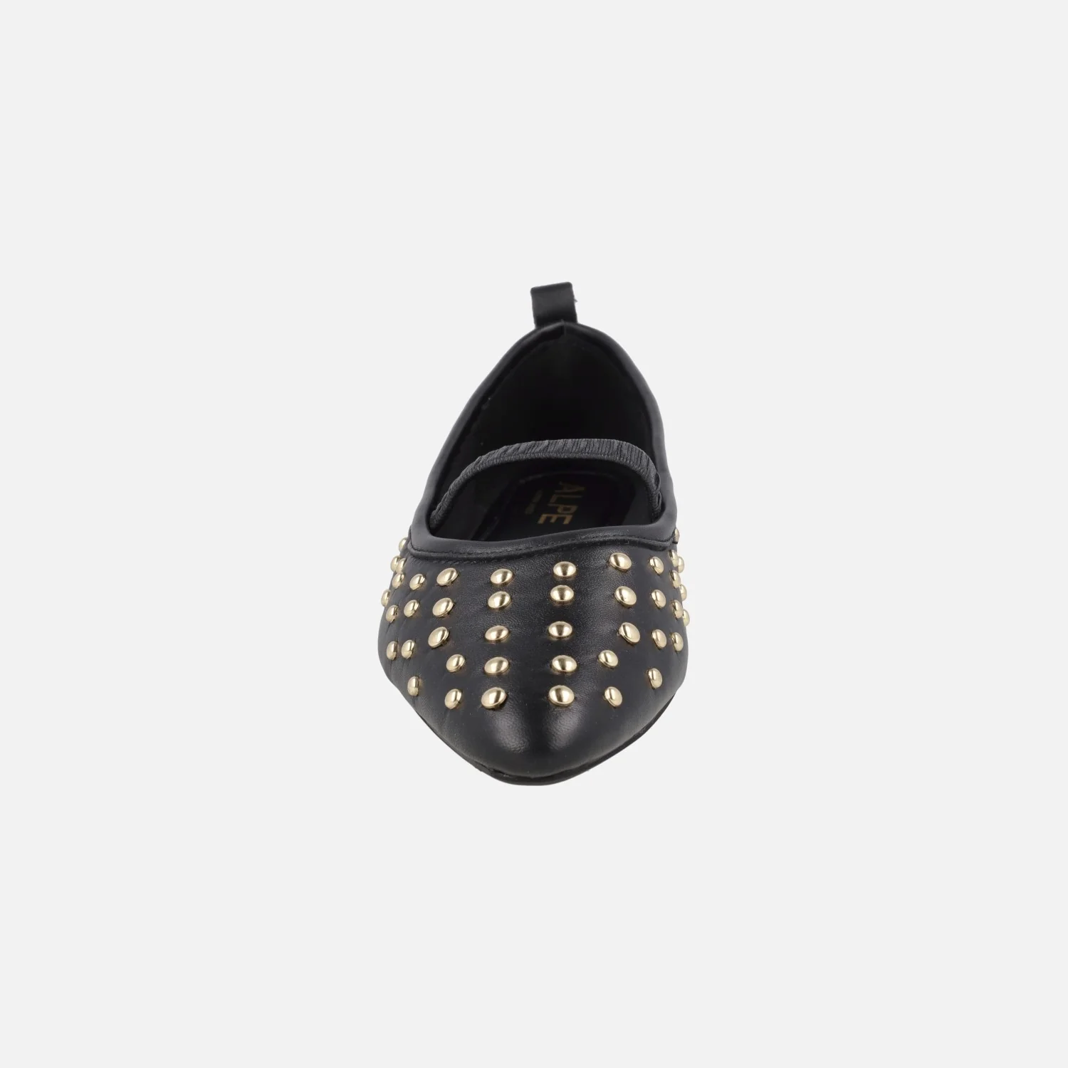 Bailarinas negras de piel de la marca Alpe, modelo Paris 5556 en napa negro. Bailarinas estilo merceditas (mary jane) gracias a su tira elástica que cruza el empeine. Elaboradas en piel negra con detalle de tachas metálicas doradas en la puntera y talón. Planta de piel, forro sintético. Piso plano, apenas 1 cm.