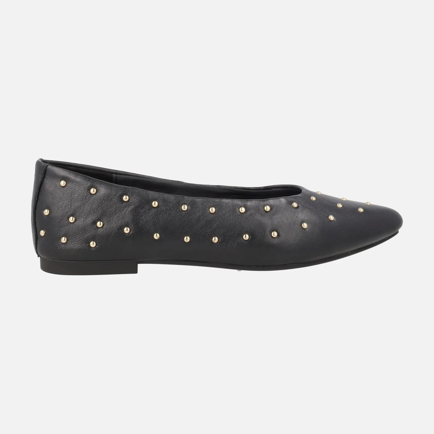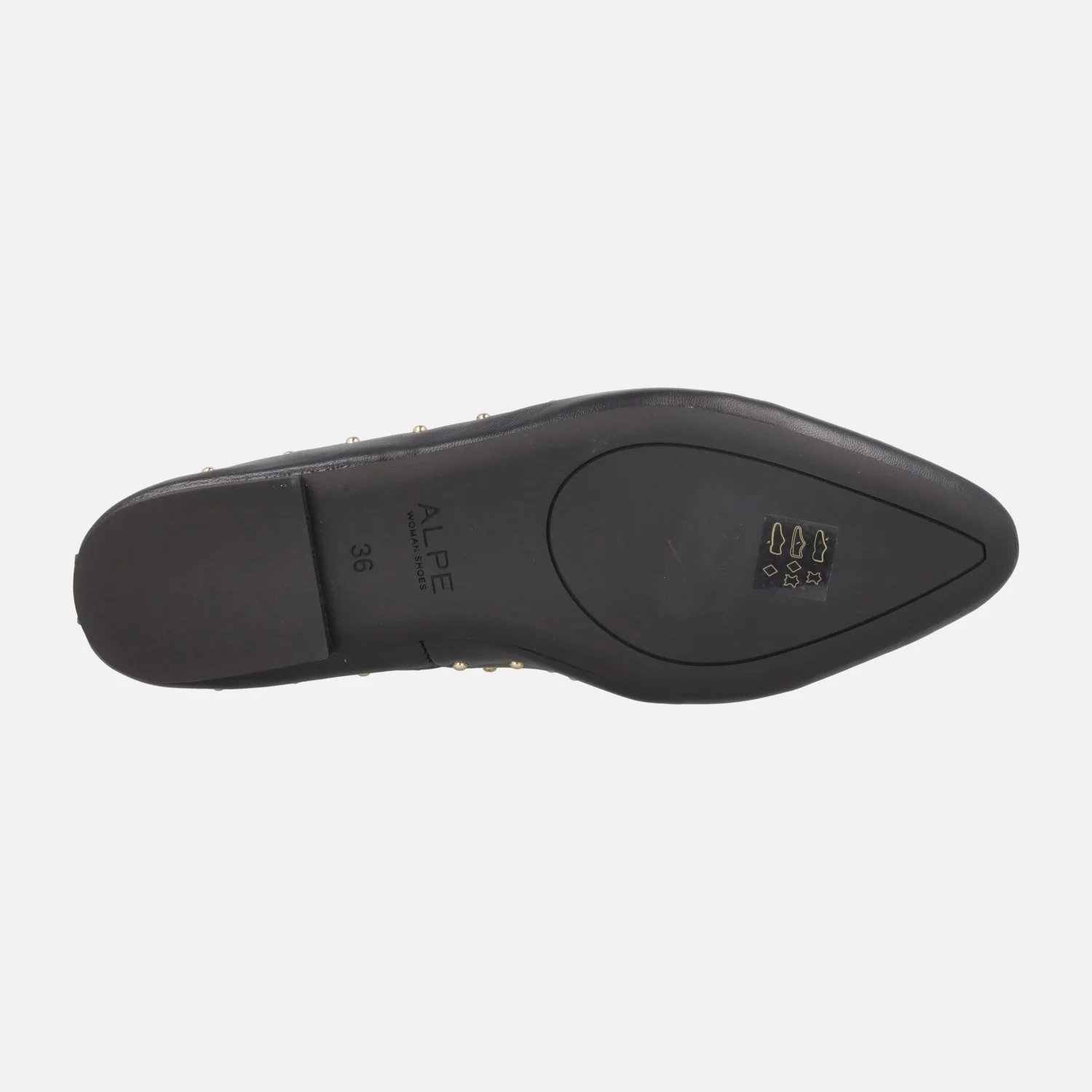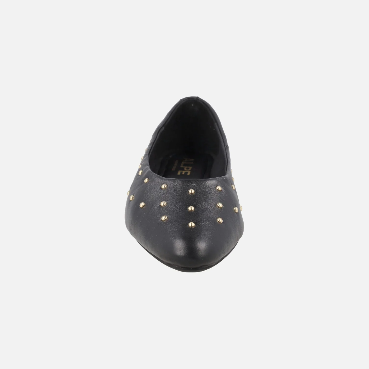 Bailarinas planas de piel napa negra marca Alpe, modelo Paris 5558. Bailarinas elaboradas en piel negra y cubiertas de tachas metálicas en color oro. Planta de piel, forro sintético. Suela plana de goma, de apenas 1 cm.