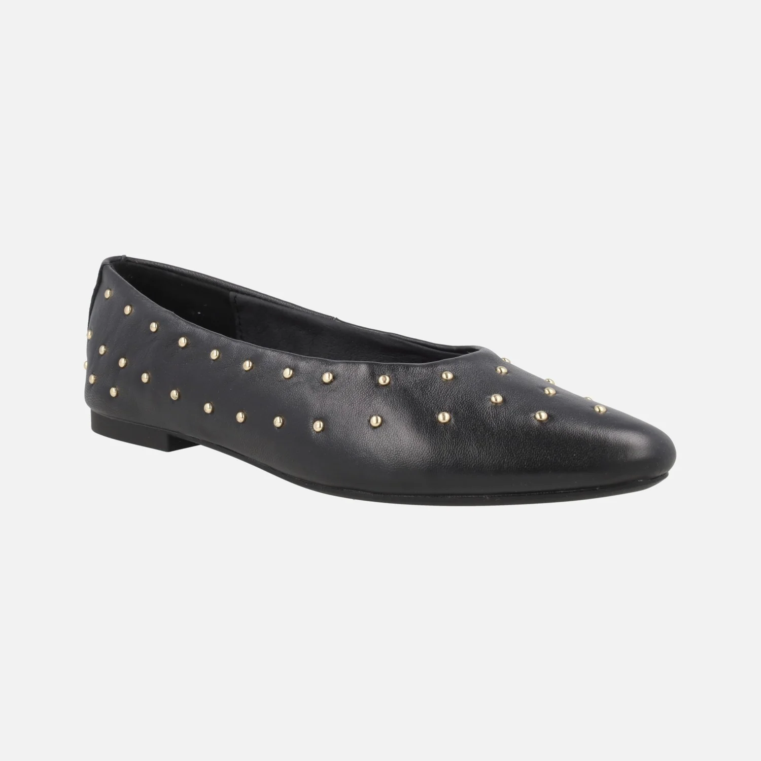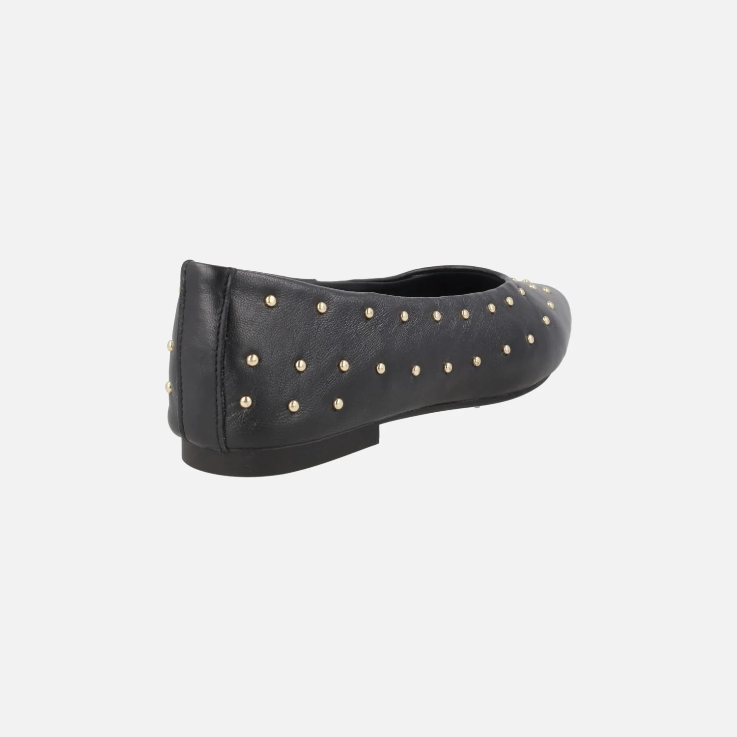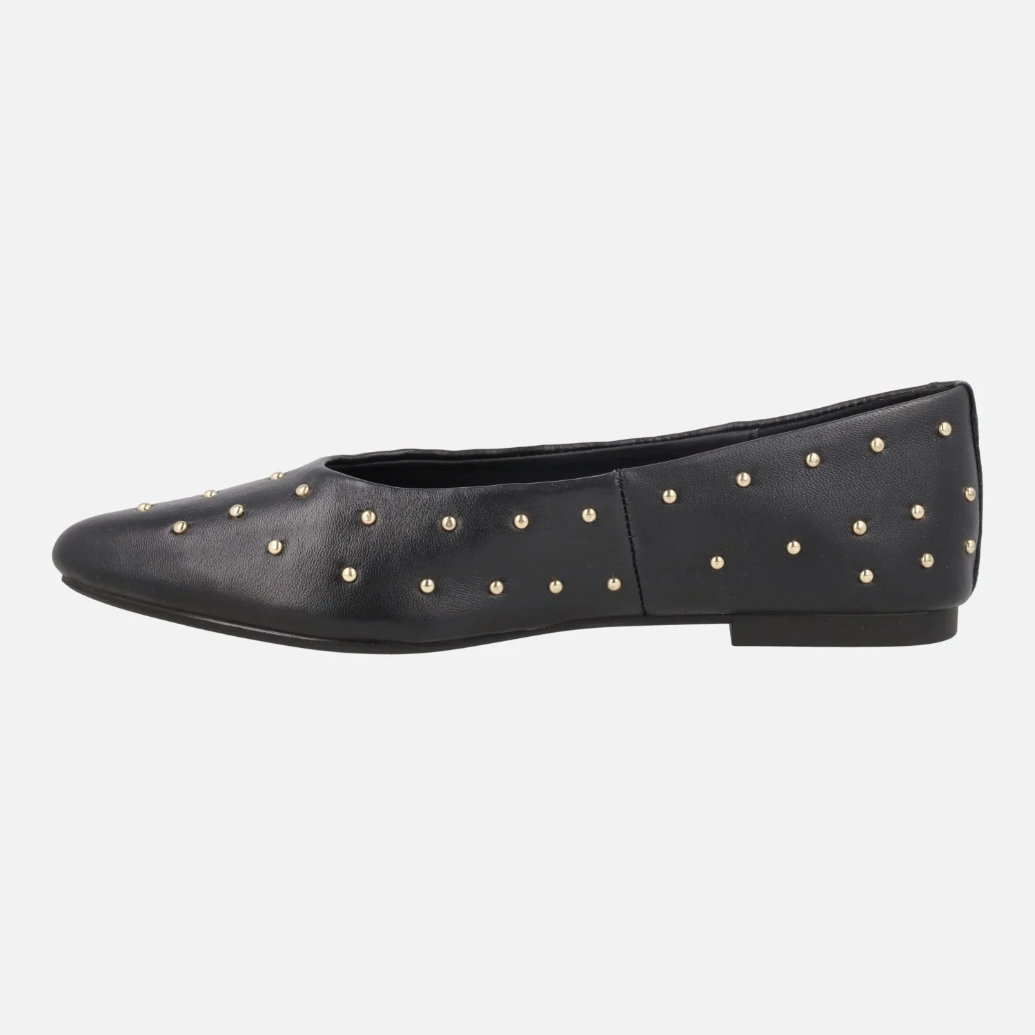 Bailarinas planas de piel napa negra marca Alpe, modelo Paris 5558. Bailarinas elaboradas en piel negra y cubiertas de tachas metálicas en color oro. Planta de piel, forro sintético. Suela plana de goma, de apenas 1 cm.