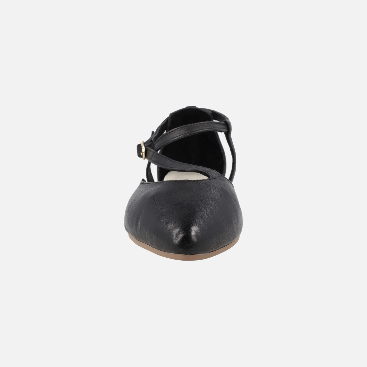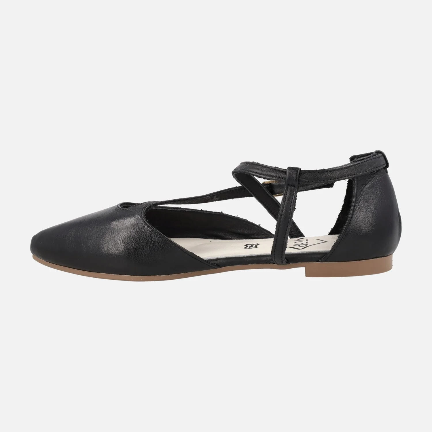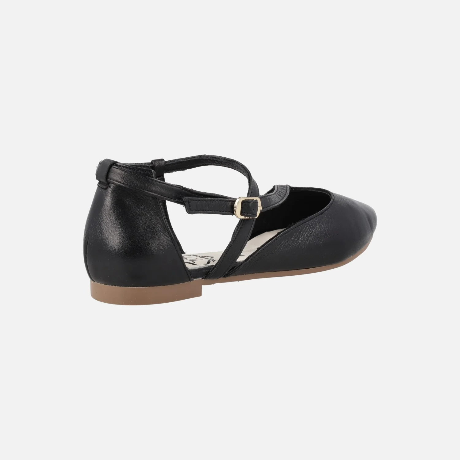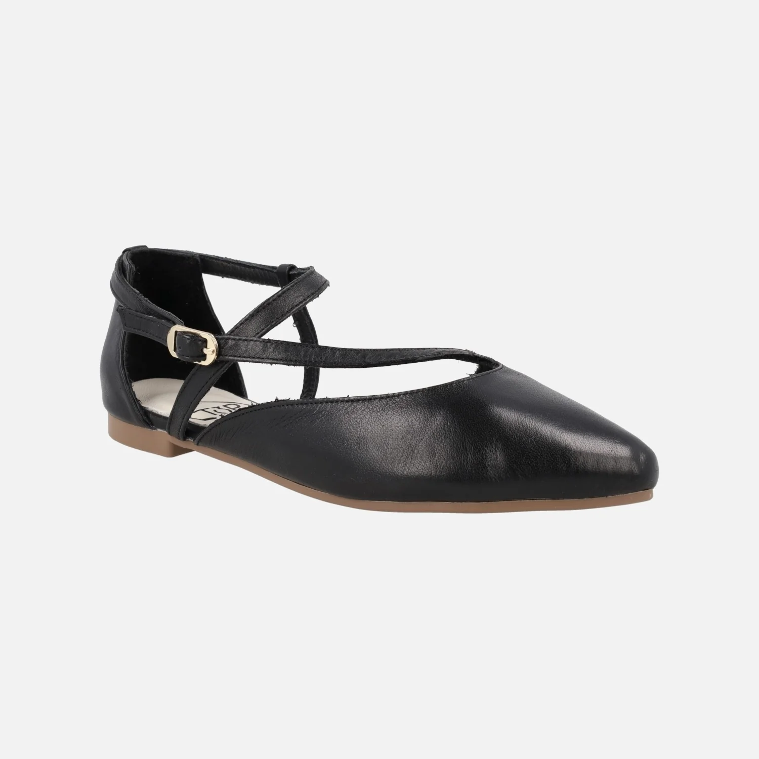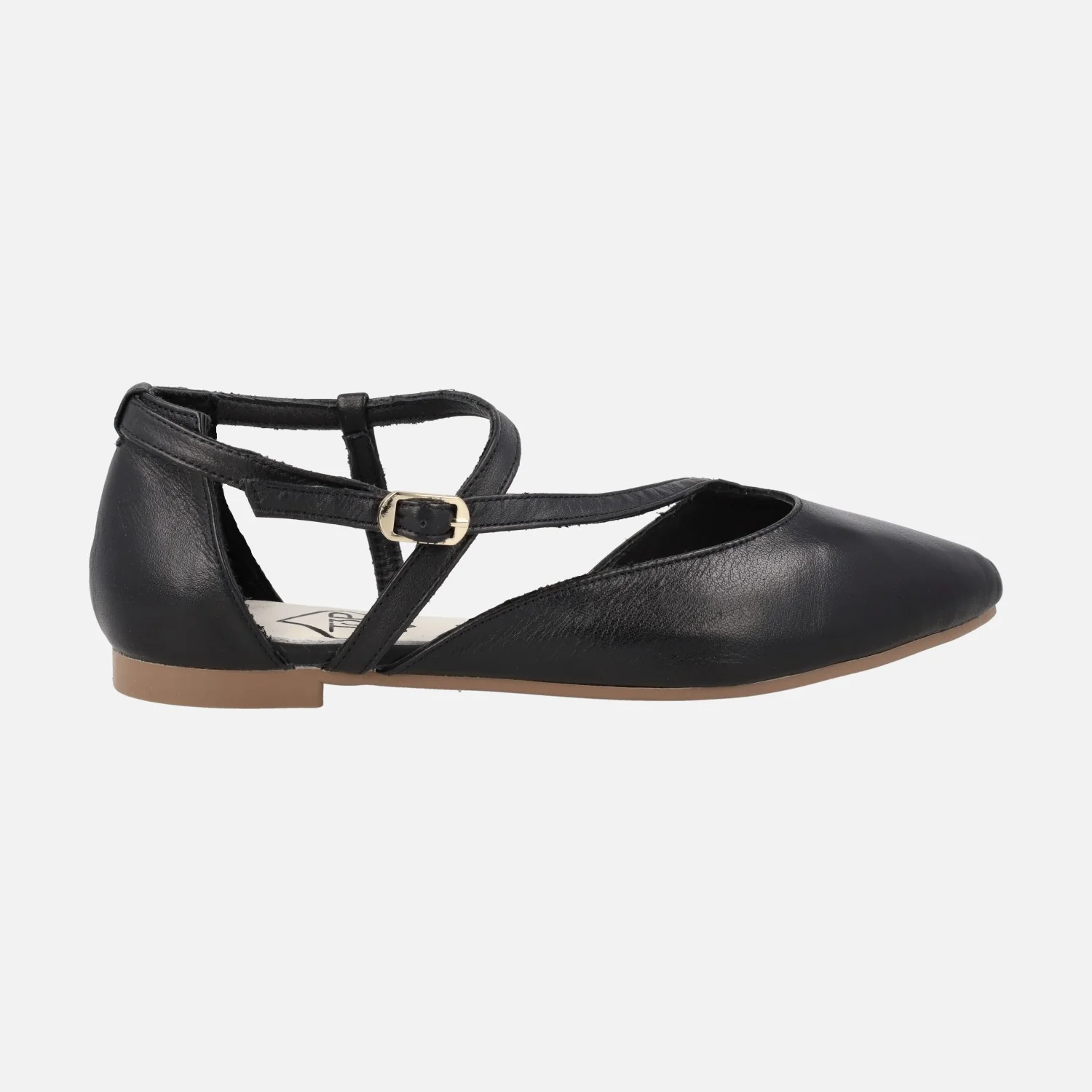 Bailarinas planas de la marca TOP3 modelo 25338, disponibles en negro, crema (beige) y oro. Bailarinas de piel con tiras asimétricas que cruzan el empeine y cierran con hebilla al tobillo. Interiores forrados de piel. Suela plana, sintética, de 1,5 cms de altura.