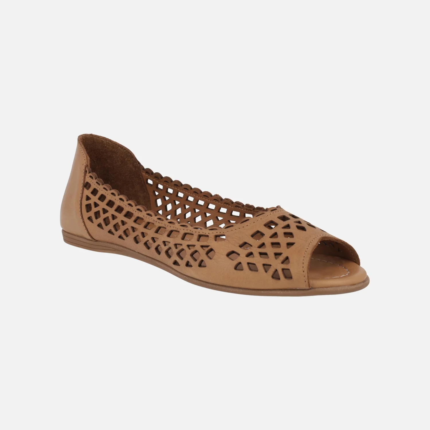 Bailarinas de piel para mujer de la marca TOP3 modelo SR24497, disponibles en negro, cuero y oro. Bailarinas de piel con dibujos troquelados y abiertas de puntera. Forro y planta de piel. Piso plano, sintético, de apenas 1,5 cms de altura.