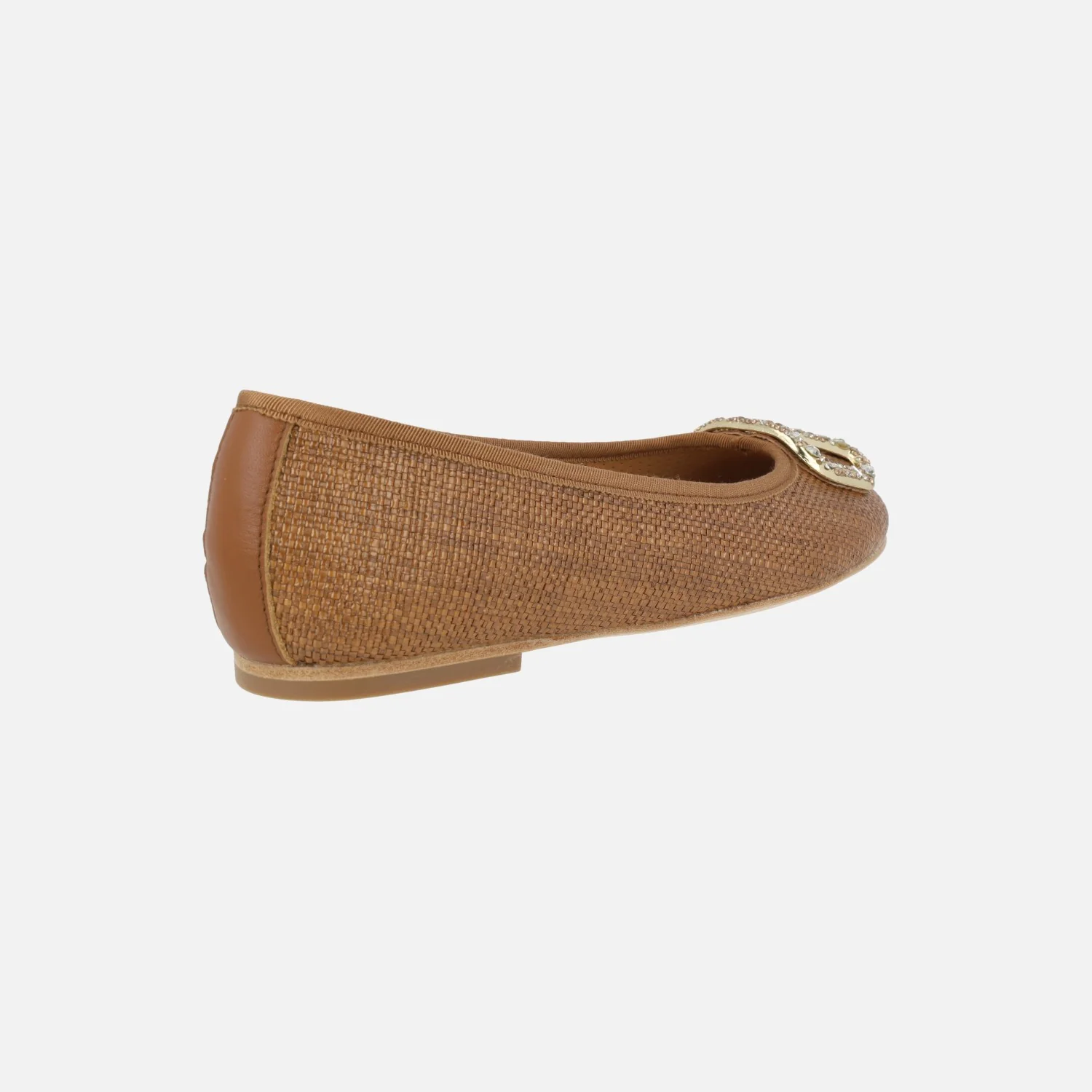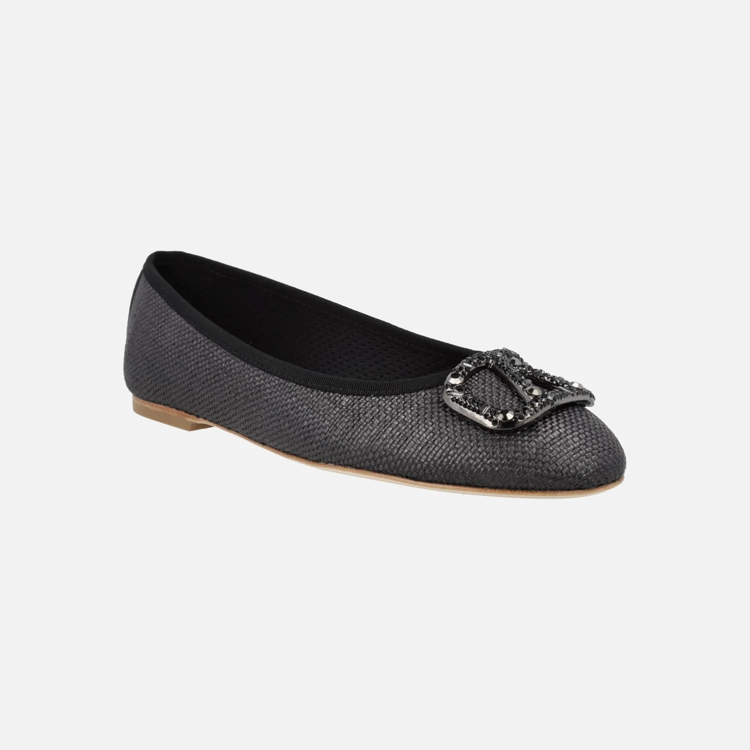 Bailarinas planas marca Alpe, modelo Liss 5417, disponibles en negro y en cuero. Bailarinas planas en tejido imitando rafia, con adorno metálico con pedrería en la puntera. Interior textil. Suela de cuero.