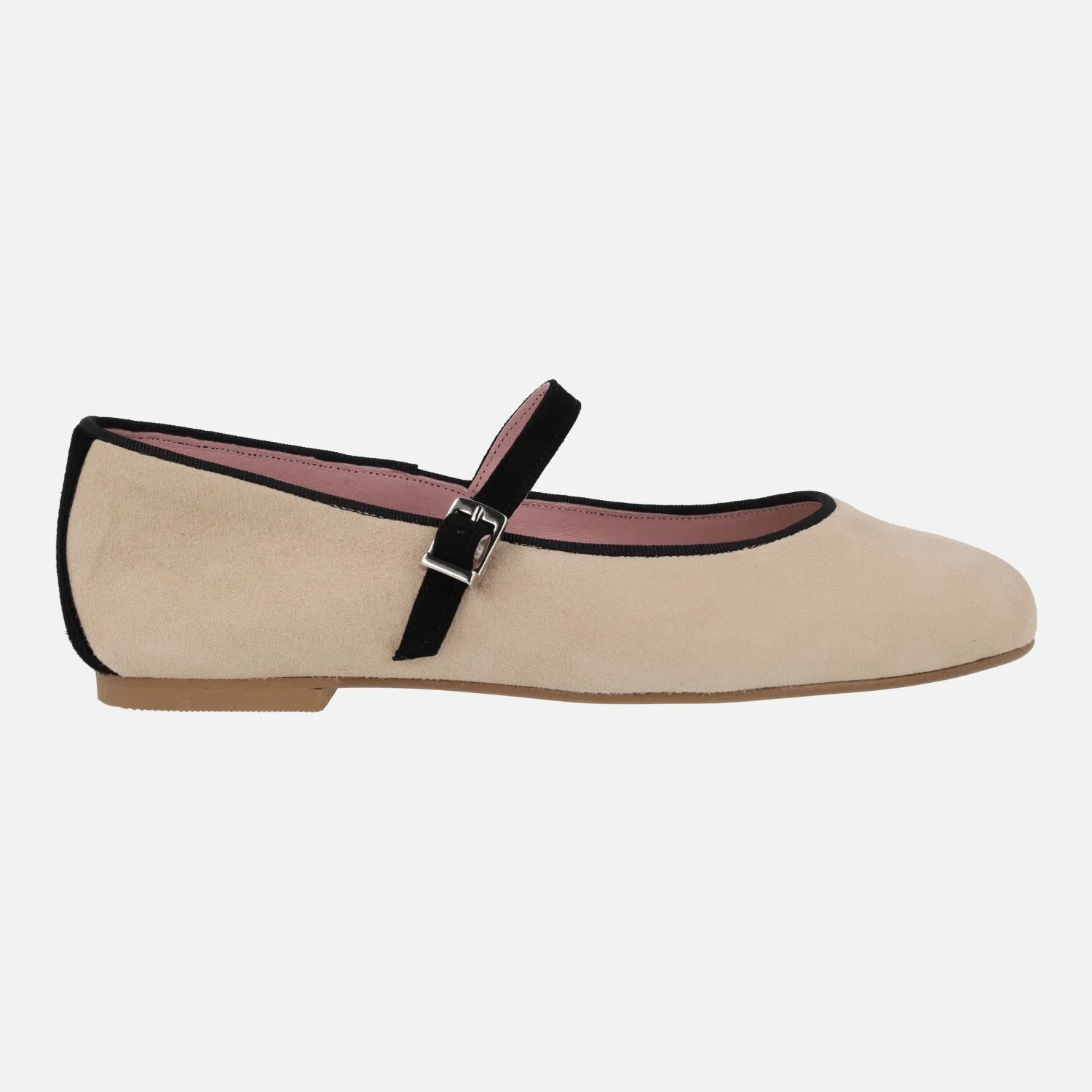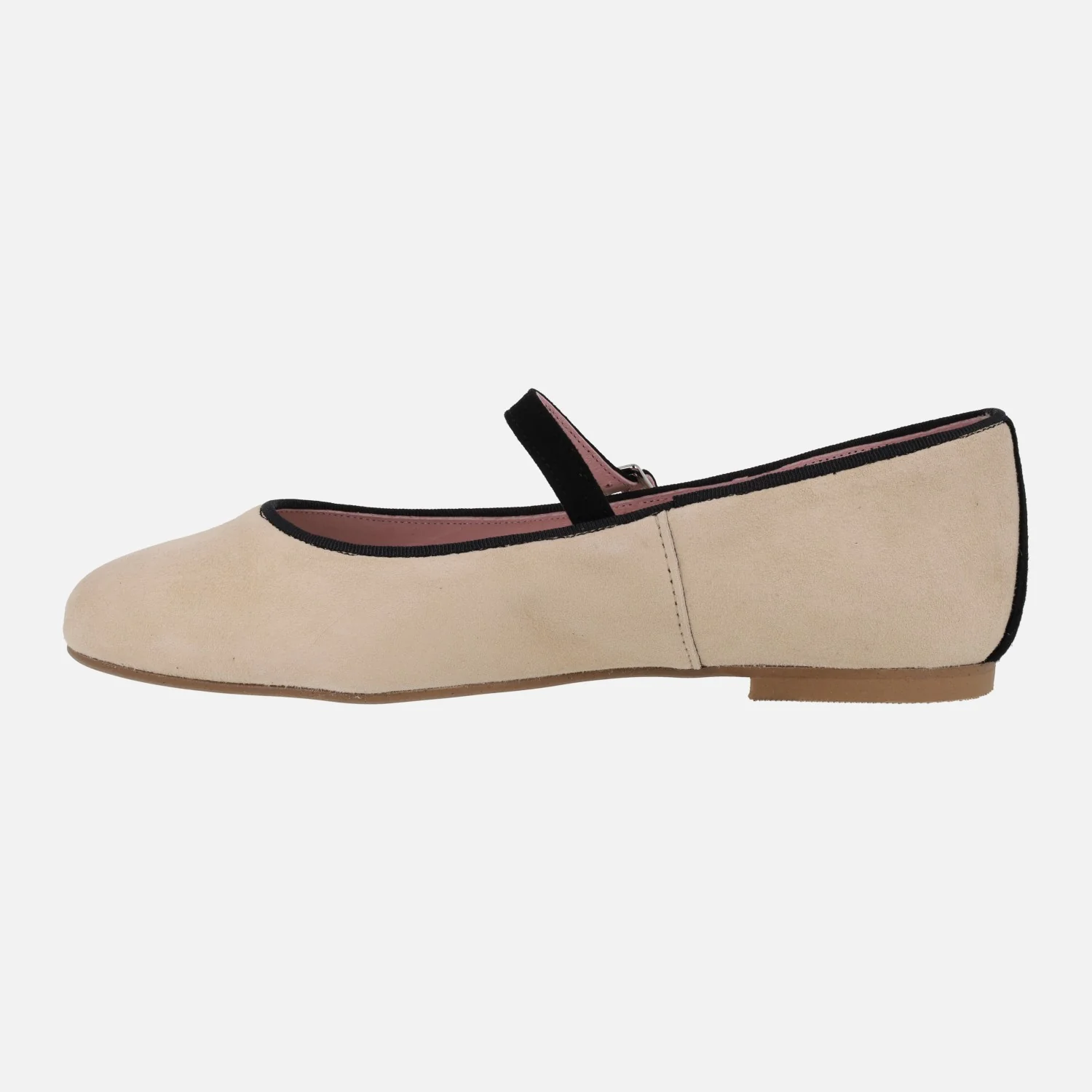 Bailarinas planas tipo Merceditas , modelo Eloin, de la marca Euforia. Están fabricadas en ante Beige, con vivo, pulsera y talón en color Negro. La pulsera en el empeine lleva cierre con hebilla metálica. El forro y las plantillas son de piel. El piso es de suela sintética con tacón plano.