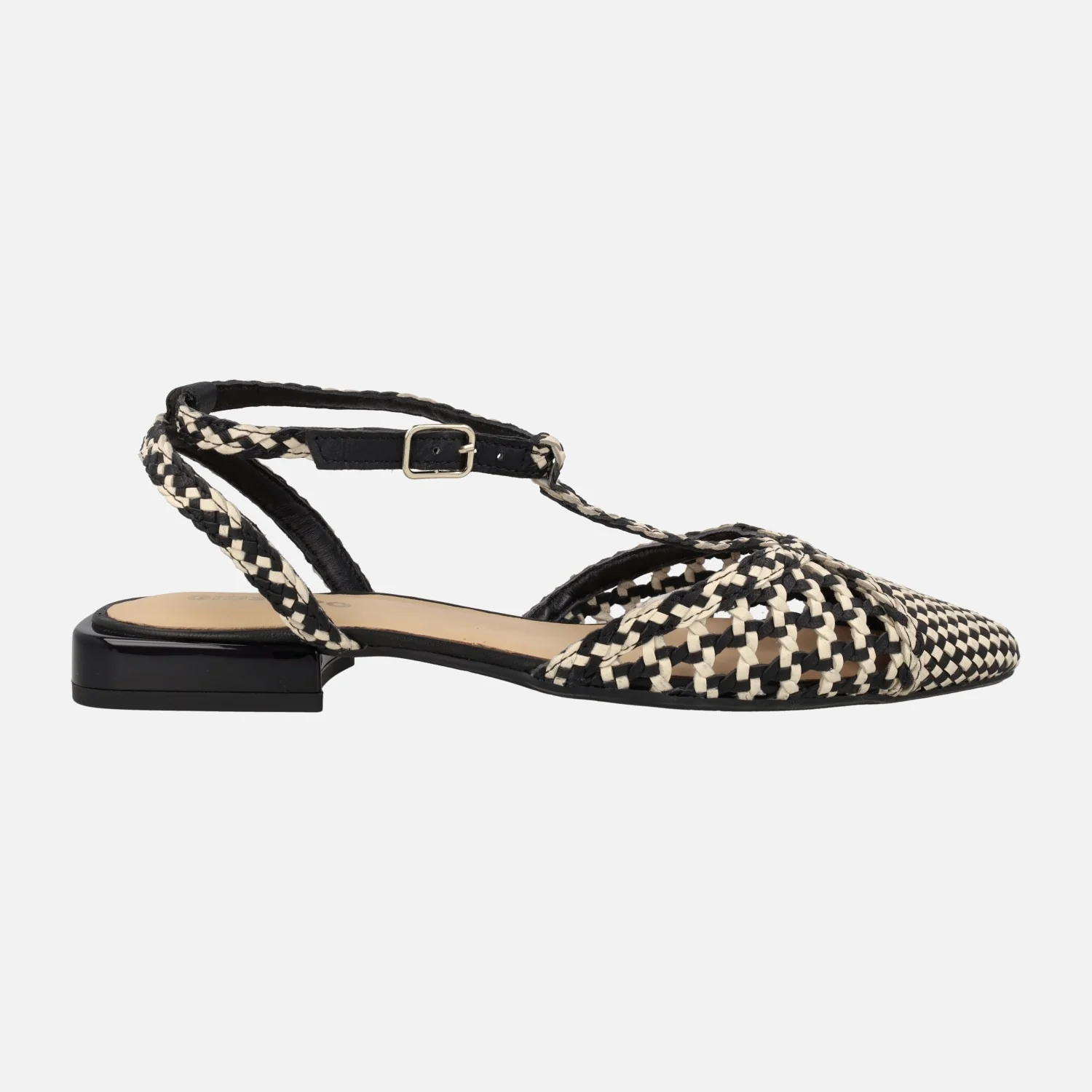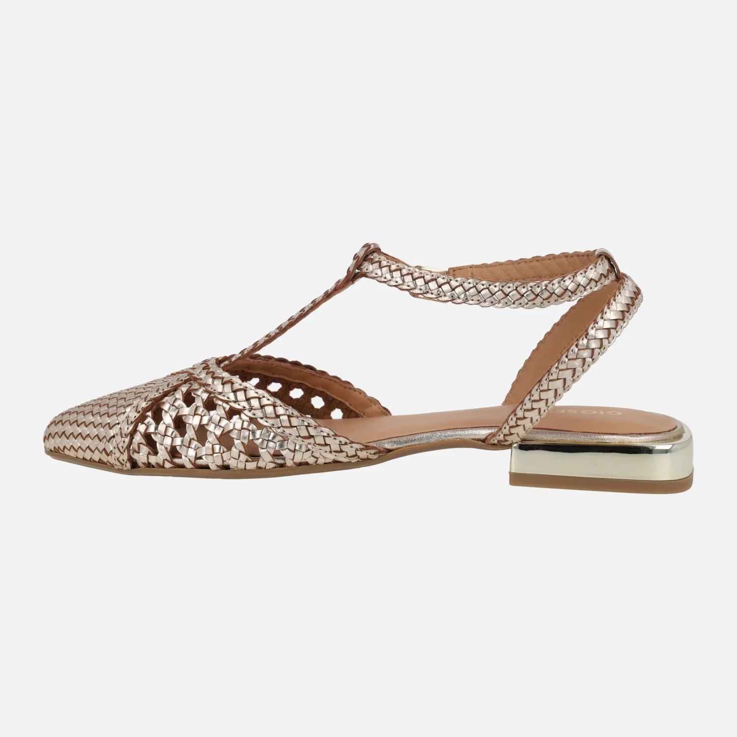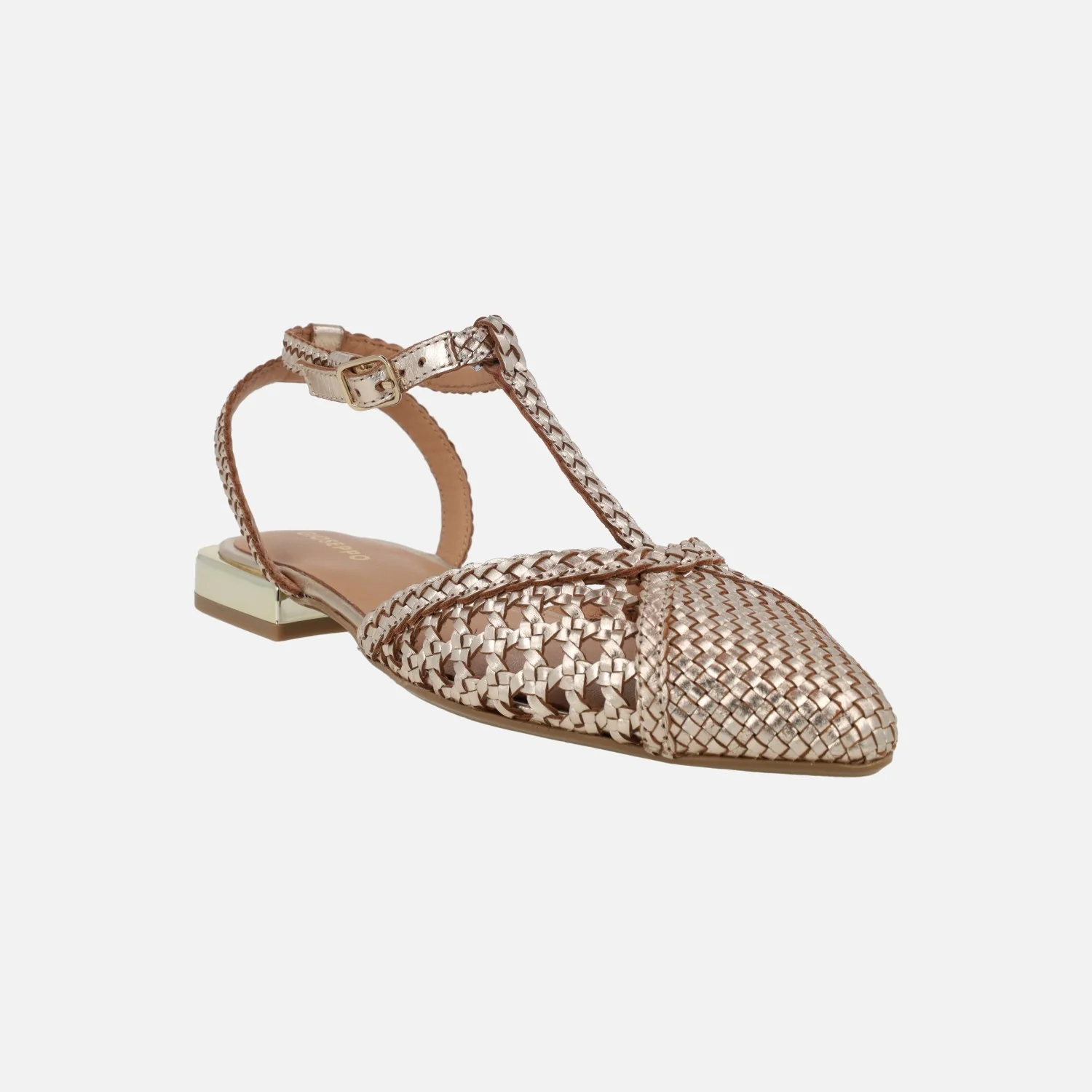 Preciosas bailarinas modelo Jhelum de la marca Gioseppo, 79237 disponibles en platinum (oro) y en black (negro con beige). Bailarinas trenzadas de piel, con puntera ligeramente afilada. Llevan una tira perpendicular al empeine y cierran al tobillo con una pulsera de hebilla ajustable. Forro y planta de piel. Suela sintética (TPR) con una altura de tacón de apenas 2 cm de altura.