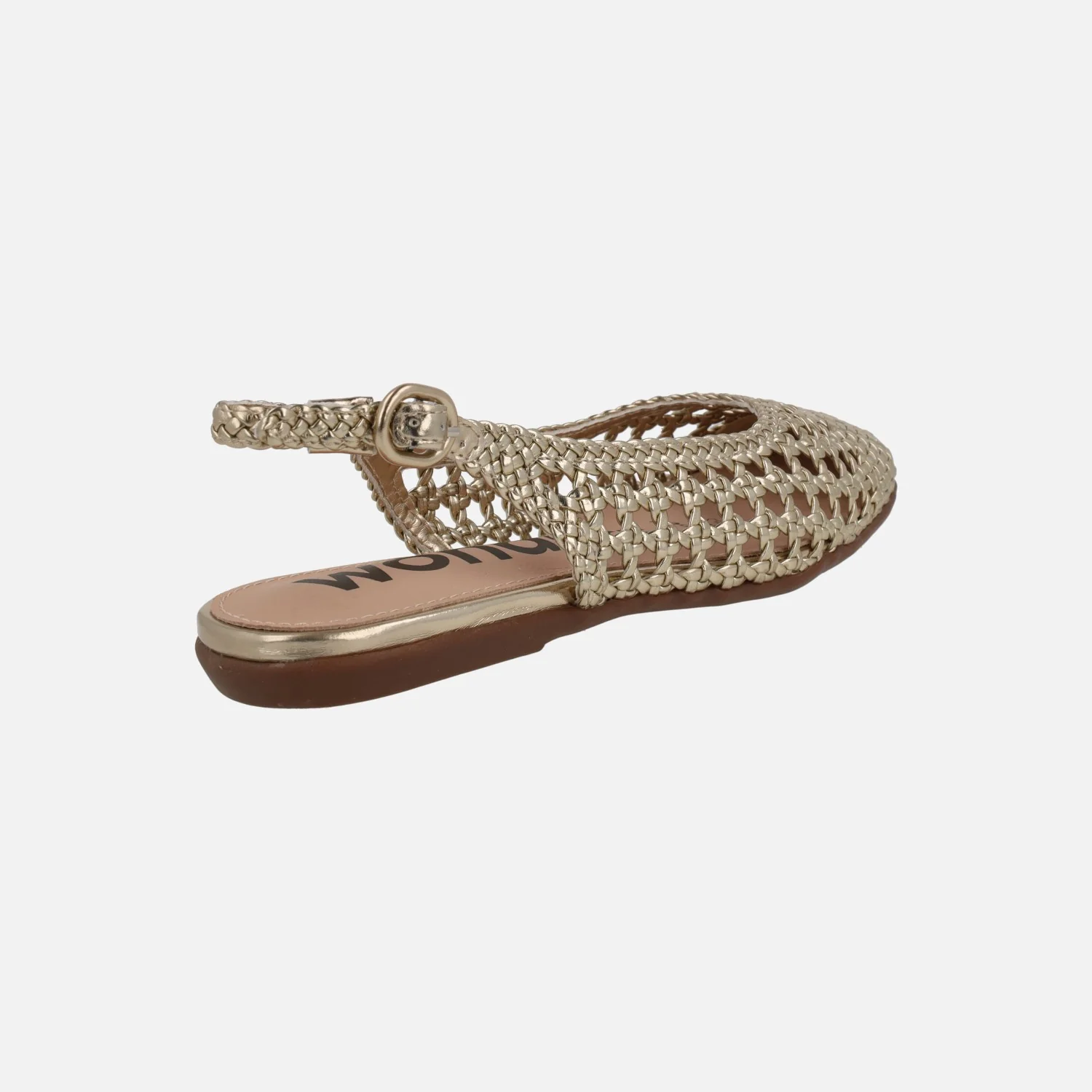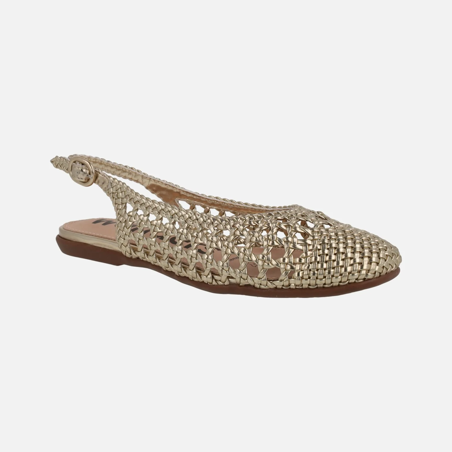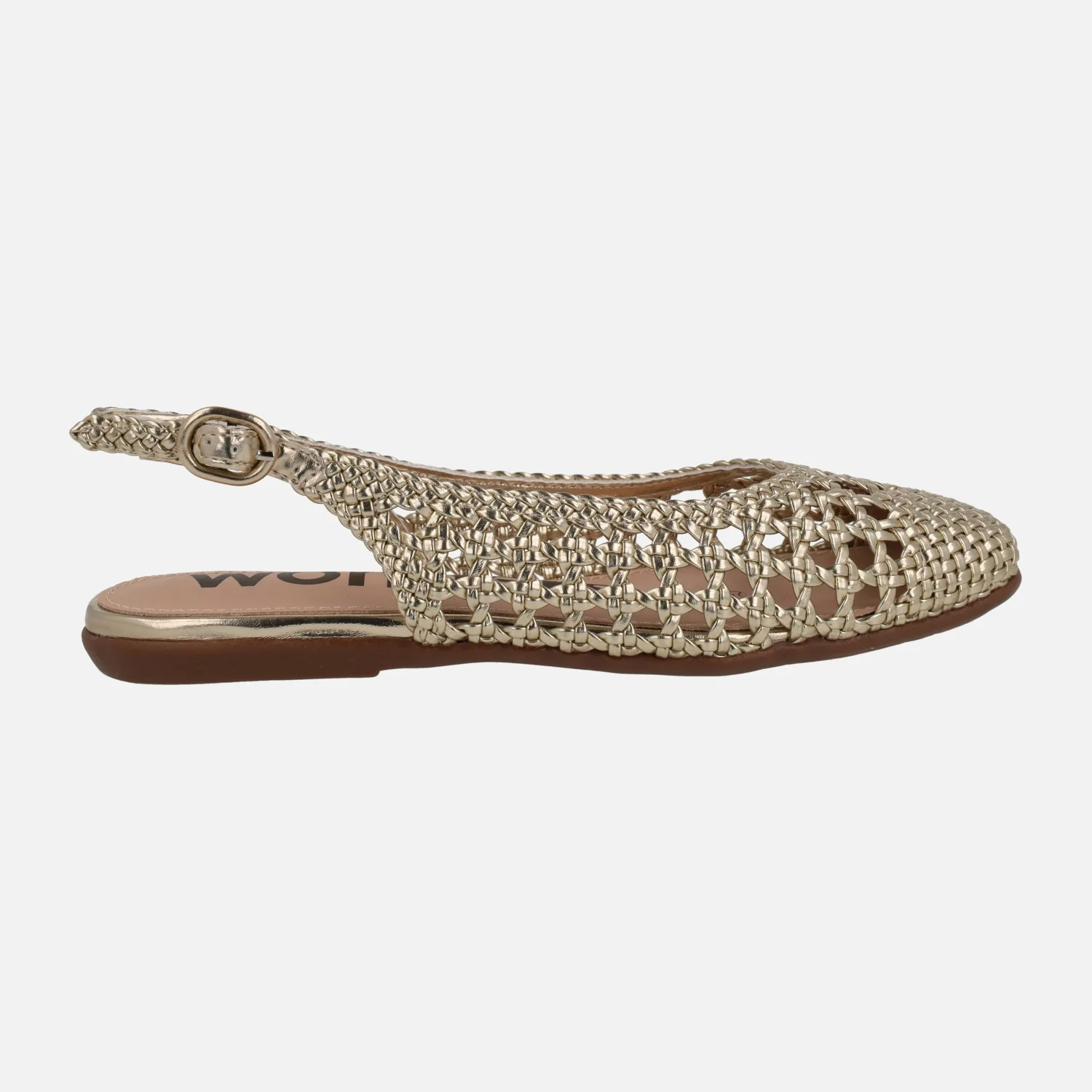 Bailarinas destalonadas Wonders Wob CH-1002 disponibles en negro y en platino (oro). Bailarinas trenzadas elaboradas en tejido, con tira al talón y cierre de hebilla. Interiores en tejido con planta de piel. Suela de goma de apenas 2 cms de altura trasera.