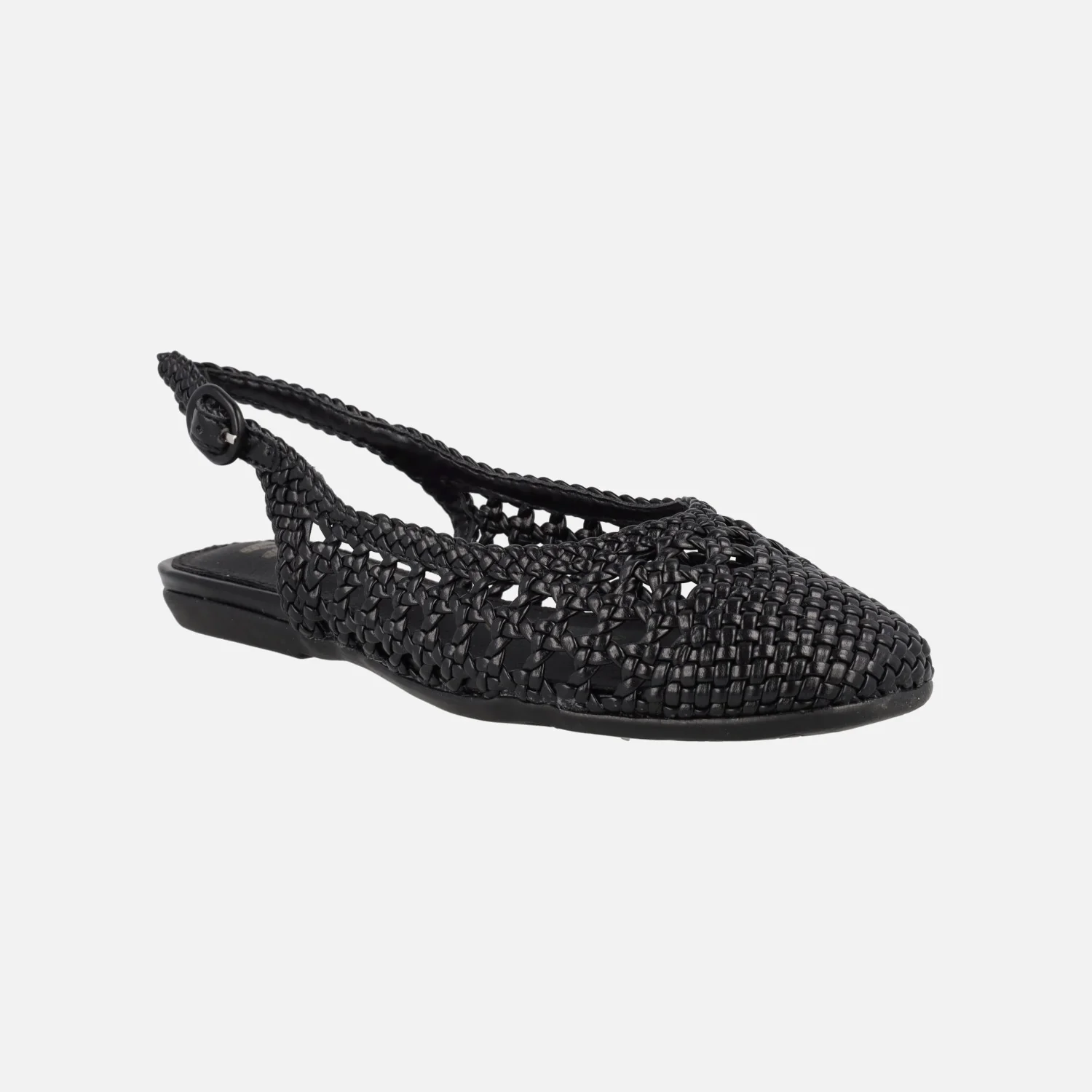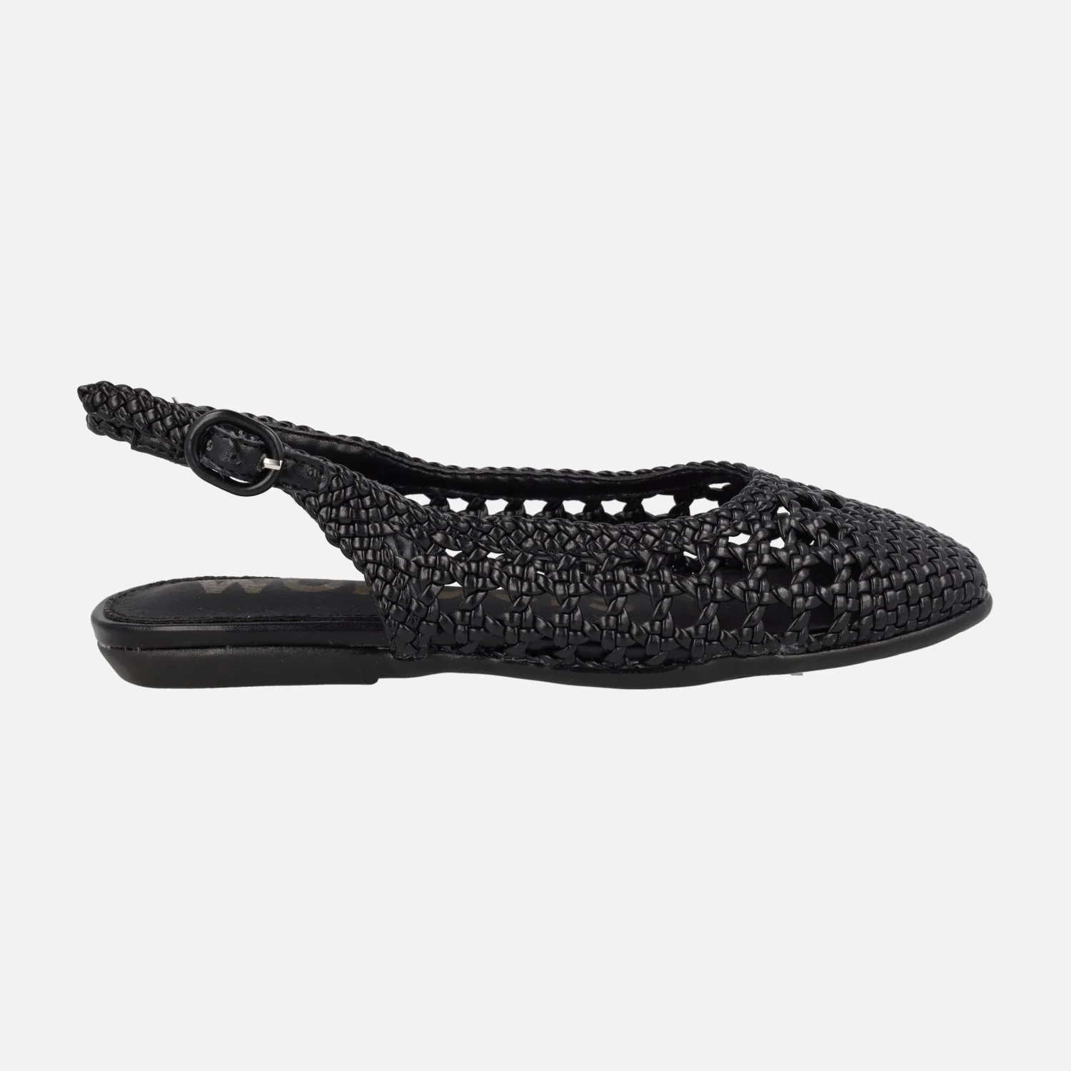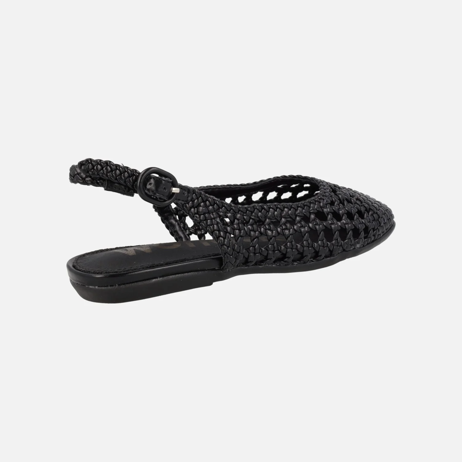 Bailarinas destalonadas Wonders Wob CH-1002 disponibles en negro y en platino (oro). Bailarinas trenzadas elaboradas en tejido, con tira al talón y cierre de hebilla. Interiores en tejido con planta de piel. Suela de goma de apenas 2 cms de altura trasera.