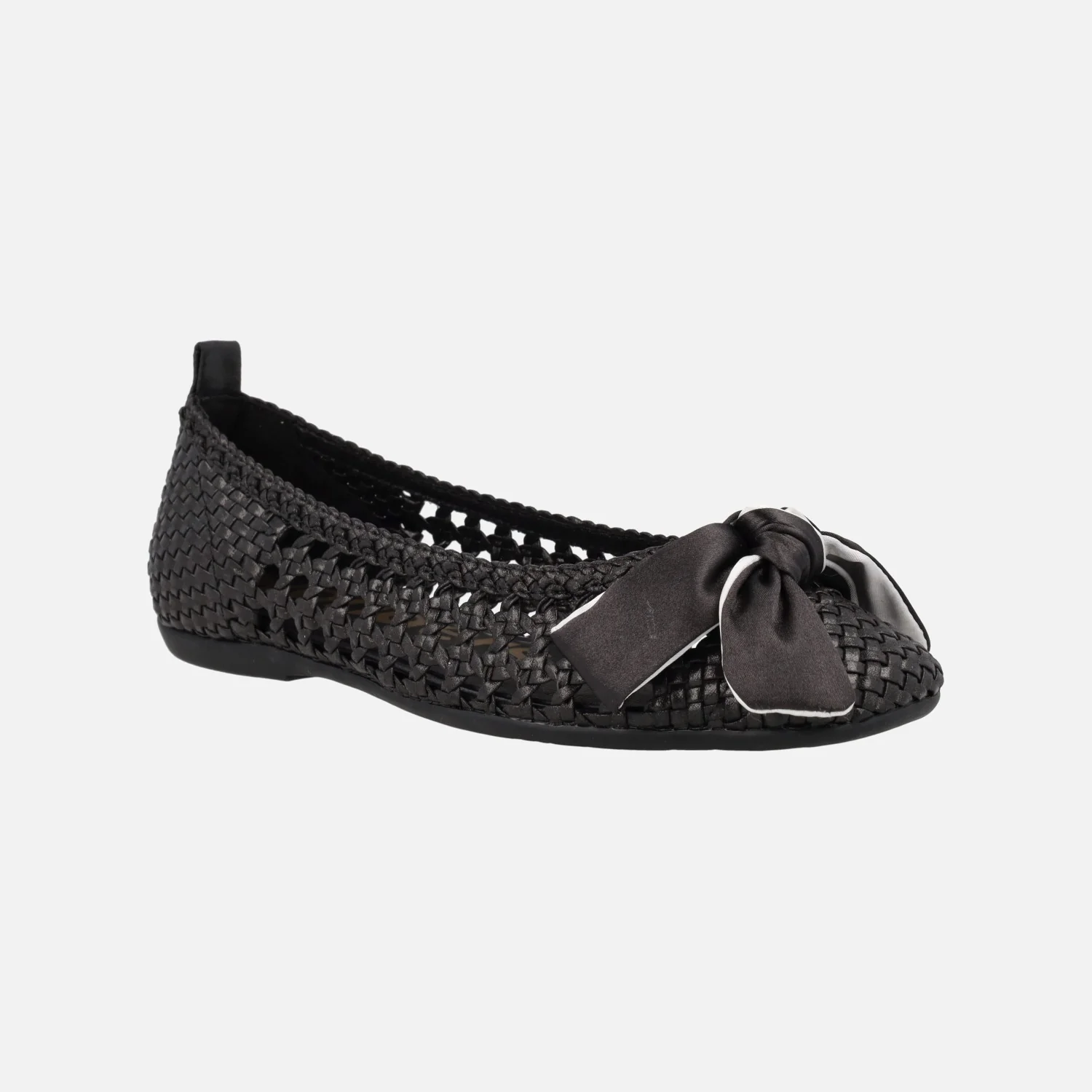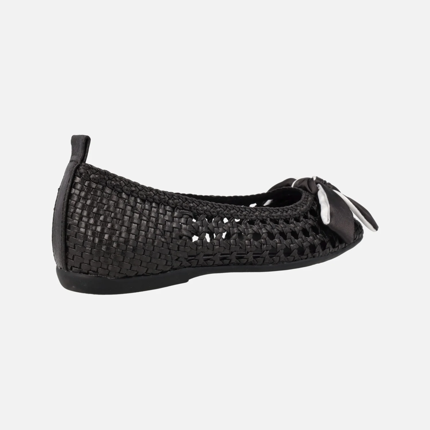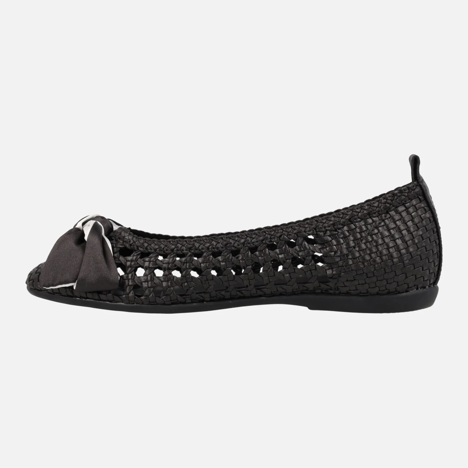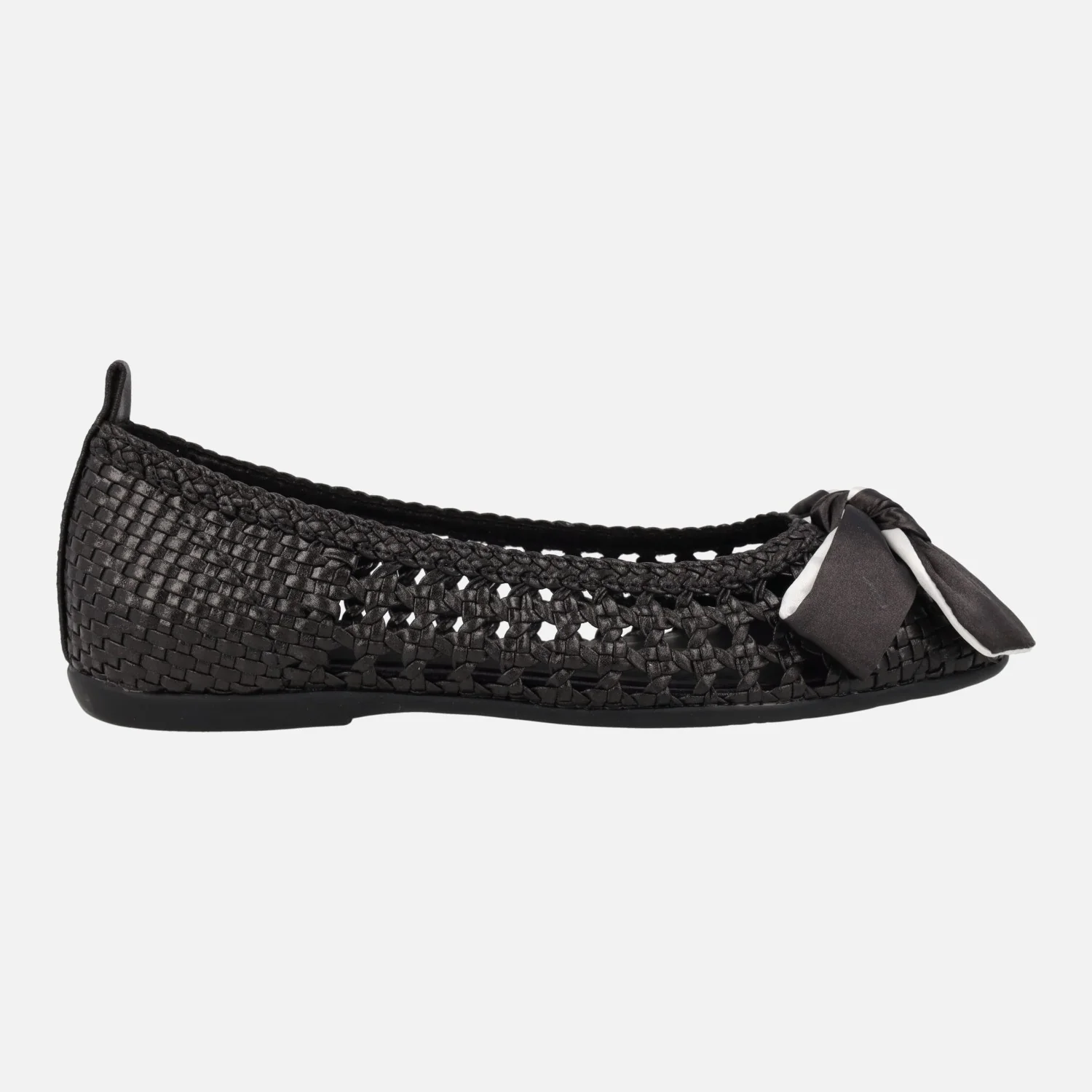 Bailarinas trenzadas Wonders Bow CH-1001 Negro. Bailarinas elaboradas en materiales textiles con detalle de gran lazo bicolor blanco/negro en la puntera. Tirador trasero para un calce más cómodo. Interior mixto de piel y tejido. Planta Memory gel. Piso sintético plano.