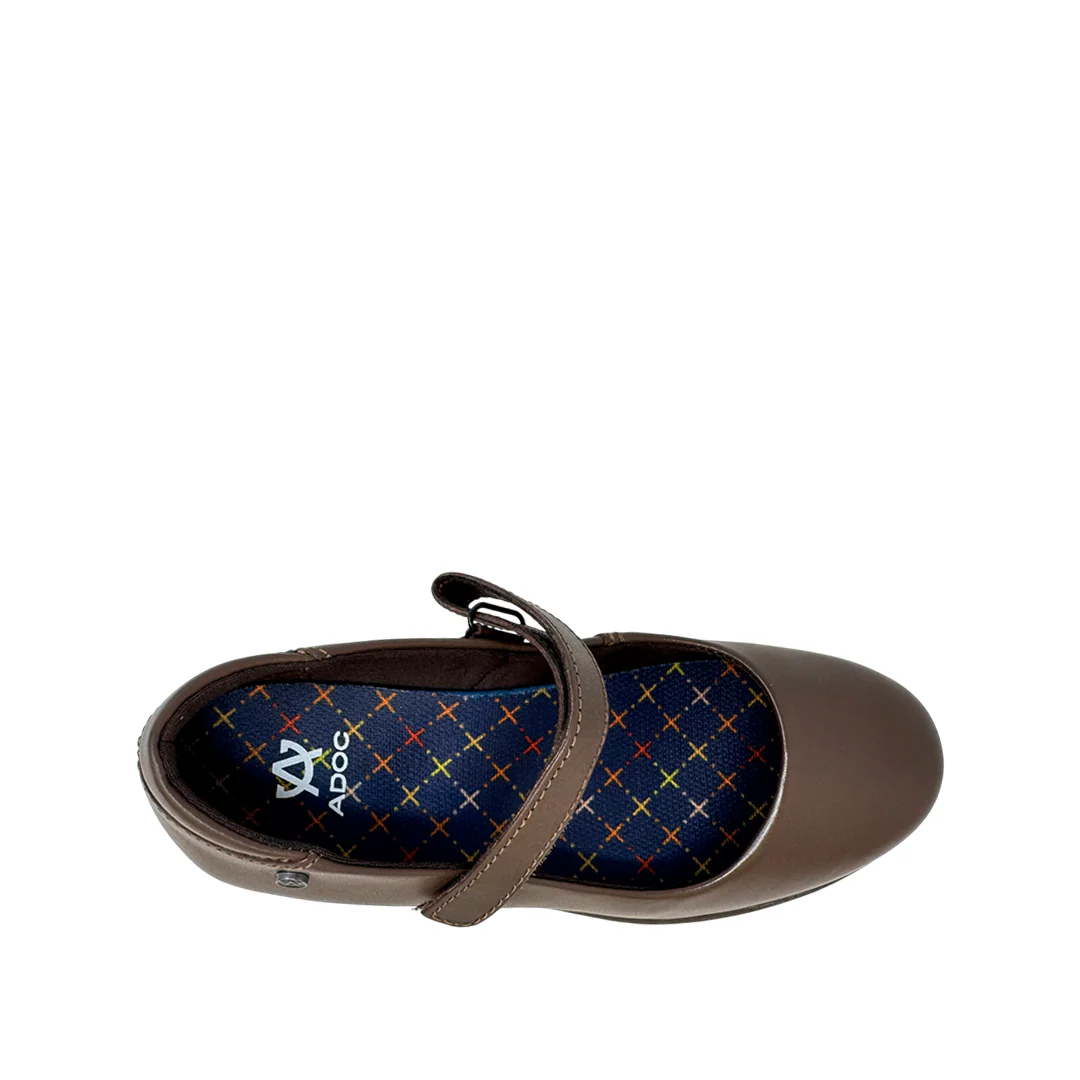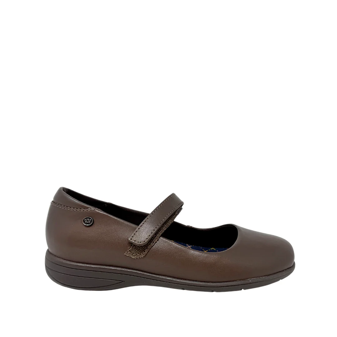 Ballerinas escolares Ariella para niña color café, confeccionadas en cuero genuino. Su estilo sobrio y resistente garantiza durabilidad y elegancia.