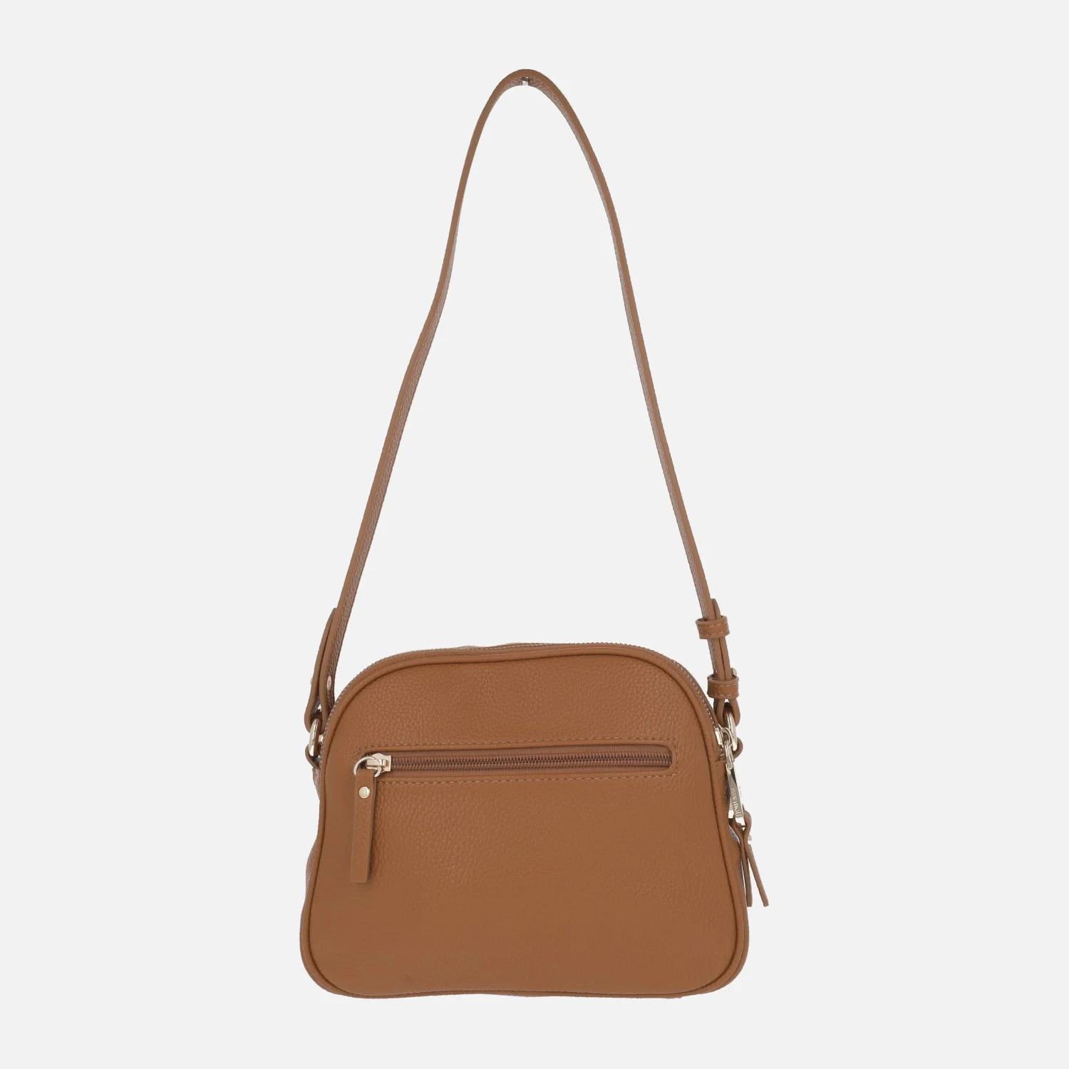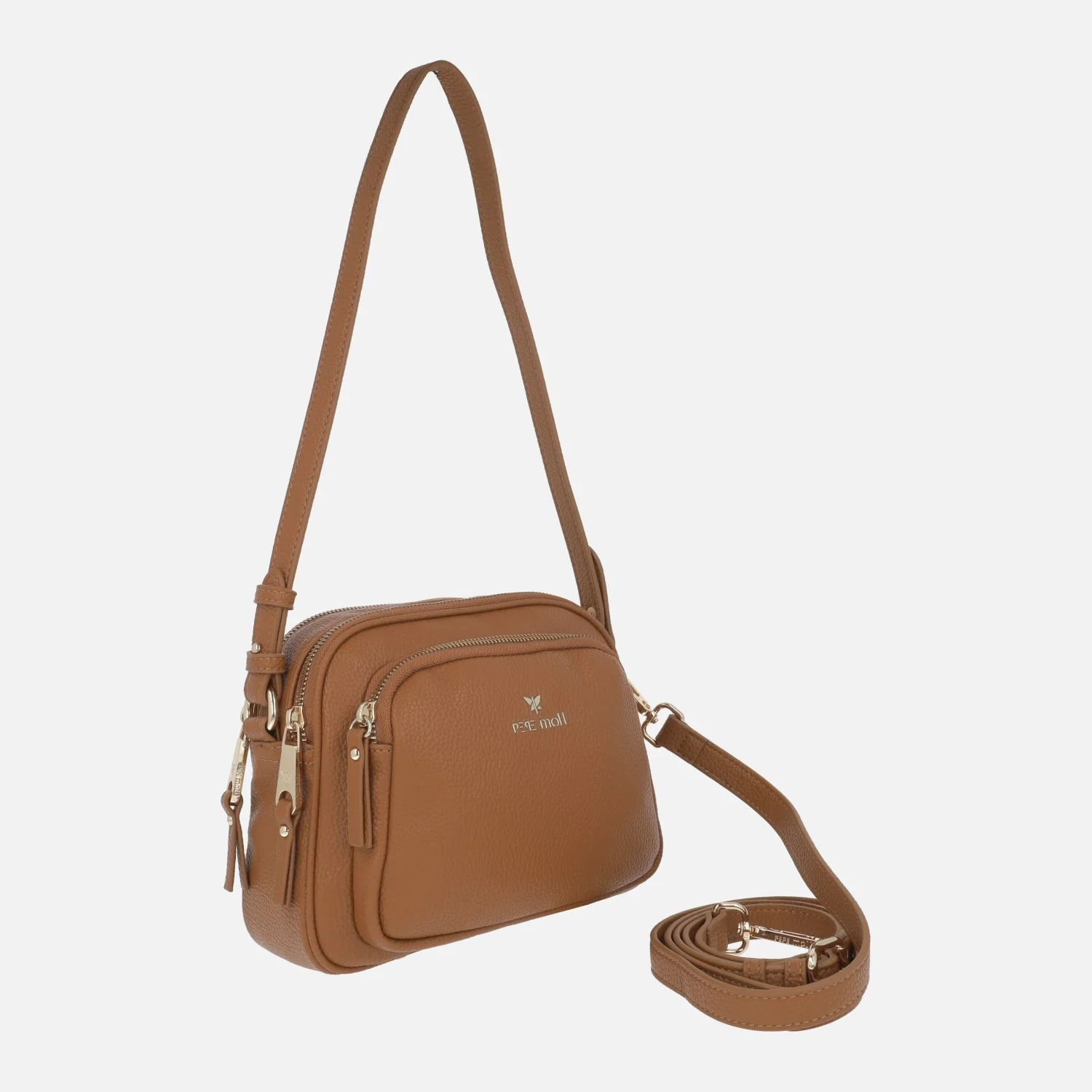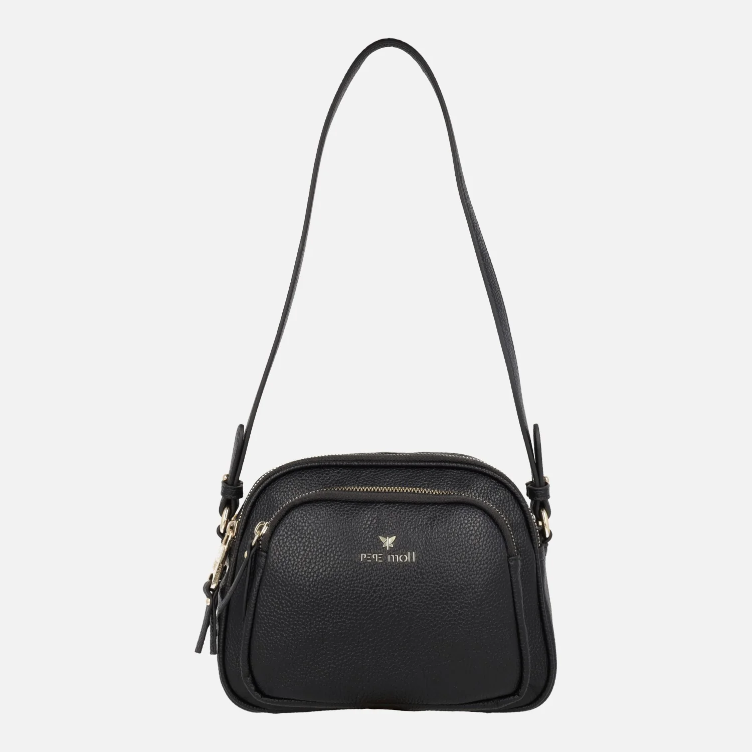 Bolsos bandolera Pepe moll de pequeño tamaño modelo 252232, disponibles en negro y en cuero. Elaboradas en poliuretano 100% y formado por dos compartimentos independientes con cierre de cremallera. Bolsillos delantero y trasero también con cremallera. Interior textil. Asa para hombro, extraíble, y asa bandolera extraíble y ajustable. Medidas: 18 cm de alto x 23 cm de ancho inferior x 19 cm de ancho superior x 11 cm de fondo.