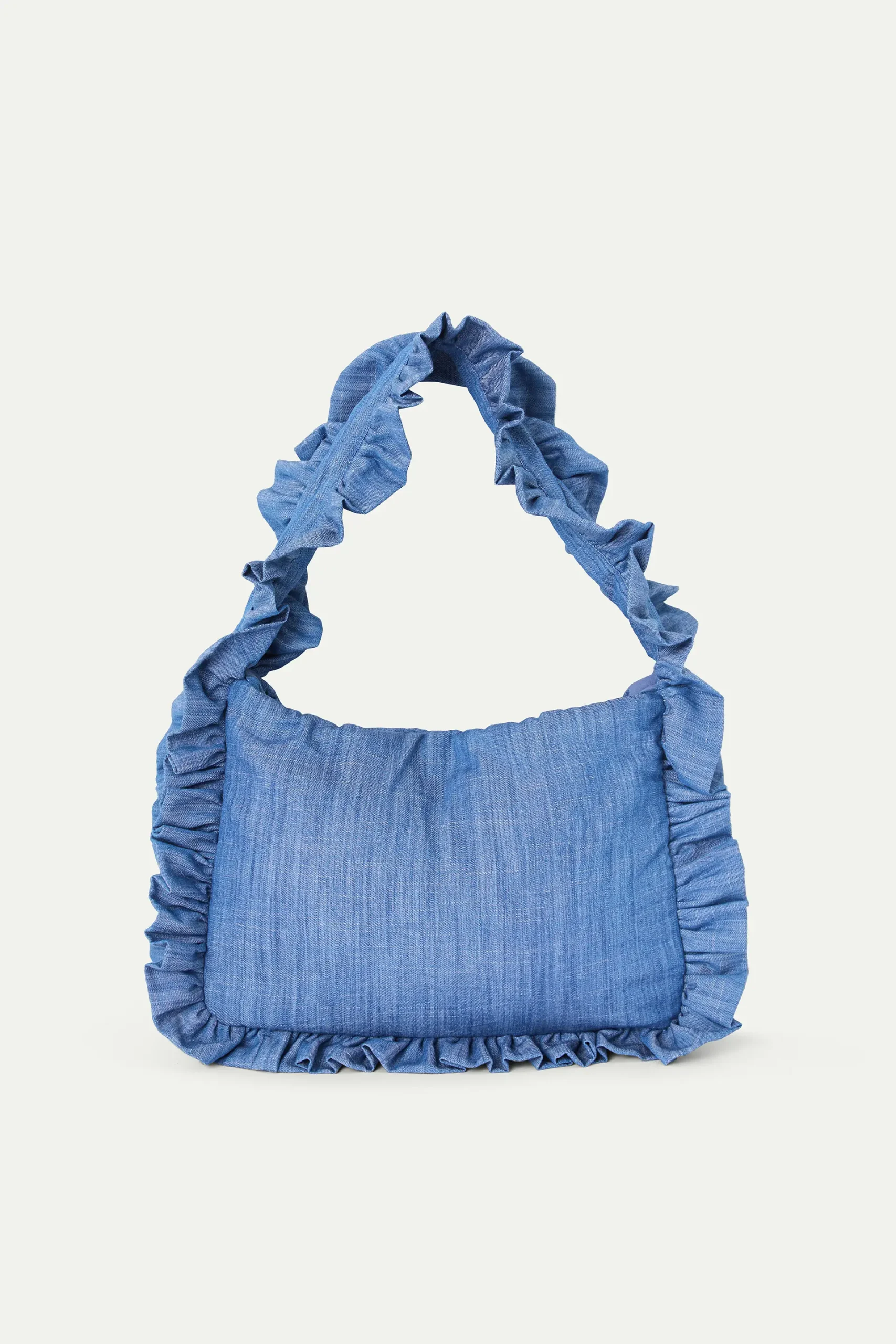 Bolso con tejido 100% algodón chambray azul claro. Asa corta. Detalle de volantes.Forro interior.