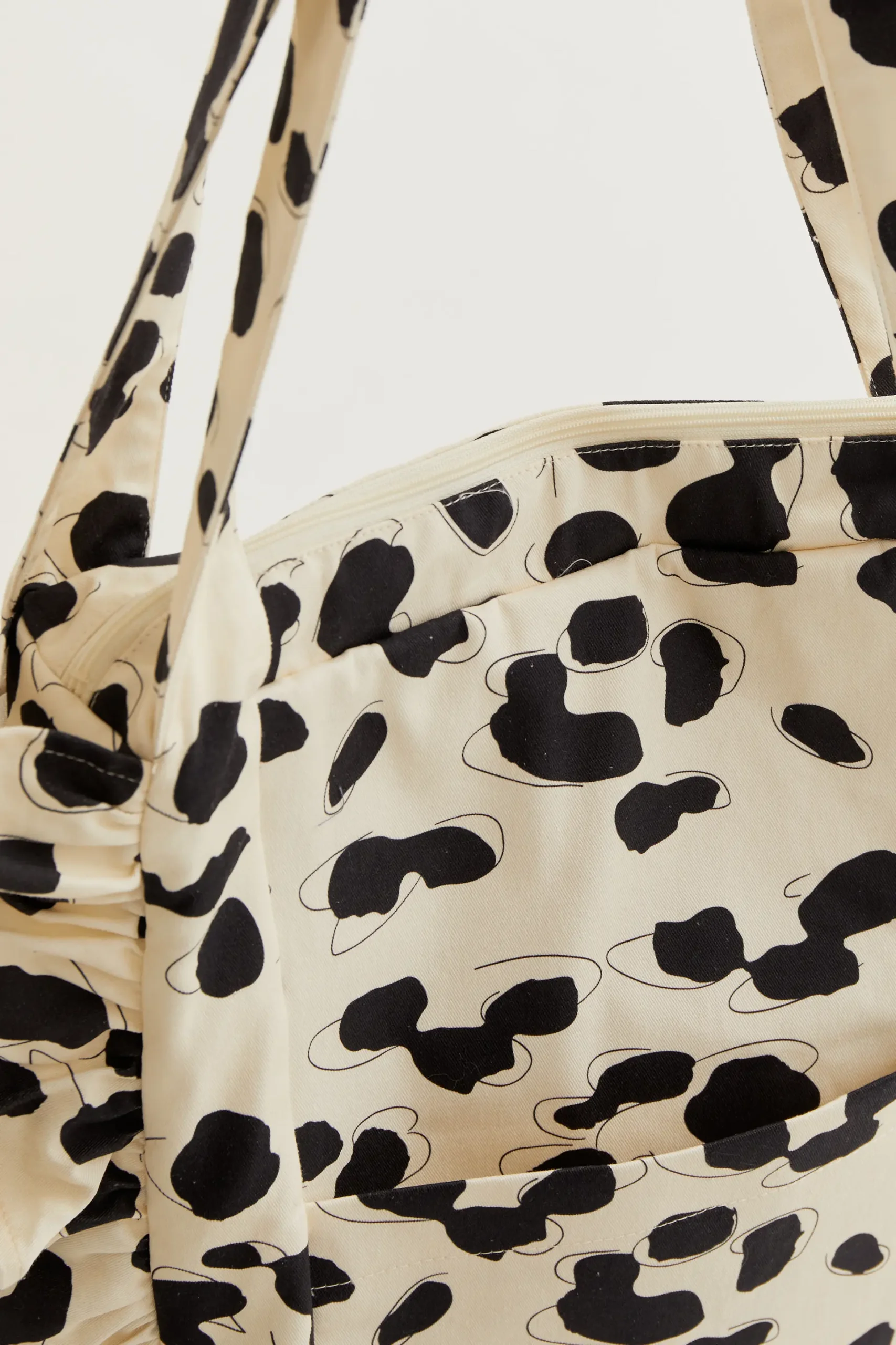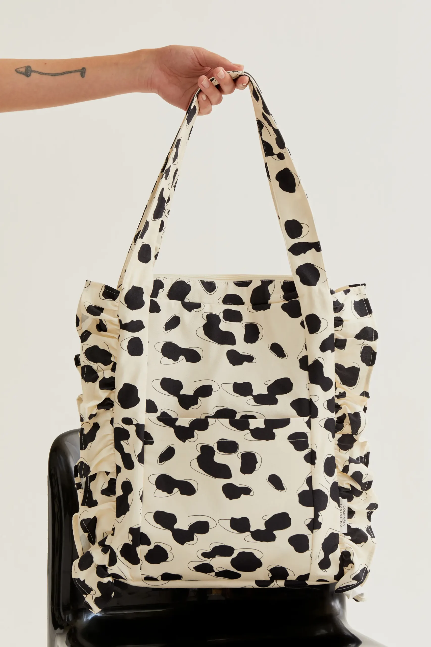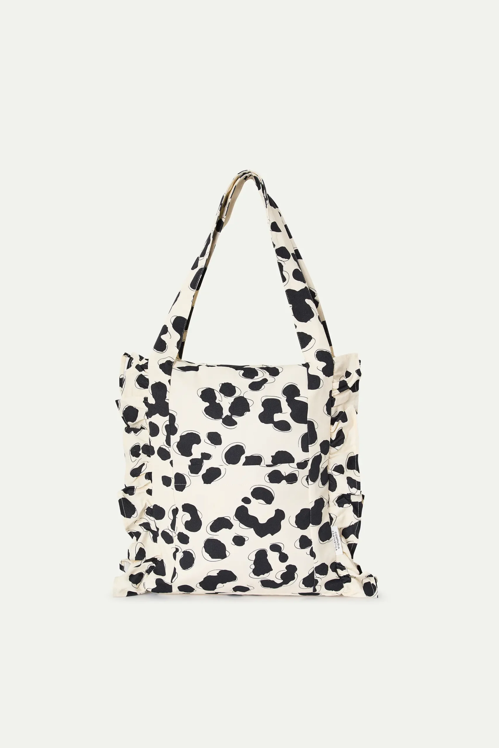 Bolso de tejido 100% algodón con estampado dalmatian. Asa corta. Cierre con cremallera. Bolsillo frontal. Detalle de volantes. Forro interior.