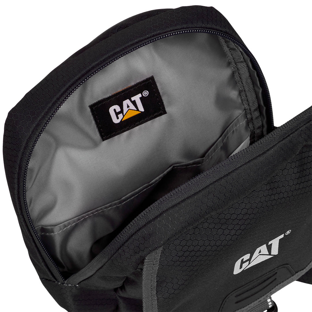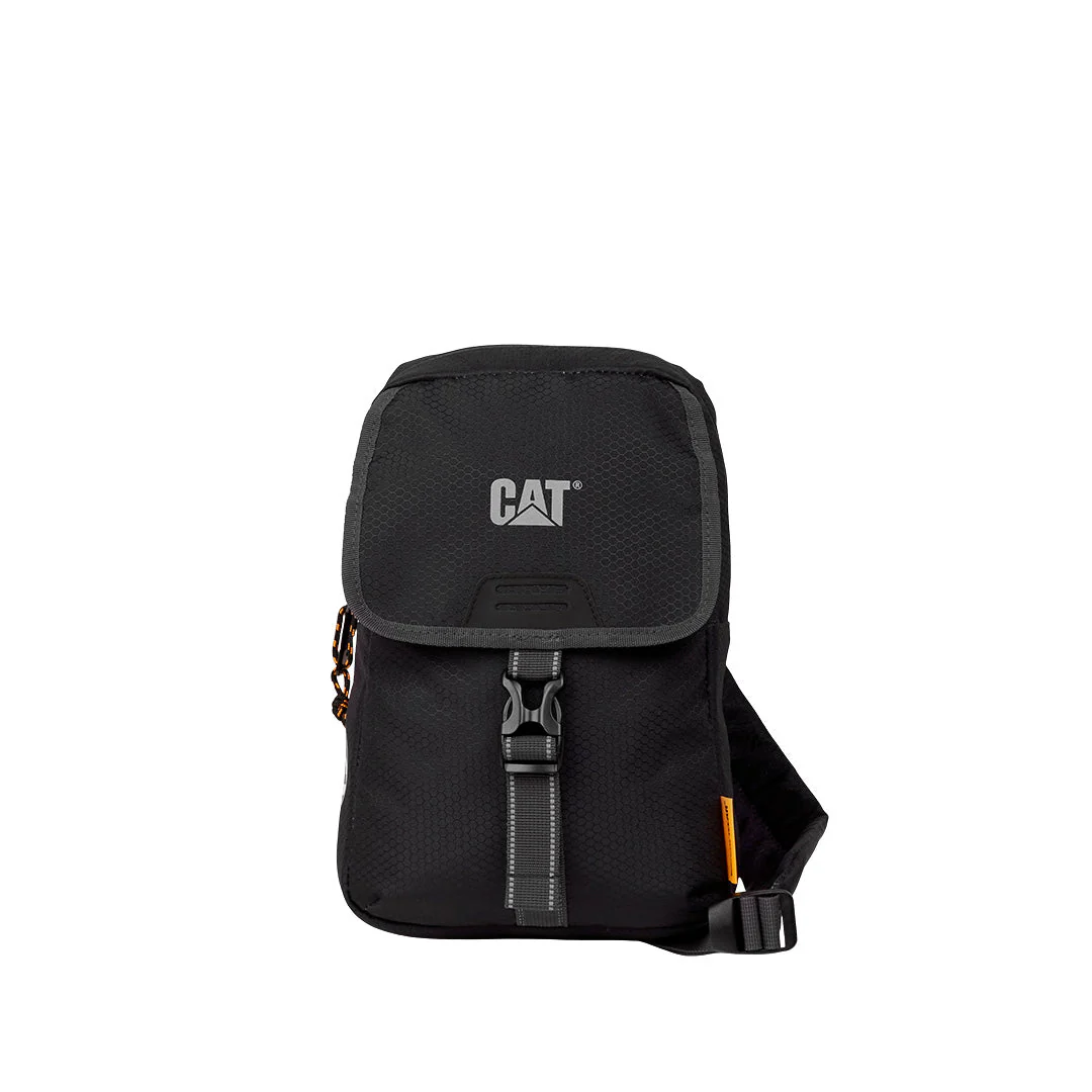 Bolso de 4 L fabricada en poliéster 300D hexagonal ripstop, con medidas de 18 x 29 x 6 cm y peso de 0.185 kg. Incluye compartimento principal con bolsillo interior, flap frontal, elementos reflectantes en logo y webbing, parche Hypalon y etiqueta tejida Caterpillar para mayor estilo y visibilidad.