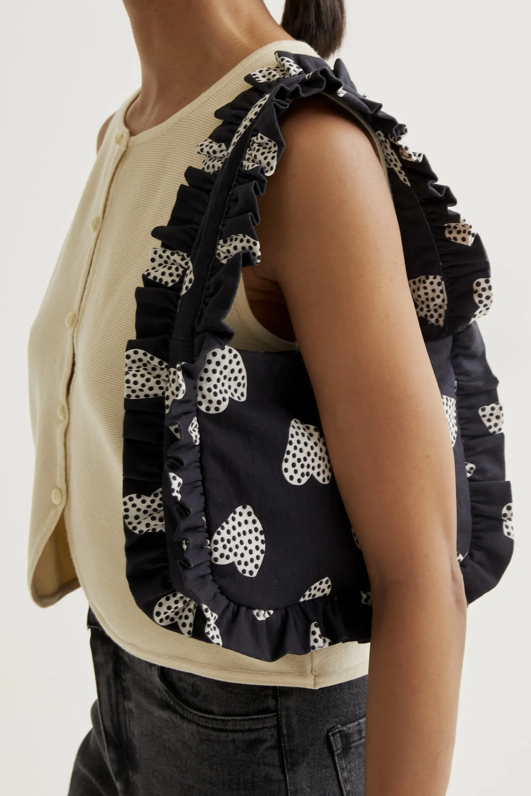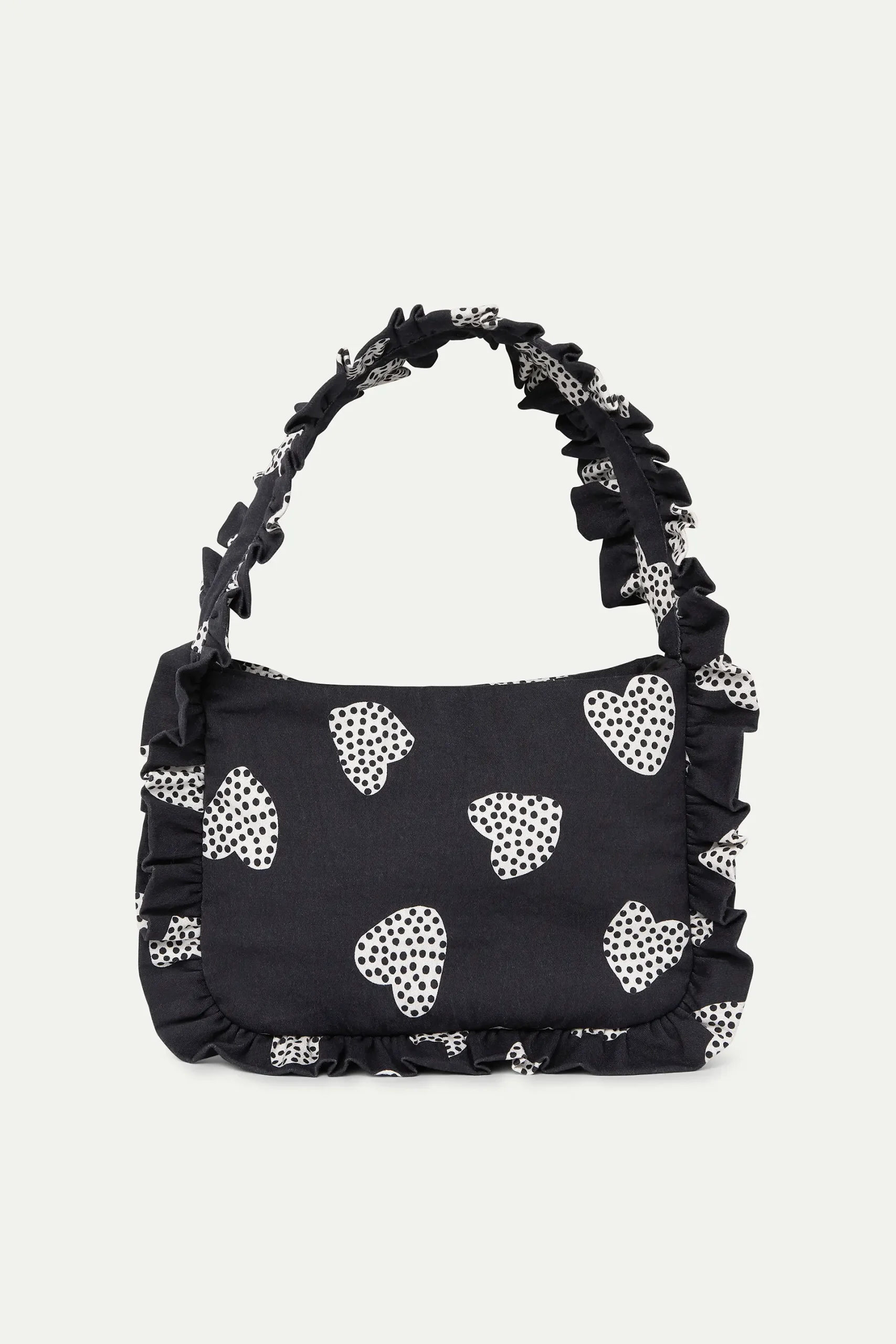 Bolso de tejido 98% algodón con estampado harmony black. Asa corta. Detalles con volantes. Forro interior.