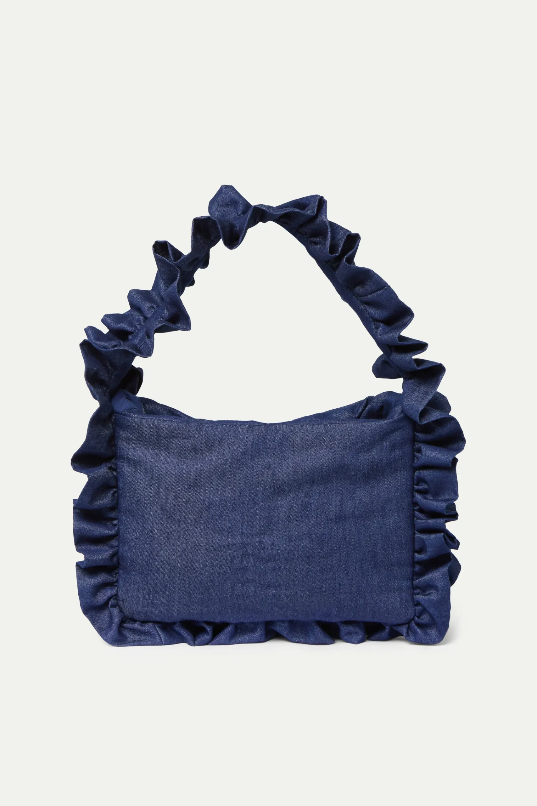 Bolso de tejido 100% algodón chambray de color azul oscuro. Asa corta. Cierre con imán. Detalle de volantes.