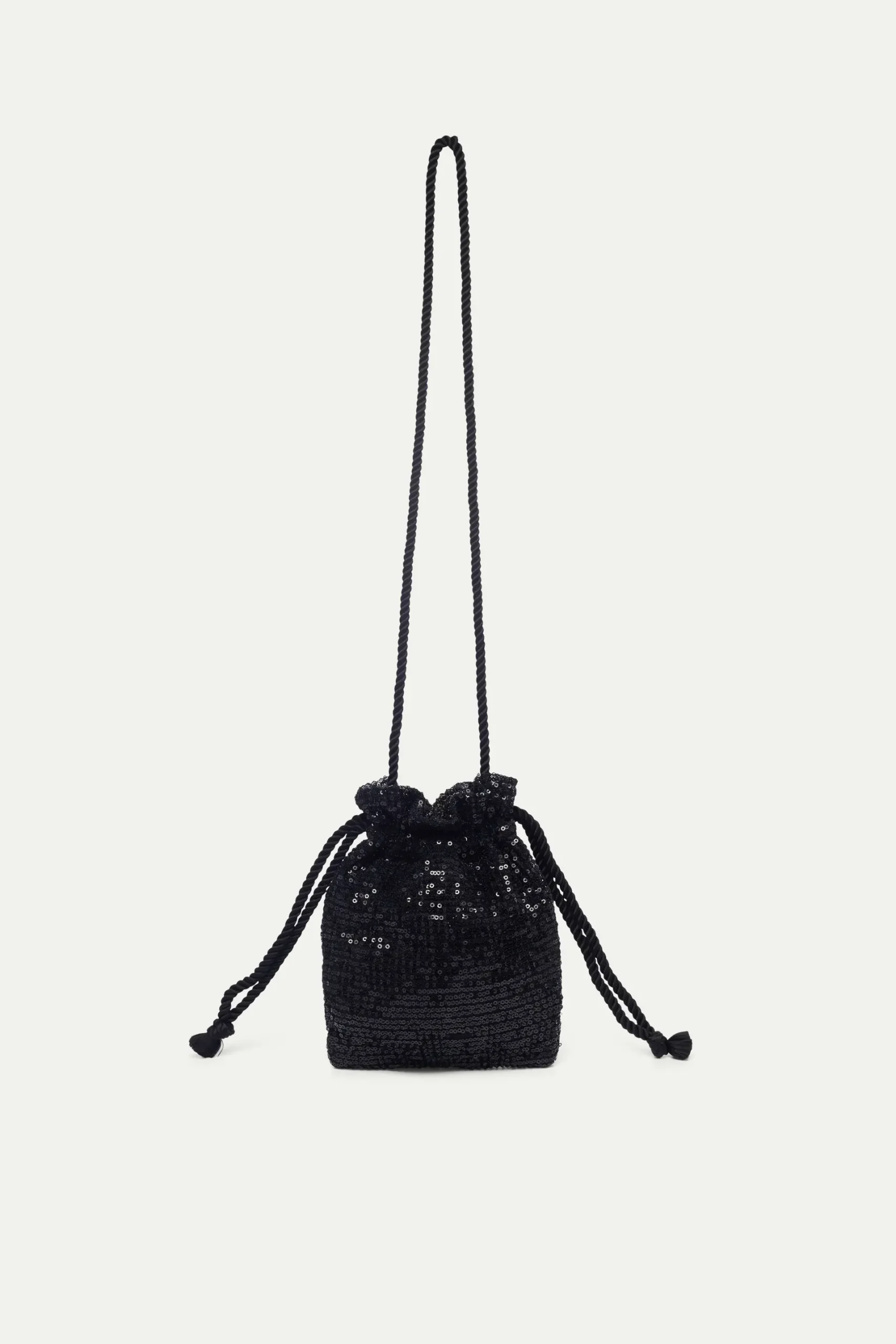Bolso de mano de lentejuelas de color negro. Asa corta. Cierre con cordón ajustable. Forro interior.