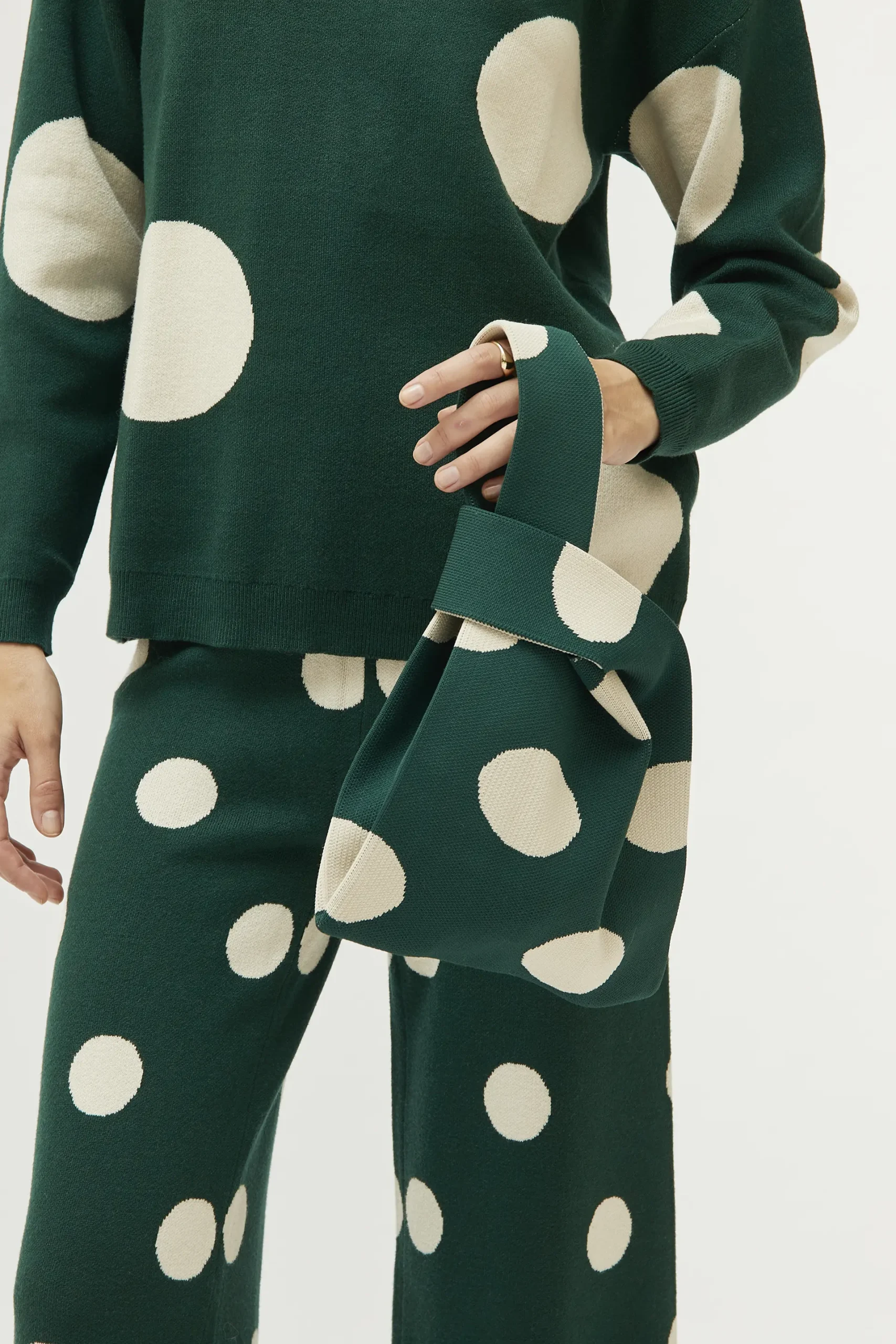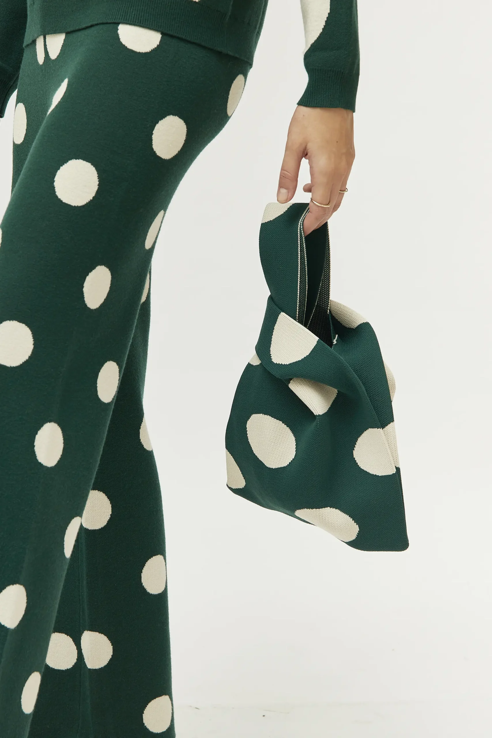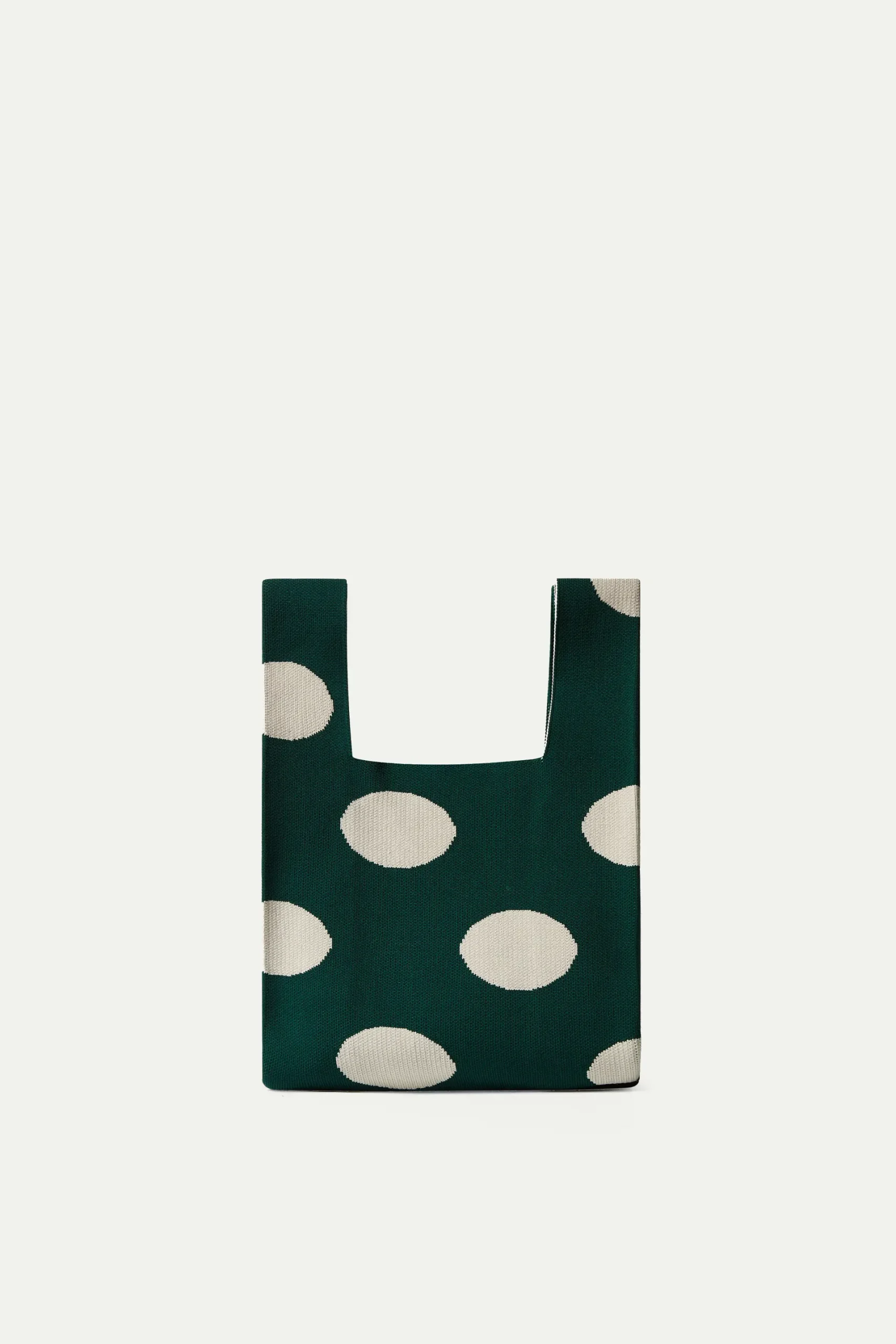 Bolso de mano de punto jacquard de color verde con estampado de lunares blancos.
