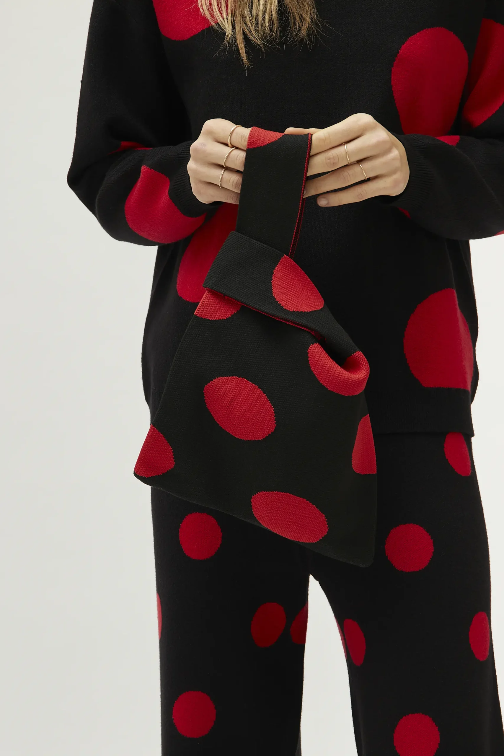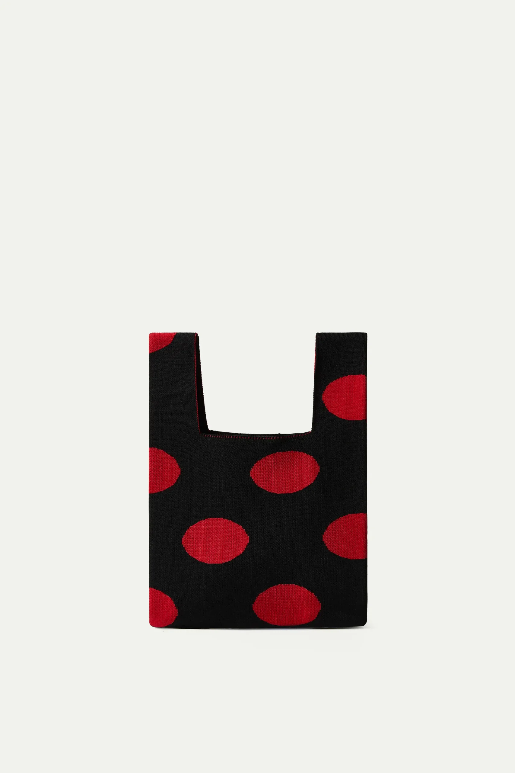Bolso de mano de punto jacquard de color negro con estampado de lunares rojos.