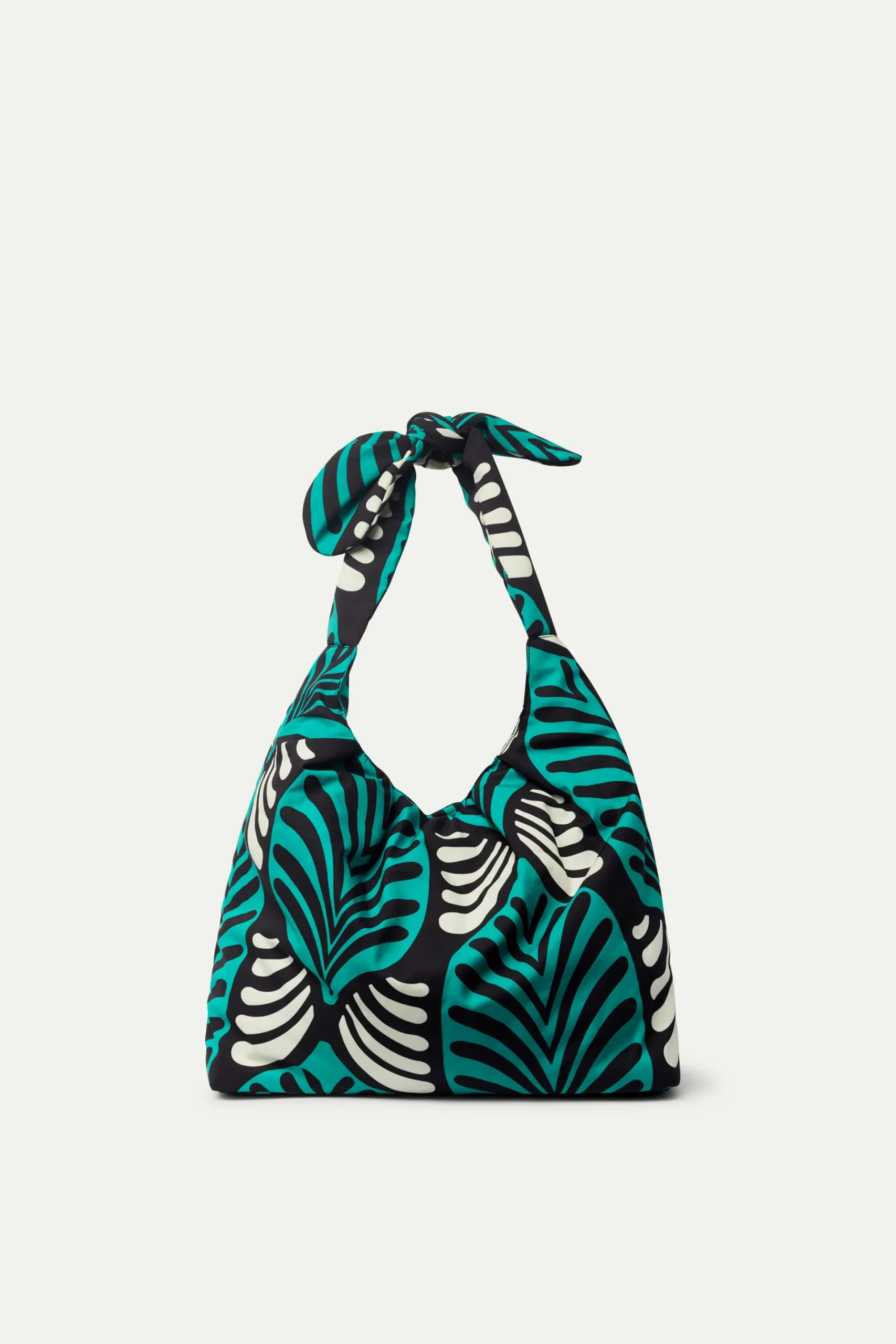 Bolso de hombro en crepé con estampado geométrico de color verde y blanco. Asa corta para el hombro y detalle de nudo. Forro interior.