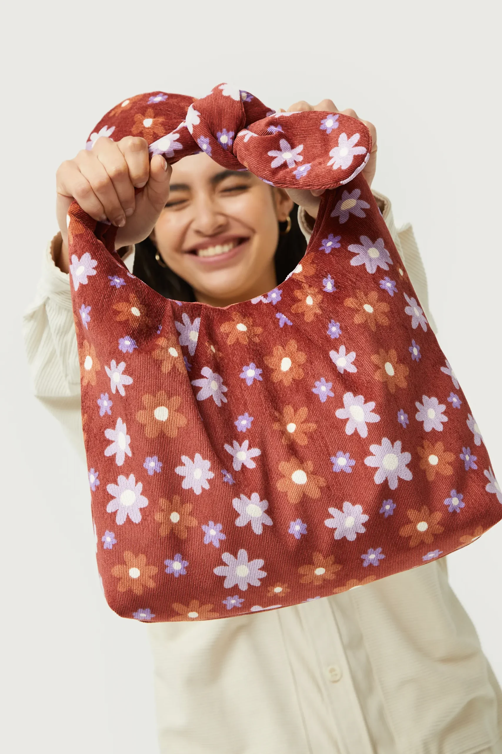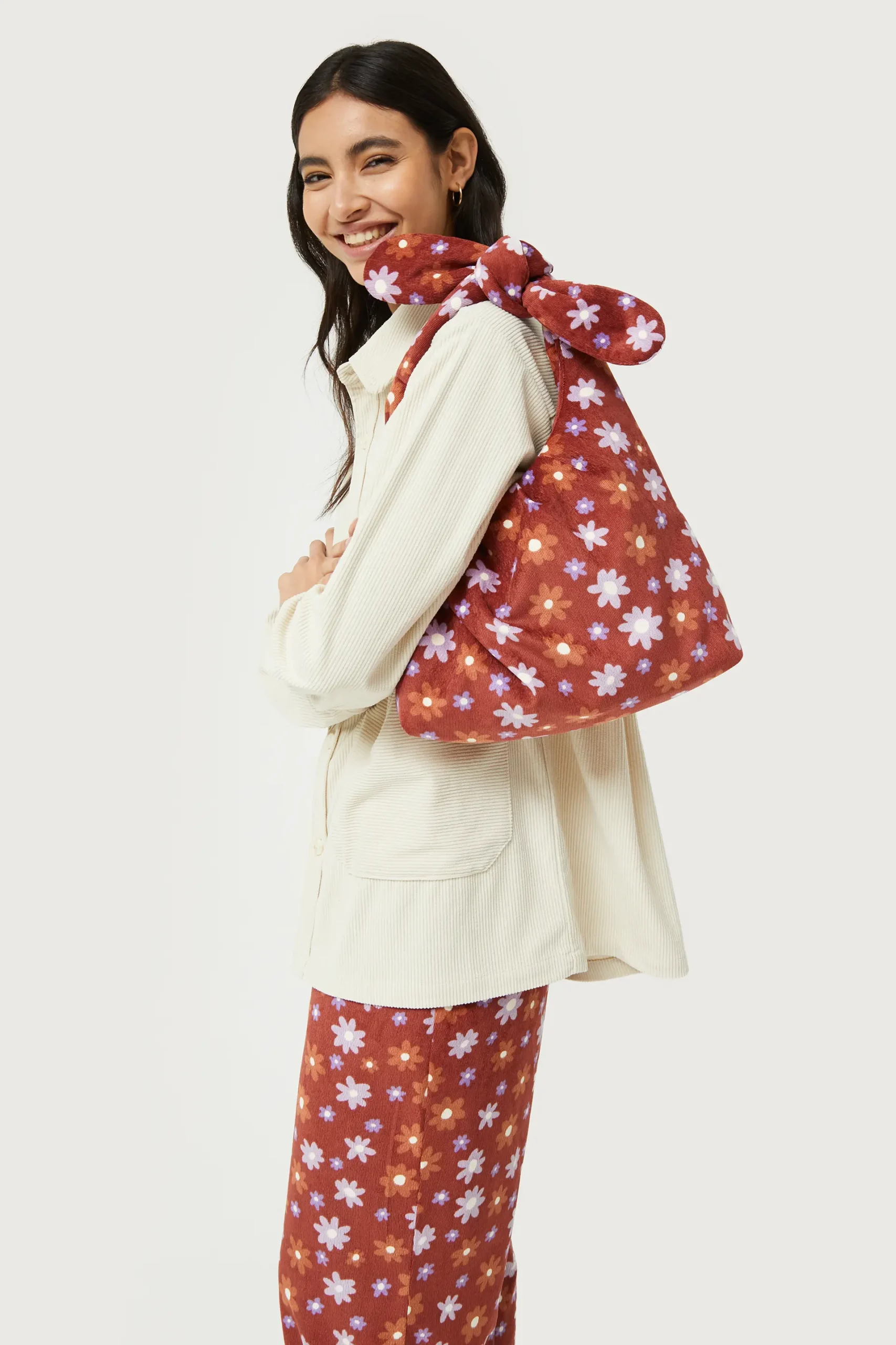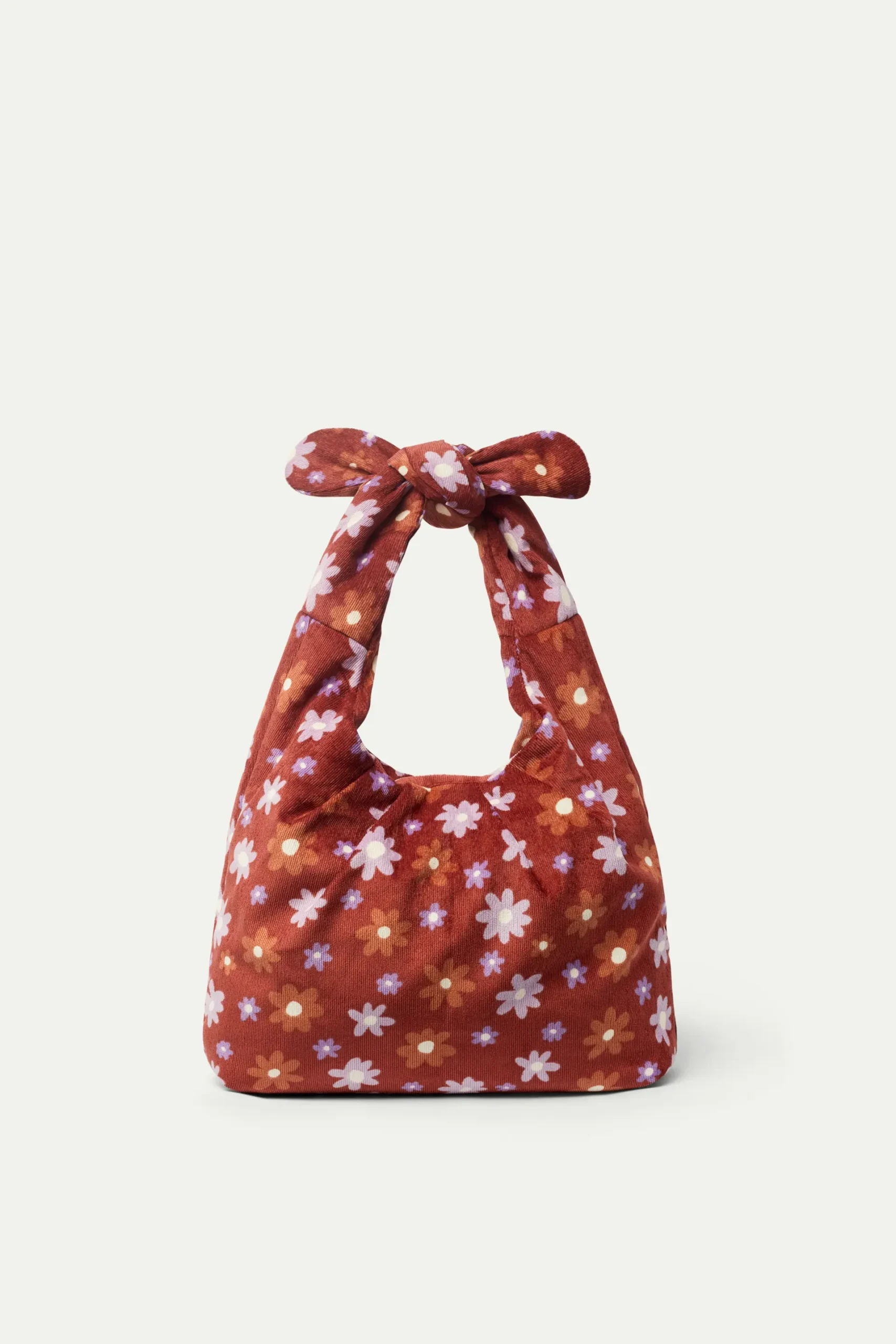 Bolso de hombro de pana con estampado de flores marrones y lilas. Asa corta para el hombro y detalle de nudo. Forro interior.