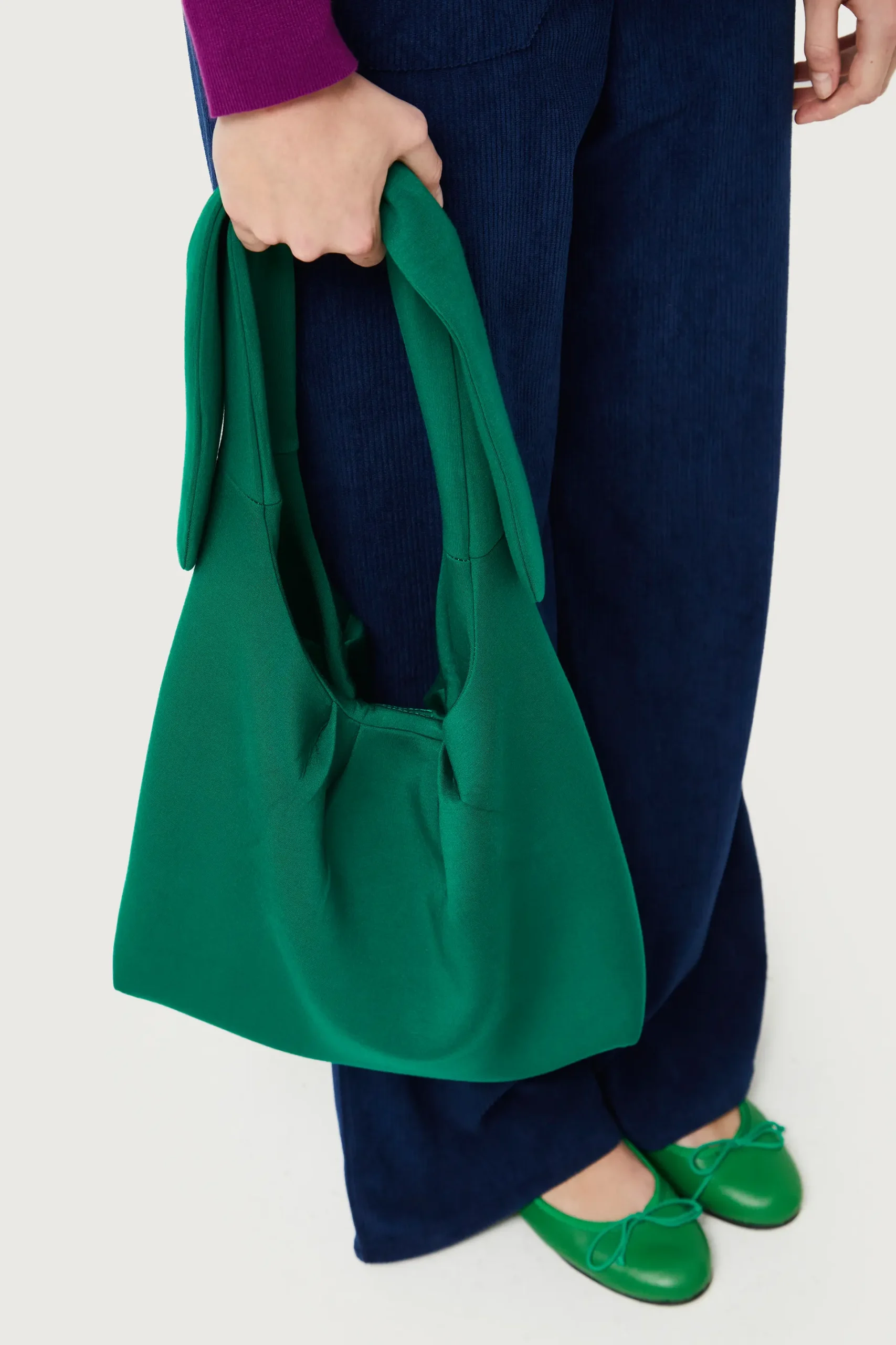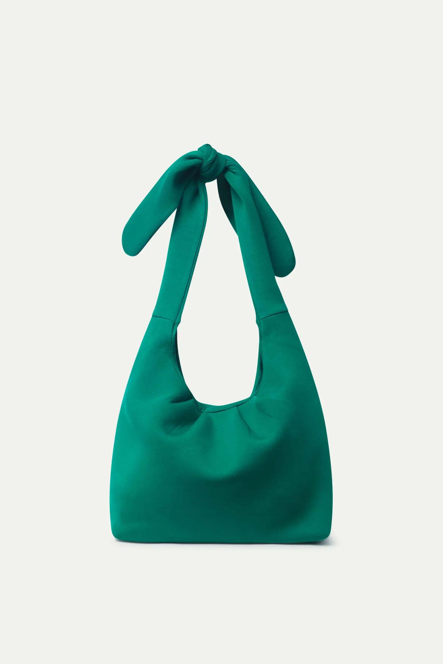 Bolso de hombro de neopreno de color verde. Asa corta para el hombro y detalle de nudo. Forro interior.
