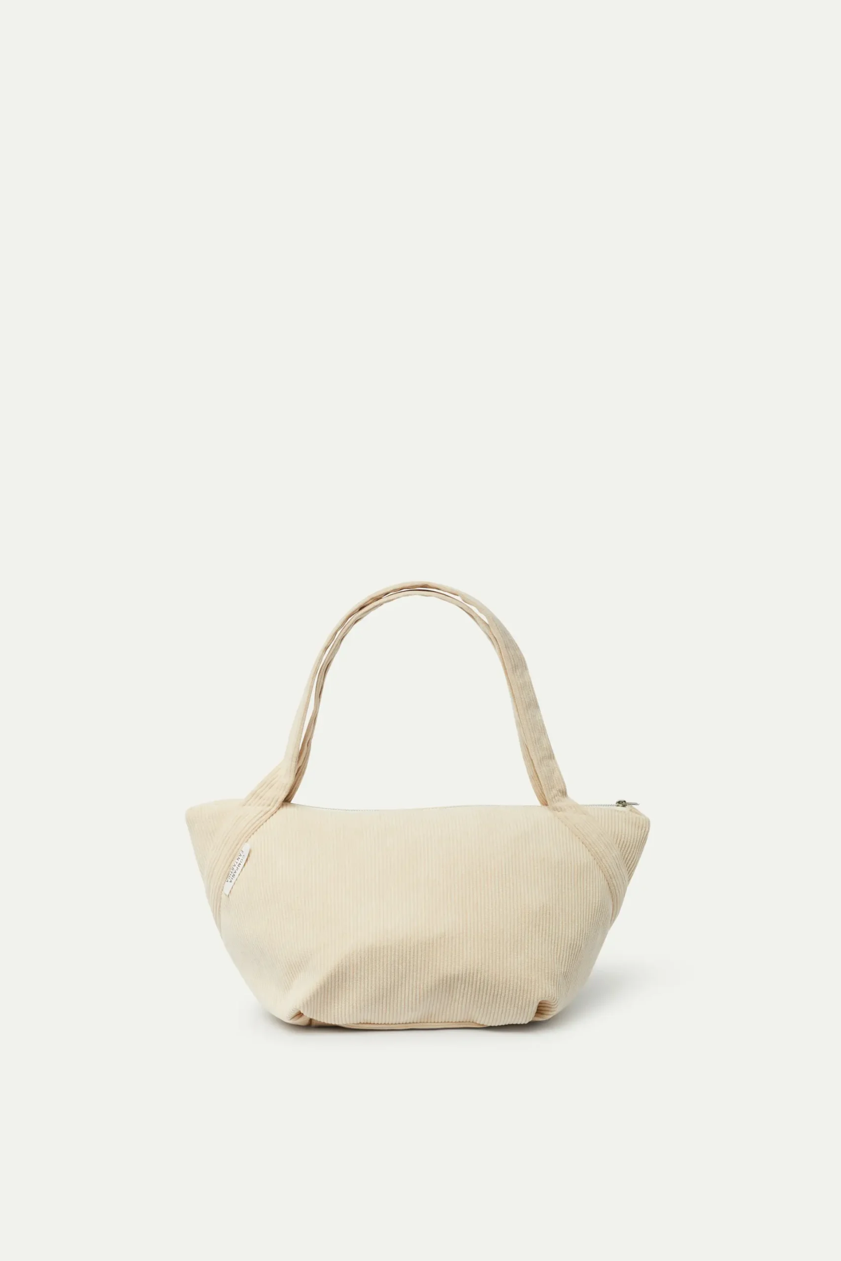 Bolso de hombro de pana de color blanco roto. Cierre de cremallera. Asa corta para el hombro.
