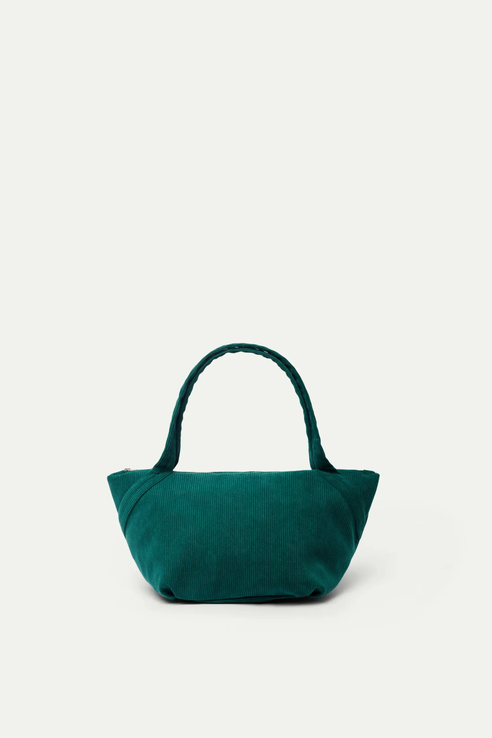 Bolso de hombro de pana de color verde. Cierre de cremallera. Asa corta para el hombro.