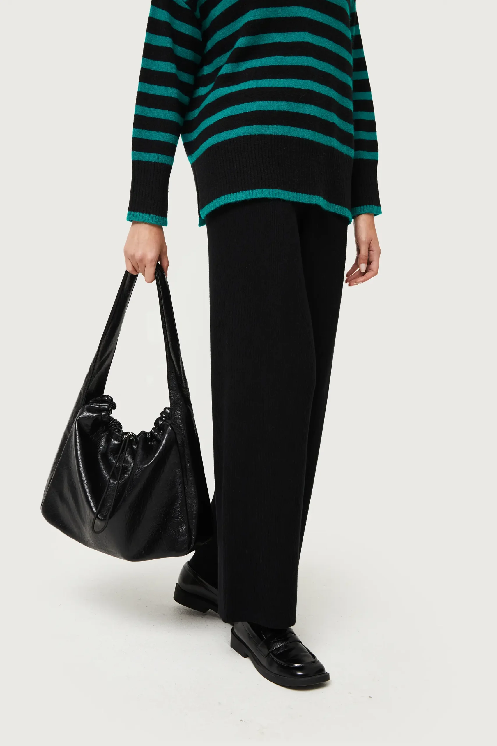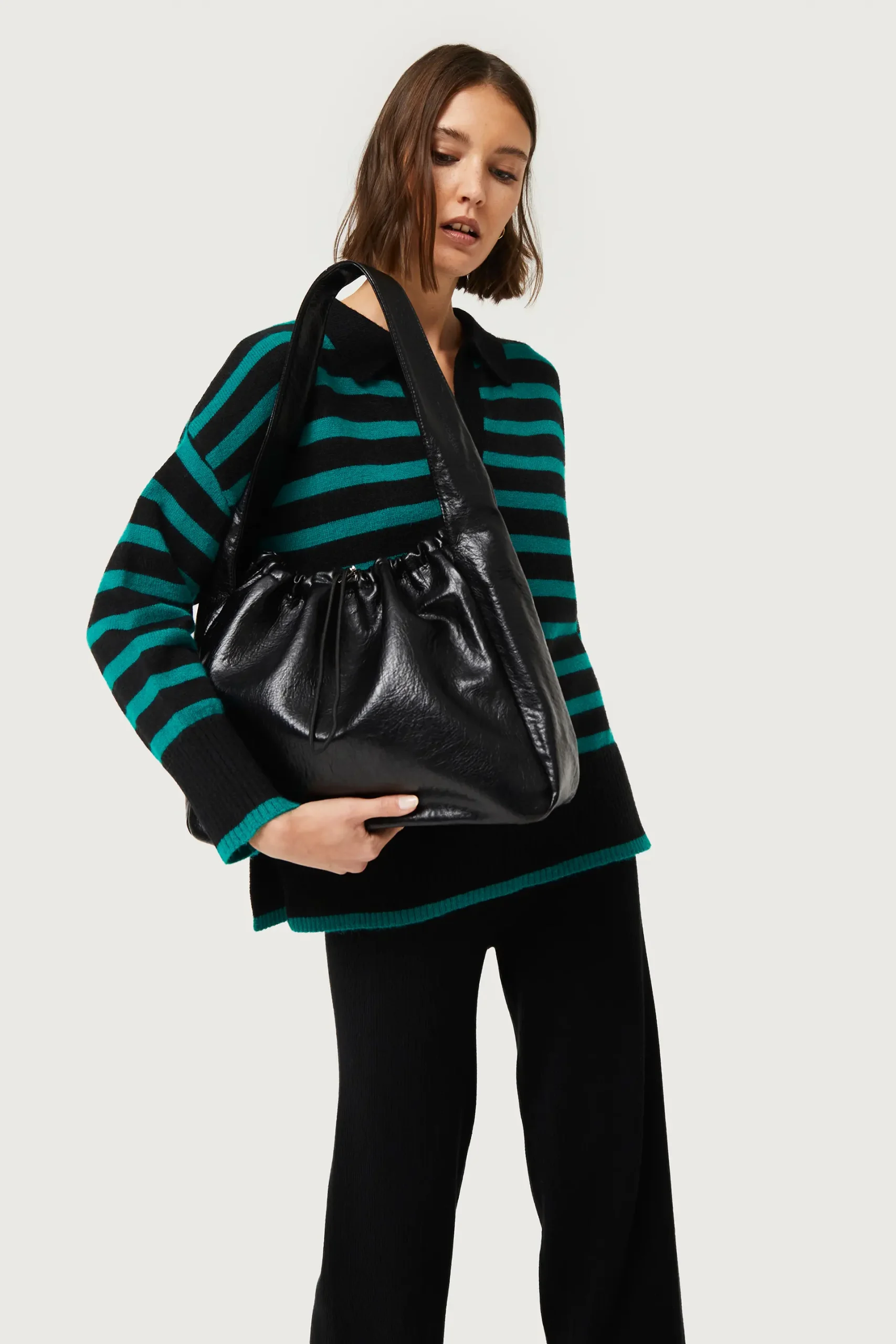 Bolso de hombro de piel sintética de color negro. Cierre con cordón ajustable. Asa corta. Forro interior.