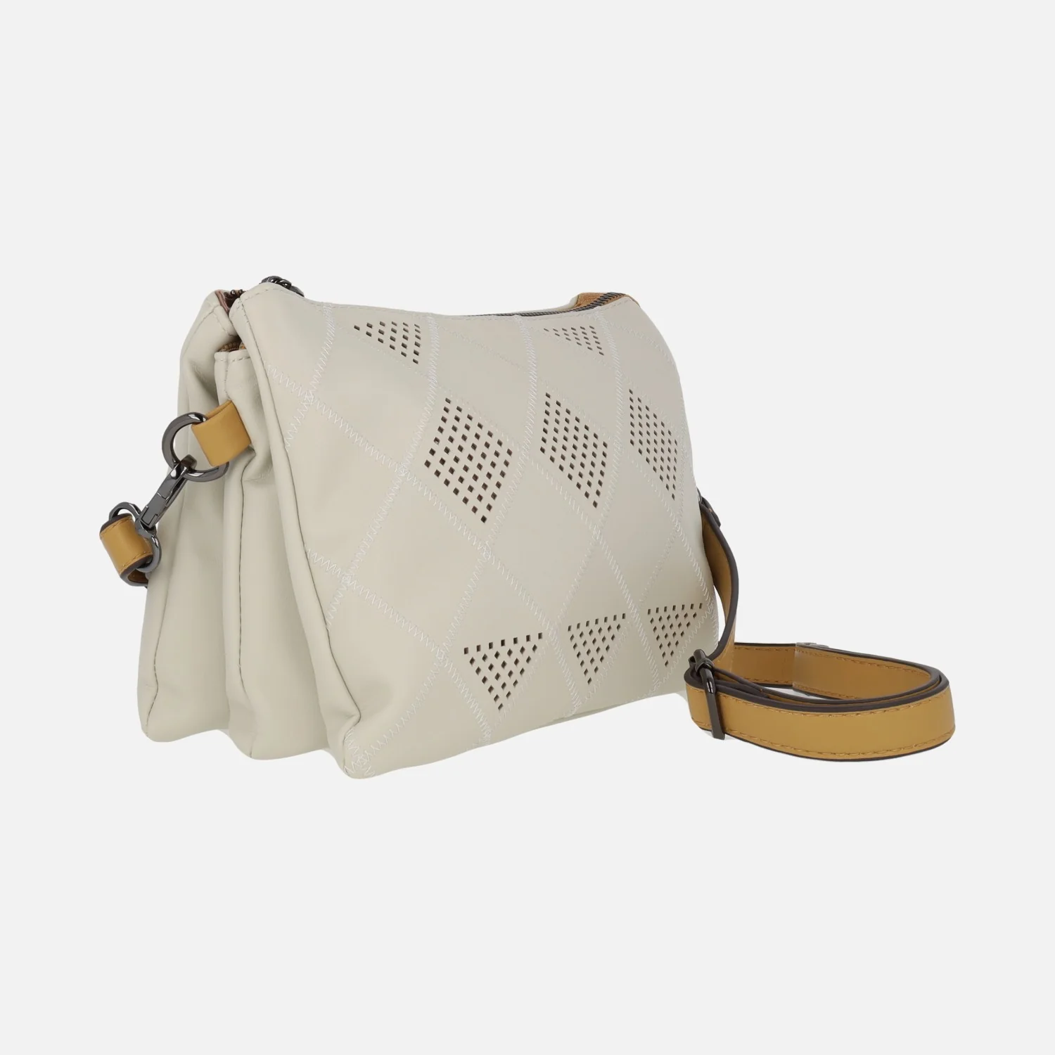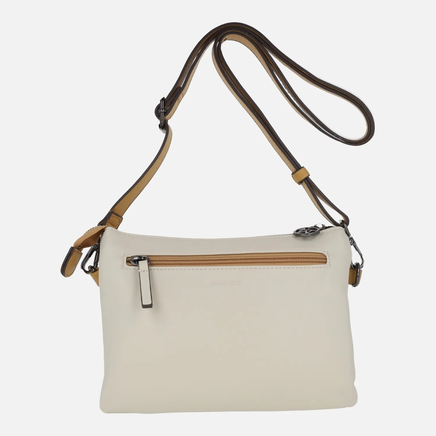 Bolsos bandolera de la marca Matties modelo Alhama 20848 beige. Bolsos con cierre principal de cremallera y tres compartimentos. Elaborados en polipiel (sintéticos) color beige, con acabado apariencia piel. Dibujos en el frontal con pespuntes y troquelados. Asa bandolera ajustable. Interior textil. Bolsillo trasero con cremallera. Medidas: 15 cm de alto x 20 cm de ancho x 9 cm de fondo.