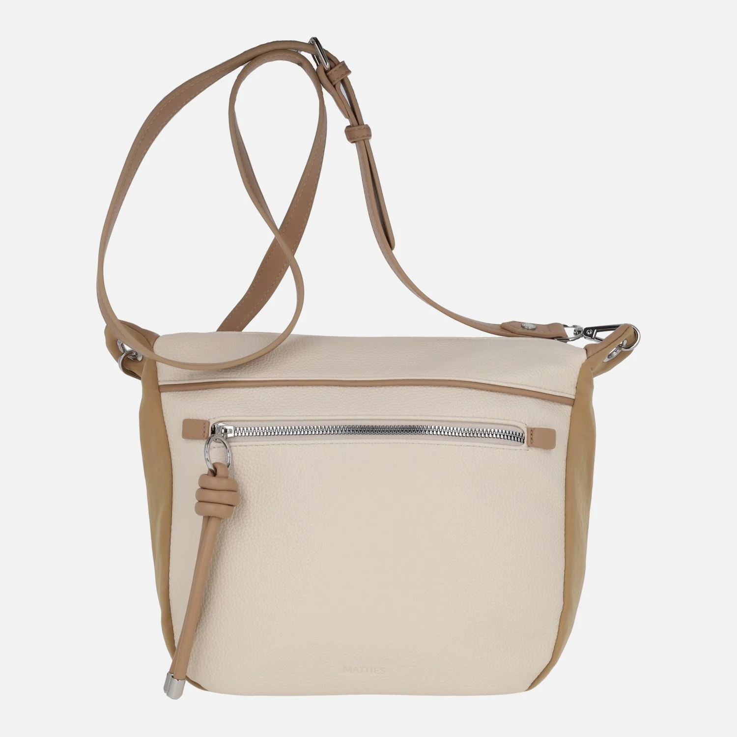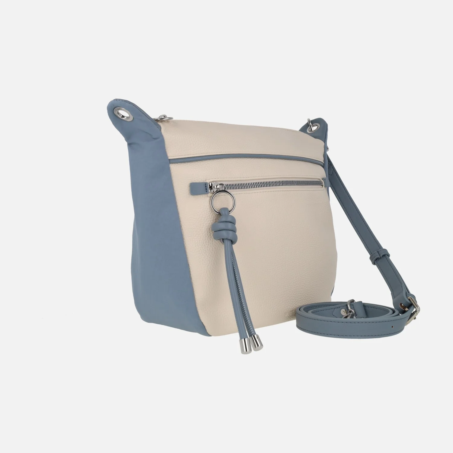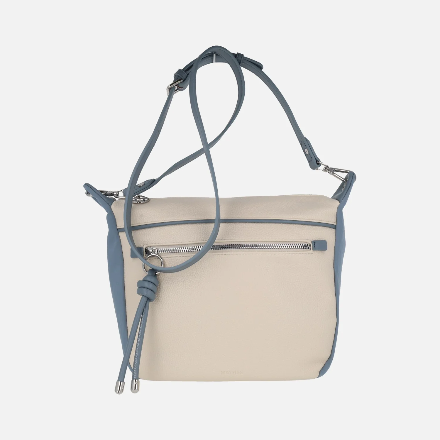 Bolsos bandolera Matties 20903 Enix. Bolsos elaborados en materiales sintéticos (polipiel) con acabado efecto piel. Bolsos bicolor, en beige combinado con azul o con camel. Bolsillos delantero y trasero con cremallera. Compartimento principal con cierre de cremallera. Interior textil con bolsillos, uno de ellos con cremallera. Asa extraíble y ajustable hasta 65 cm máximo al hombro. Medidas: 26 cm de alto x 26 cm de ancho inferior x 29 cm ancho superior x 14 cm de fondo.