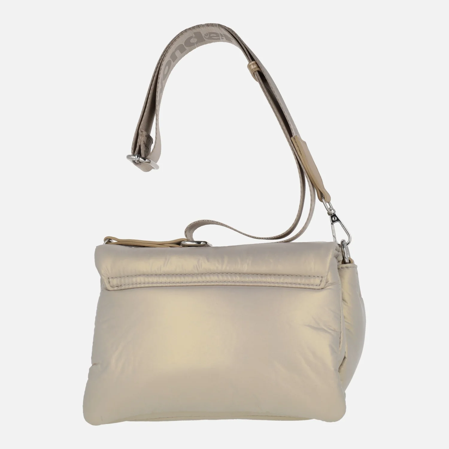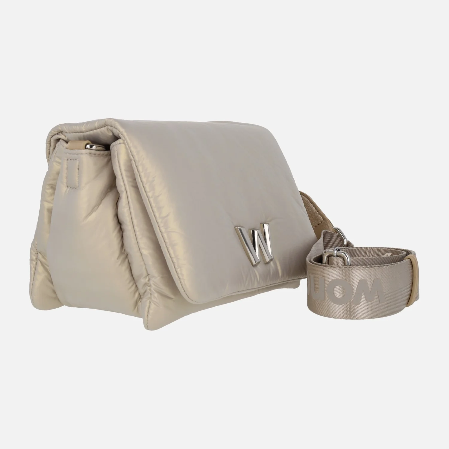 Bolsos bandolera de la marca Wonders modelo Cosy WB-512223 Platino. Bolsos elaborados en tejido nylon combinado con detalles en poliuretano, en color oro claro. Logo metálico de la marca en la parte delantera. Cierre de solapa imantada. Interior textil con tres compartimentos. Asa ajustable al hombro, con un máximo de 69 cms. Medidas: 15 cms de alto x 22 cms de ancho x 15 cms de fondo.