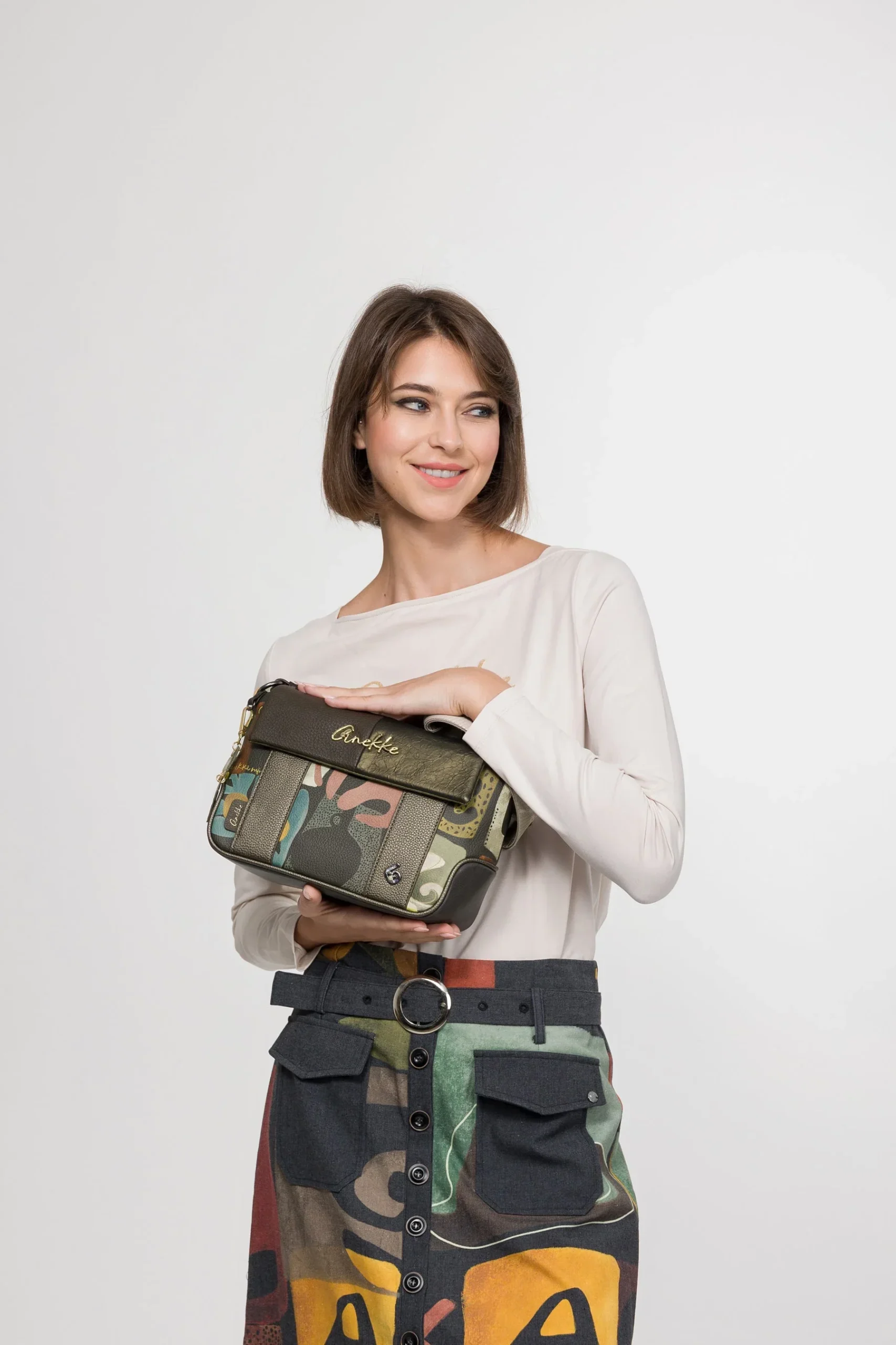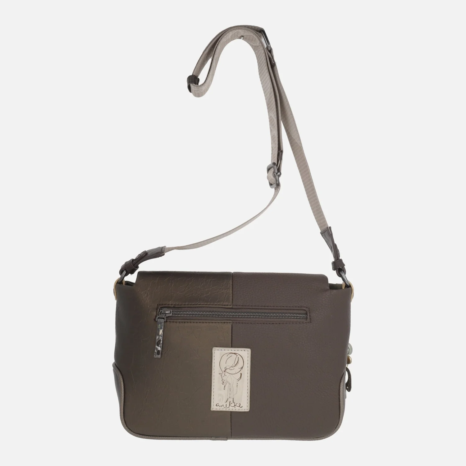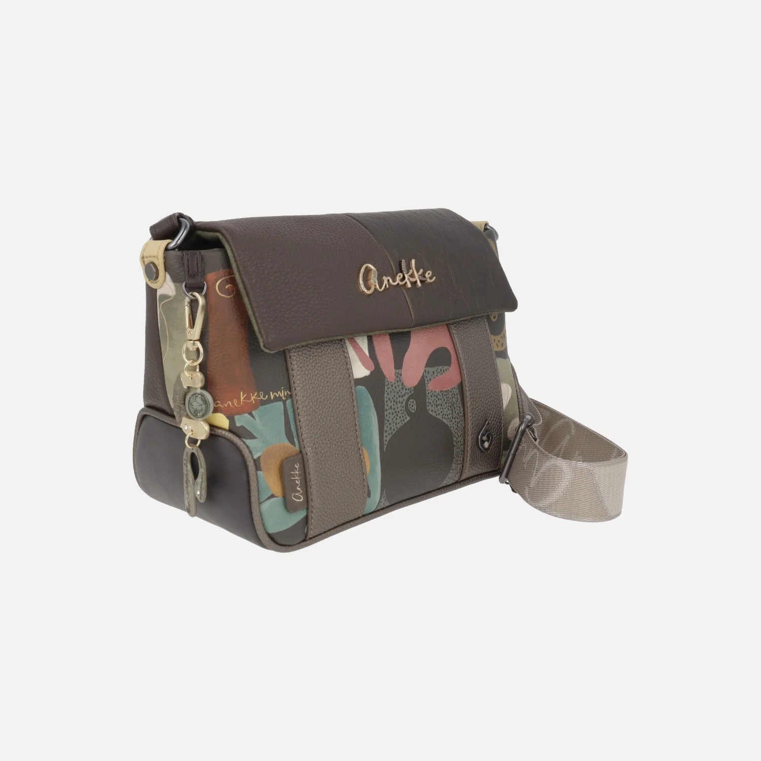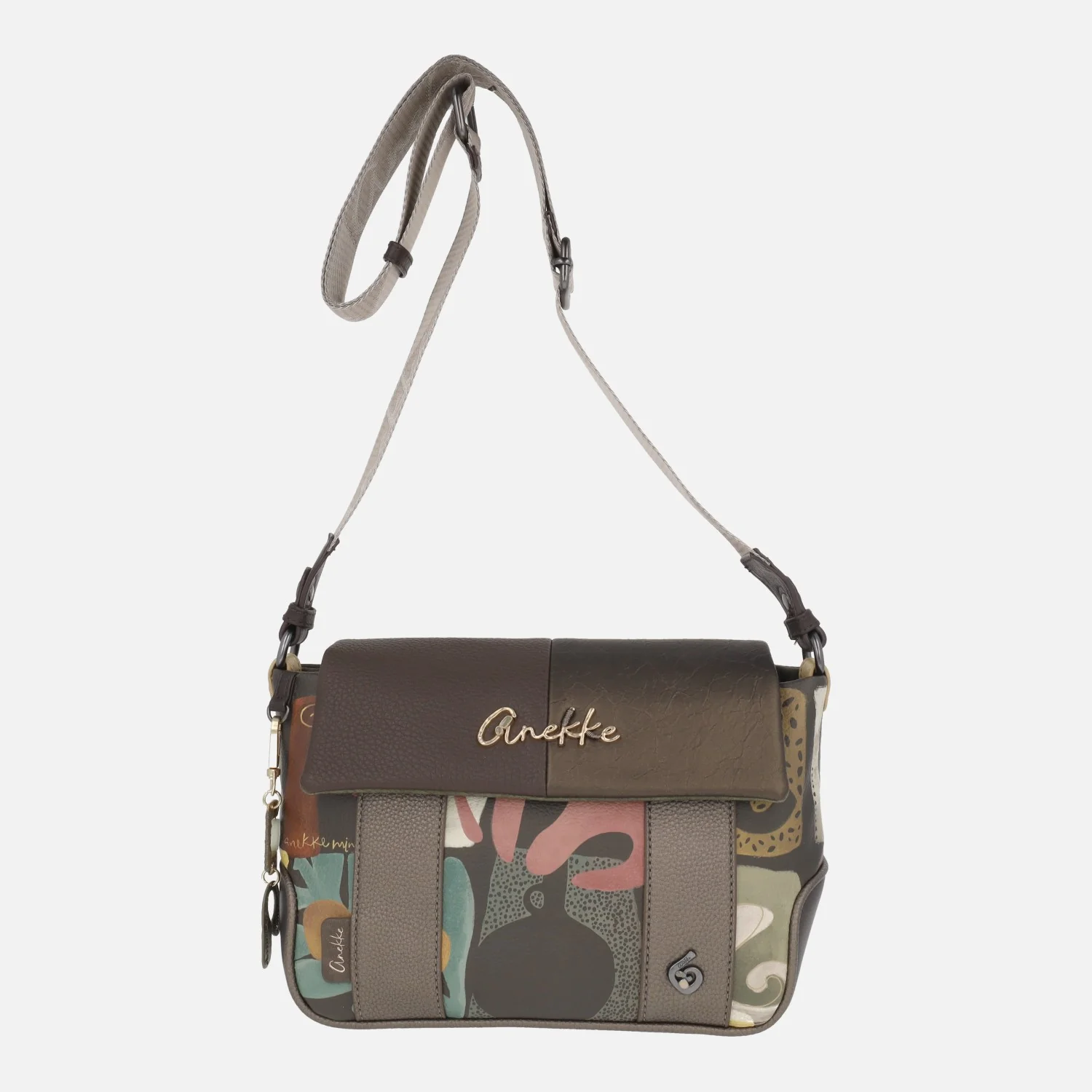 Preciosos bolsos bandolera de la marca Anekke modelo Amphora 42713-570. Bolsos con cierre de solapa y cremallera, elaborados en materiales sintéticos con un precioso estampado en tonos marrones y kakis predominantemente. Exterior 100% poliuretano. Interior textil con dos bolsillos, uno con cremallera. Asa bandolera ajustable con hebilla. Medidas: 18 cm de alto x 29 cm de ancho superior x 24 cm de ancho inferior x 12 cm de fondo. Logo metálico en la tapa.