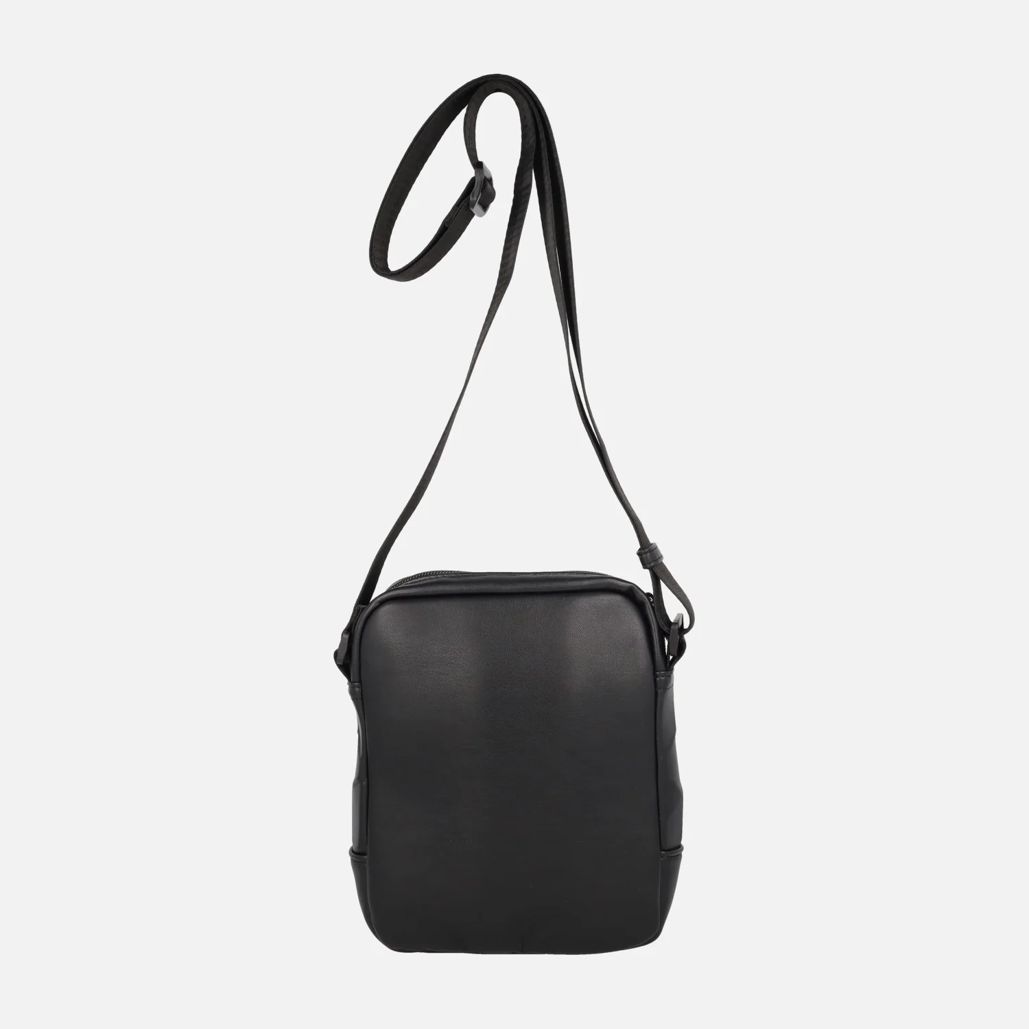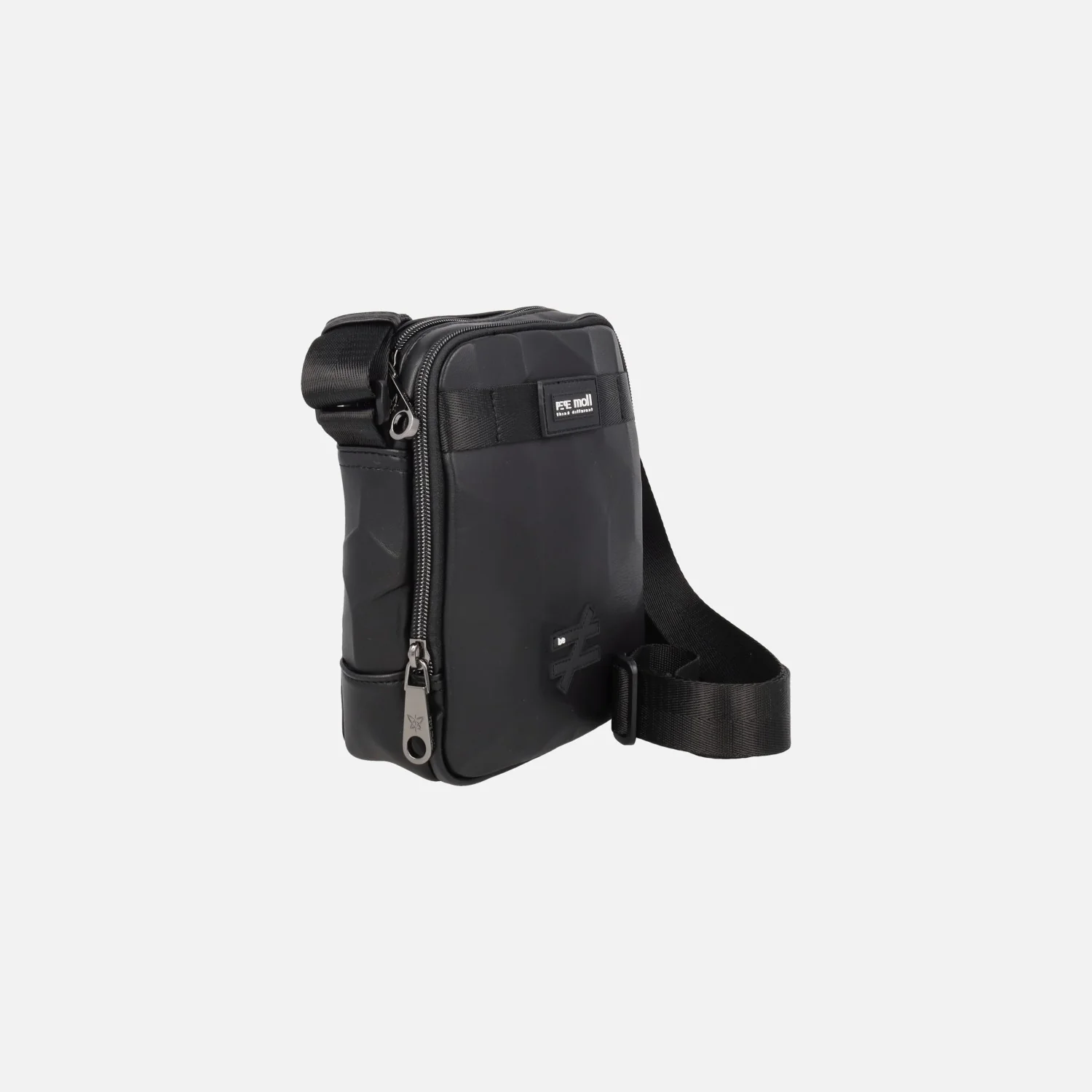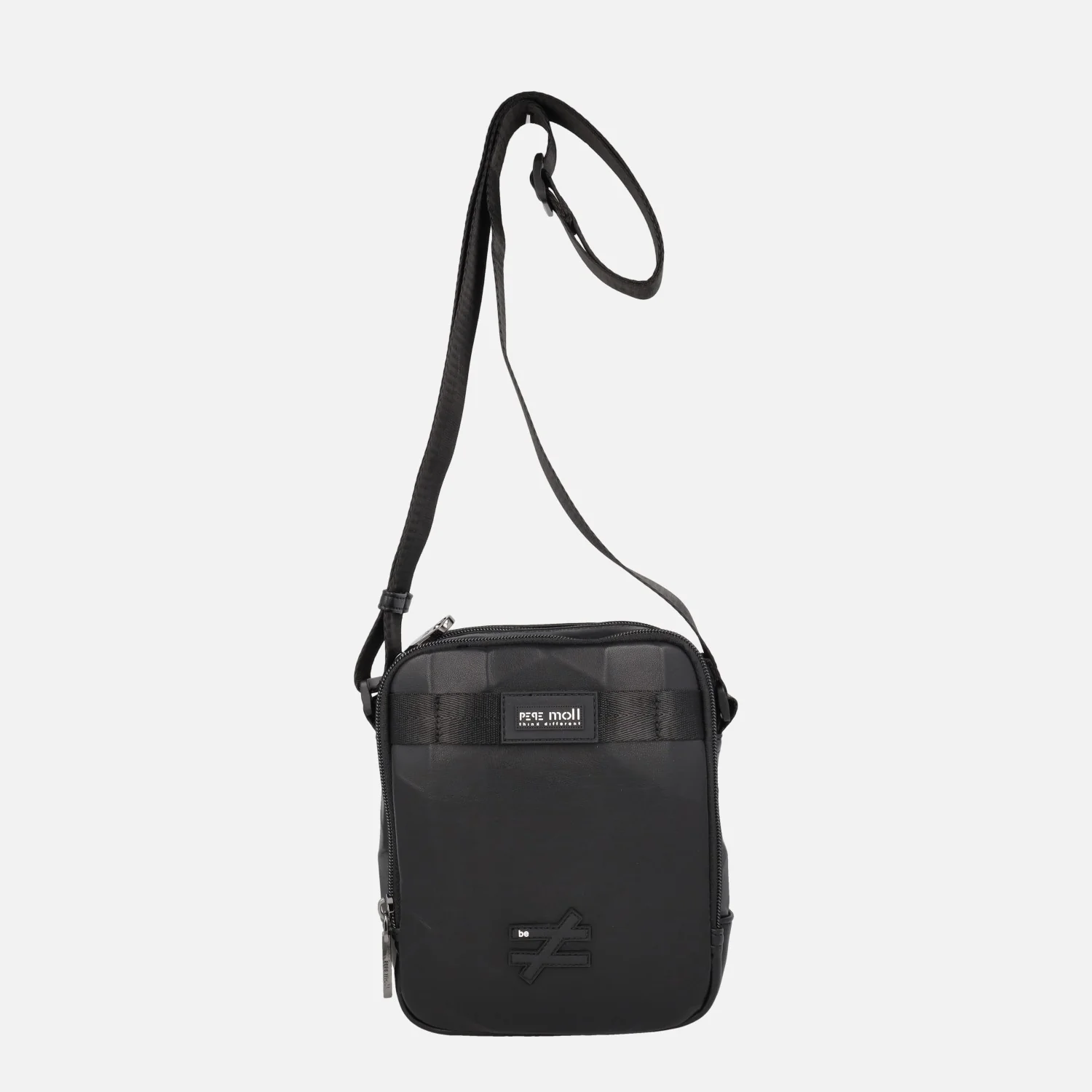 Bolsos bandolera estilo reportero para hombre marca Pepe moll modelo 252503 Adam black. Bolsos elaborados en materiales sintéticos veganos, 100% poliuretano, en color negro, con acabado geométrico y efecto piel. Dos compartimentos principales con cremallera. Interior textil con bolsillos. Asa ajustable para bandolera. Medidas: 20 cm de alto x 16 cm de ancho x 6 cm de fondo.