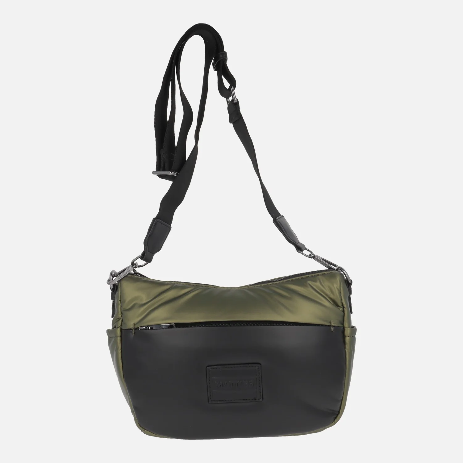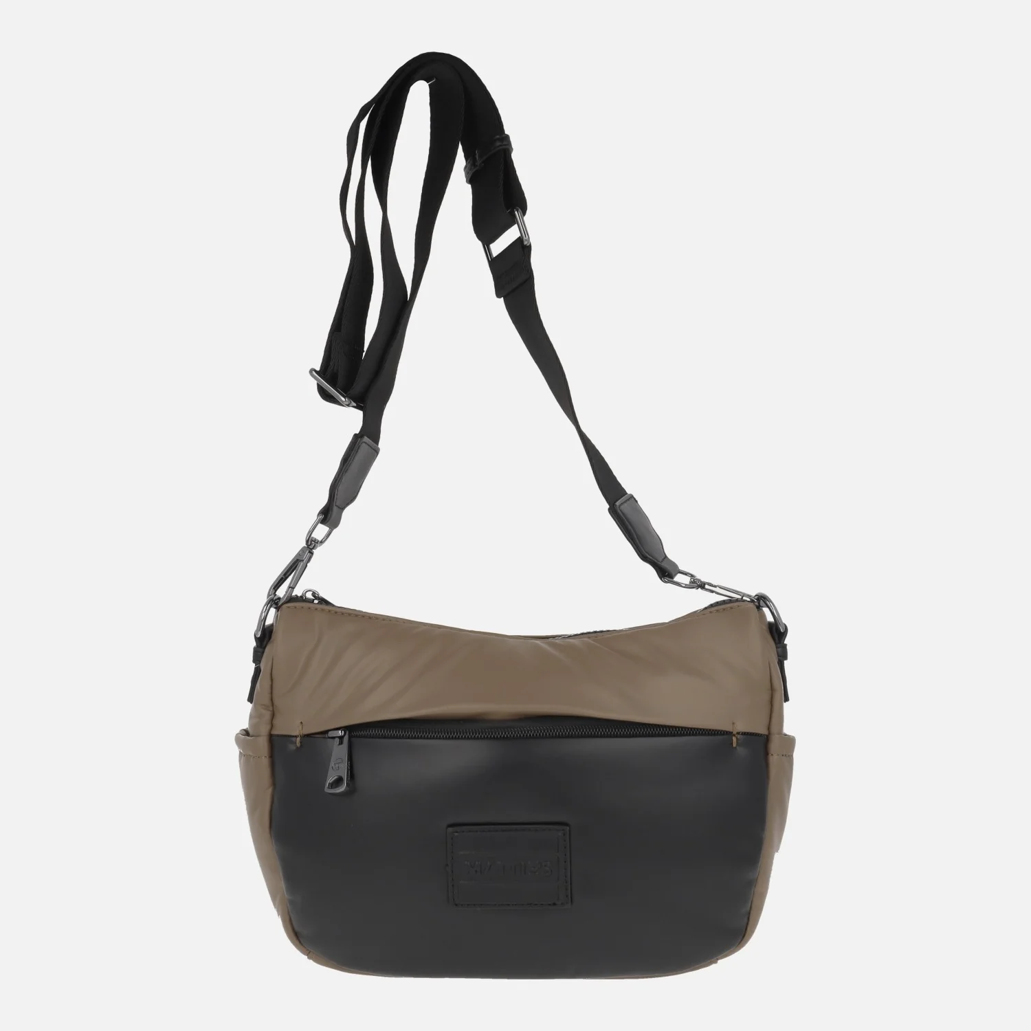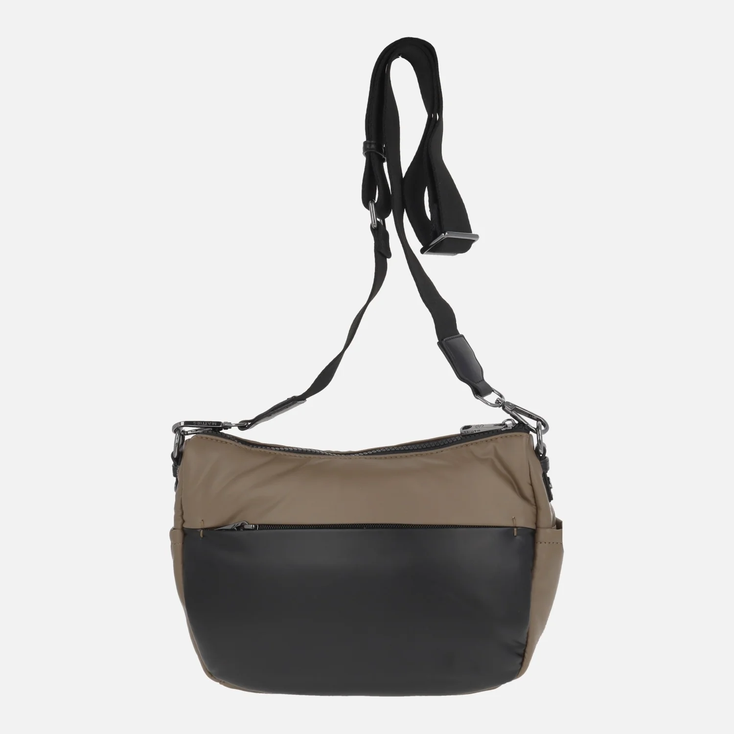 Bolsos bandolera marca Matties modelo 21001 línea Velside. Bolsos elaborados en materiales sintéticos y textiles, combinando negro con taupe o verde metalizados. Cierre principal de cremallera. Bolsillos delantero y trasero ambos con cremallera. Interior textil con bolsillos, uno con cremallera. Medidas: 17 cm de alto x 26 cm de ancho x 10 cm de fondo.