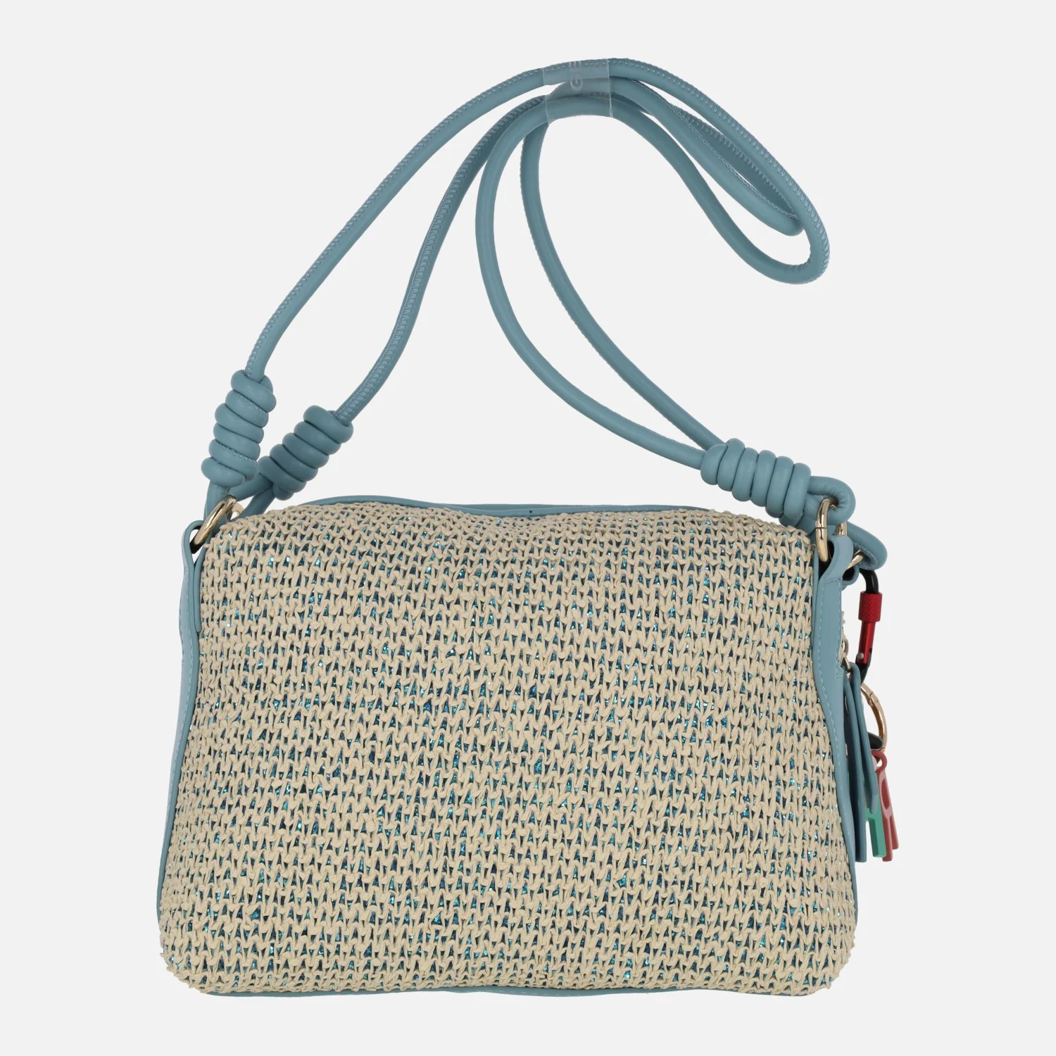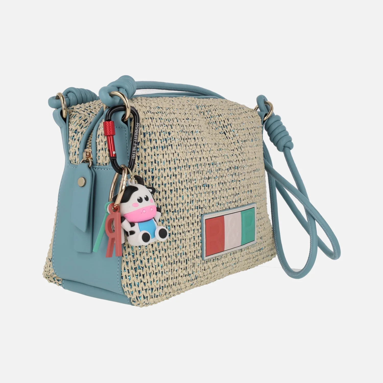 Bolsos Robert Pietri modelo 05387 línea Habana, disponibles en combinado azul turquesa y en combinado beige/cuero. Bolsos elaborados en PU, con forro de poliéster. Acabado rafia brillo. Dos asas para hombro de 38 cm. Cierre de cremallera. Adorno de llavero de vaca y letras iniciales de la marca. Interior textil con bolsillos, uno de ellos con cremallera. Medidas: 19 cm de alto x 27 cm de ancho inferior x 24 cm de ancho superior x 13 cm de fondo.