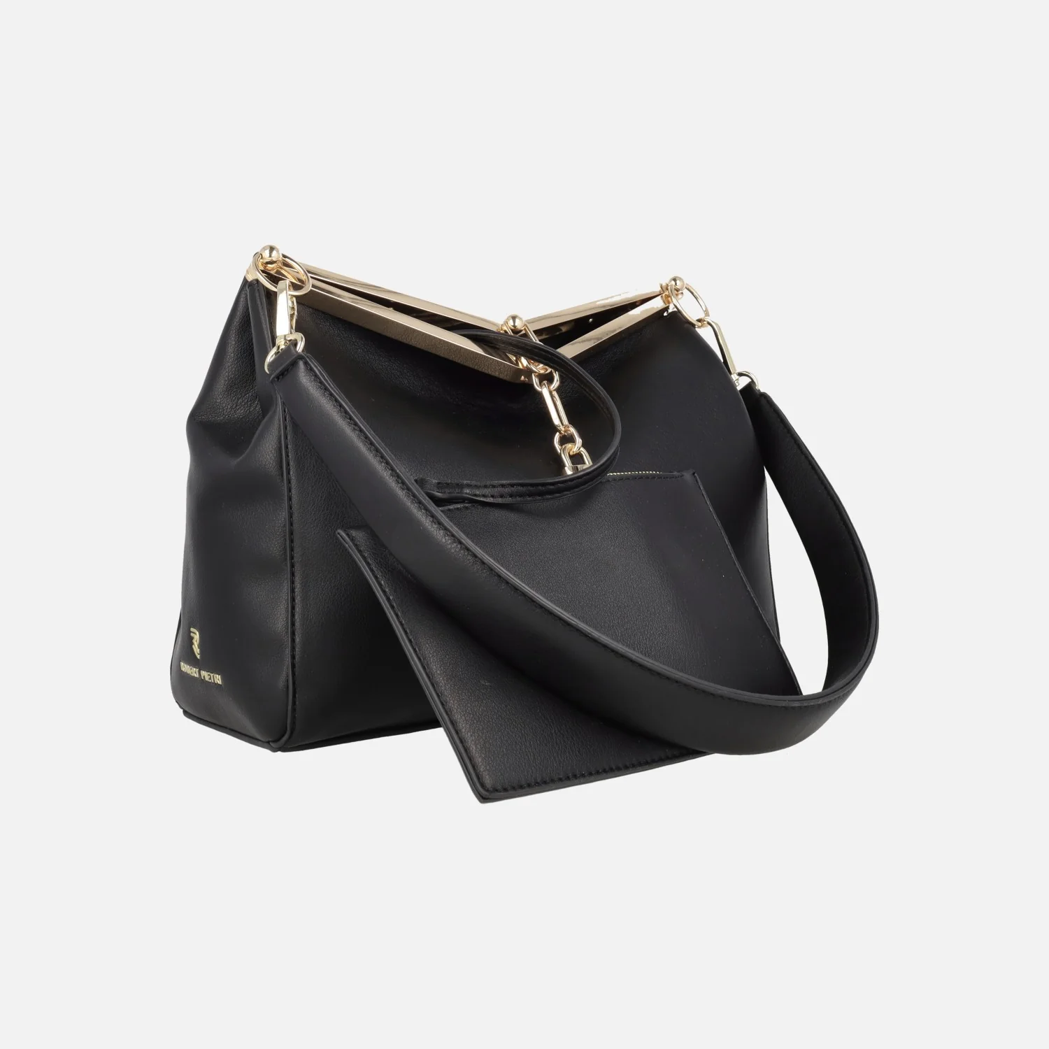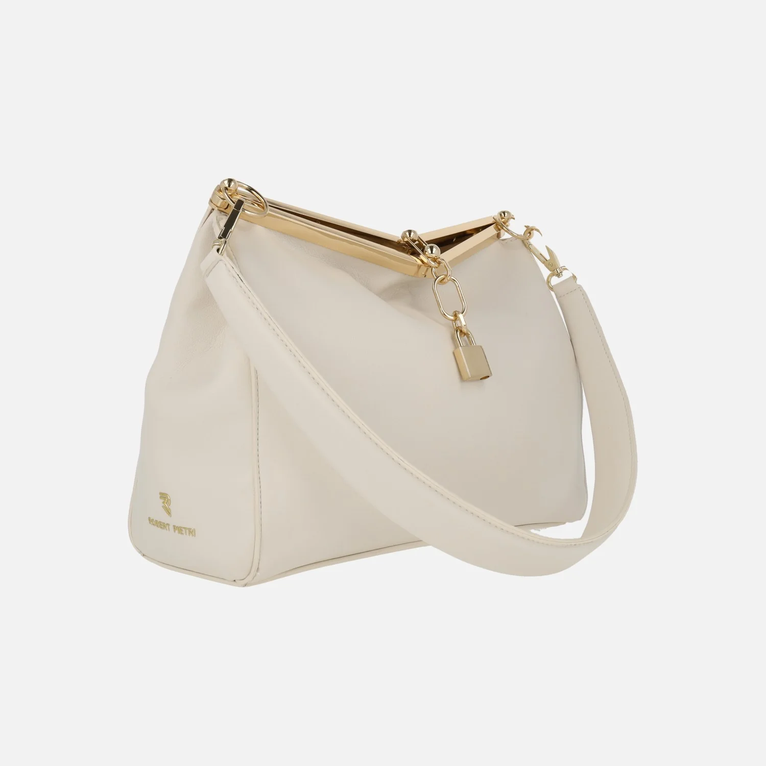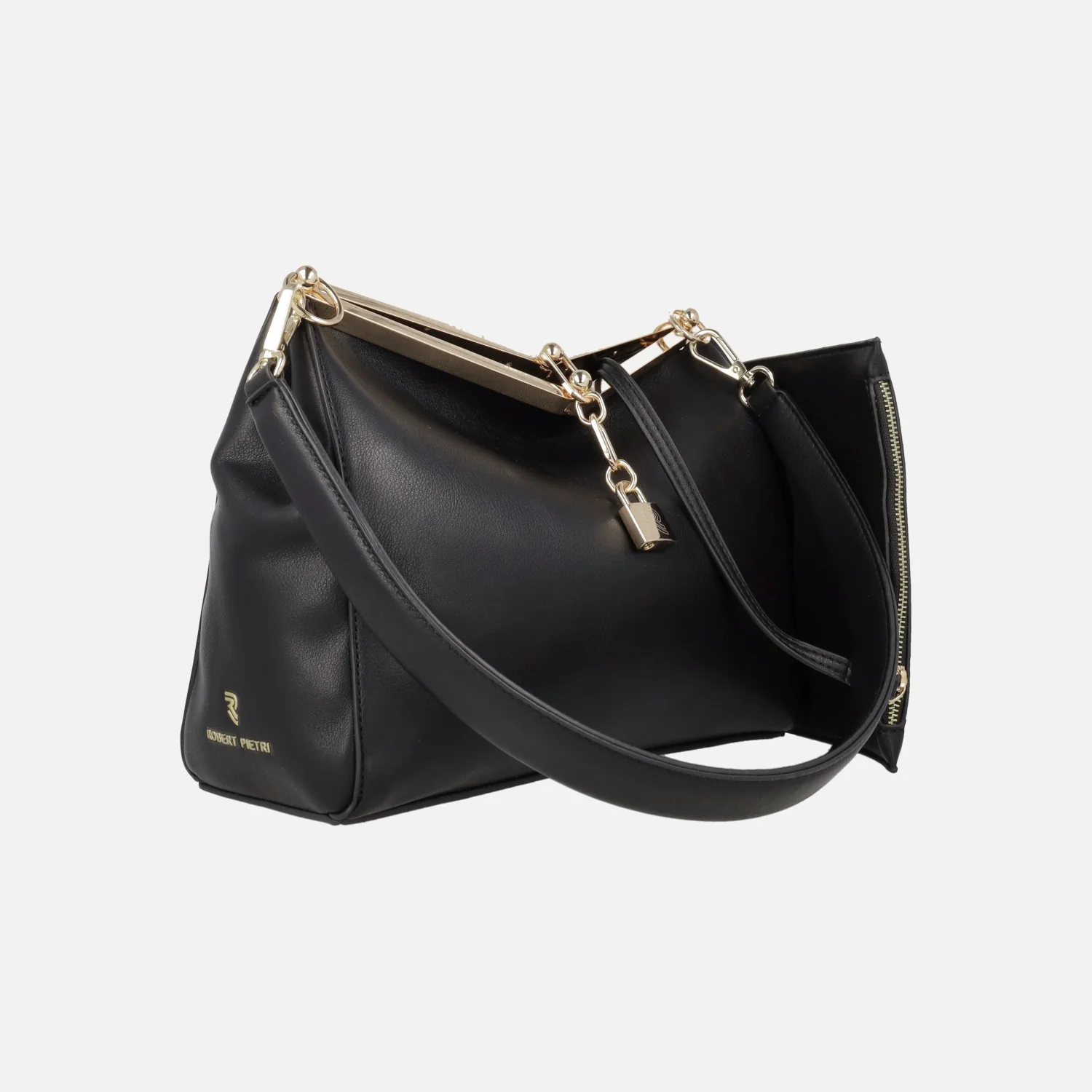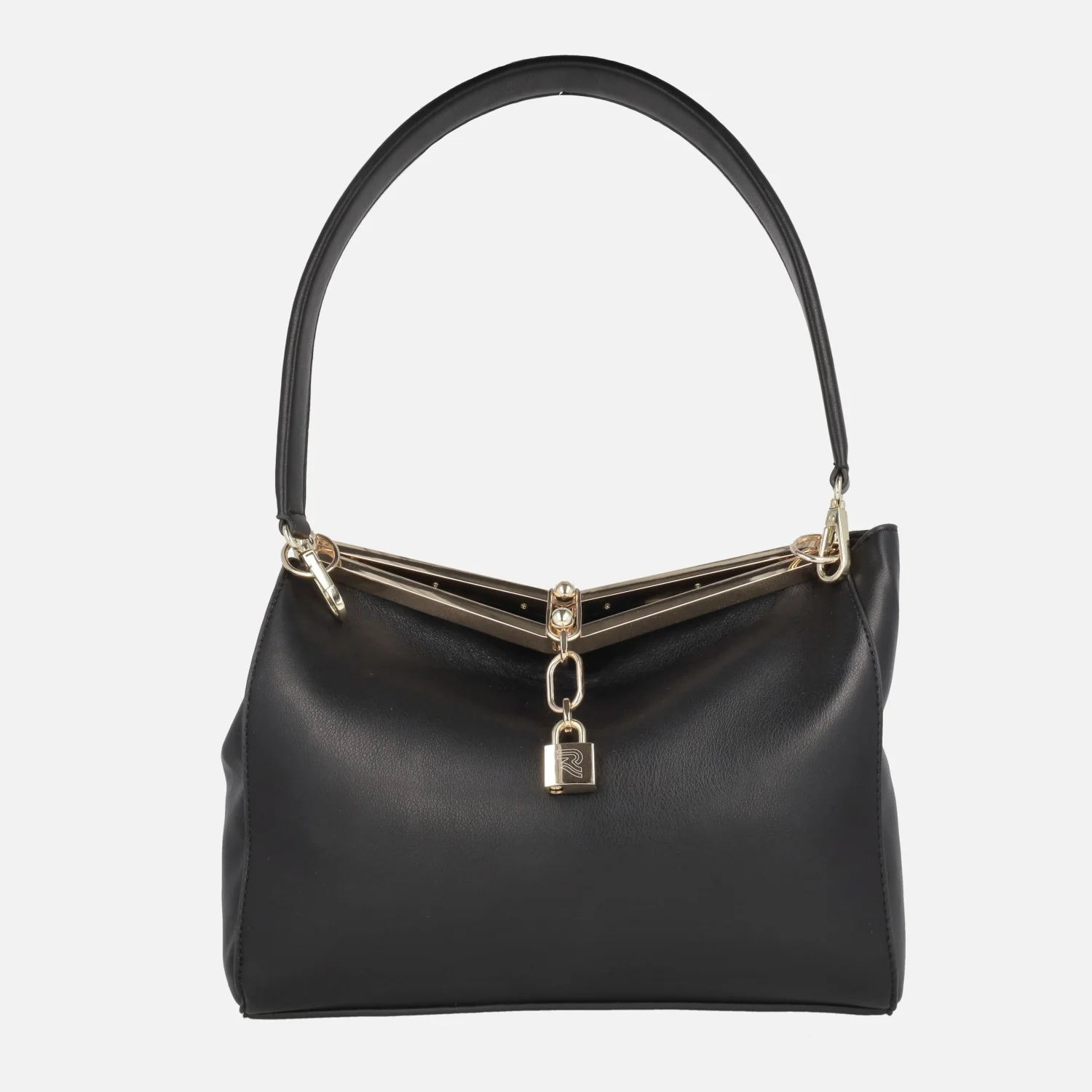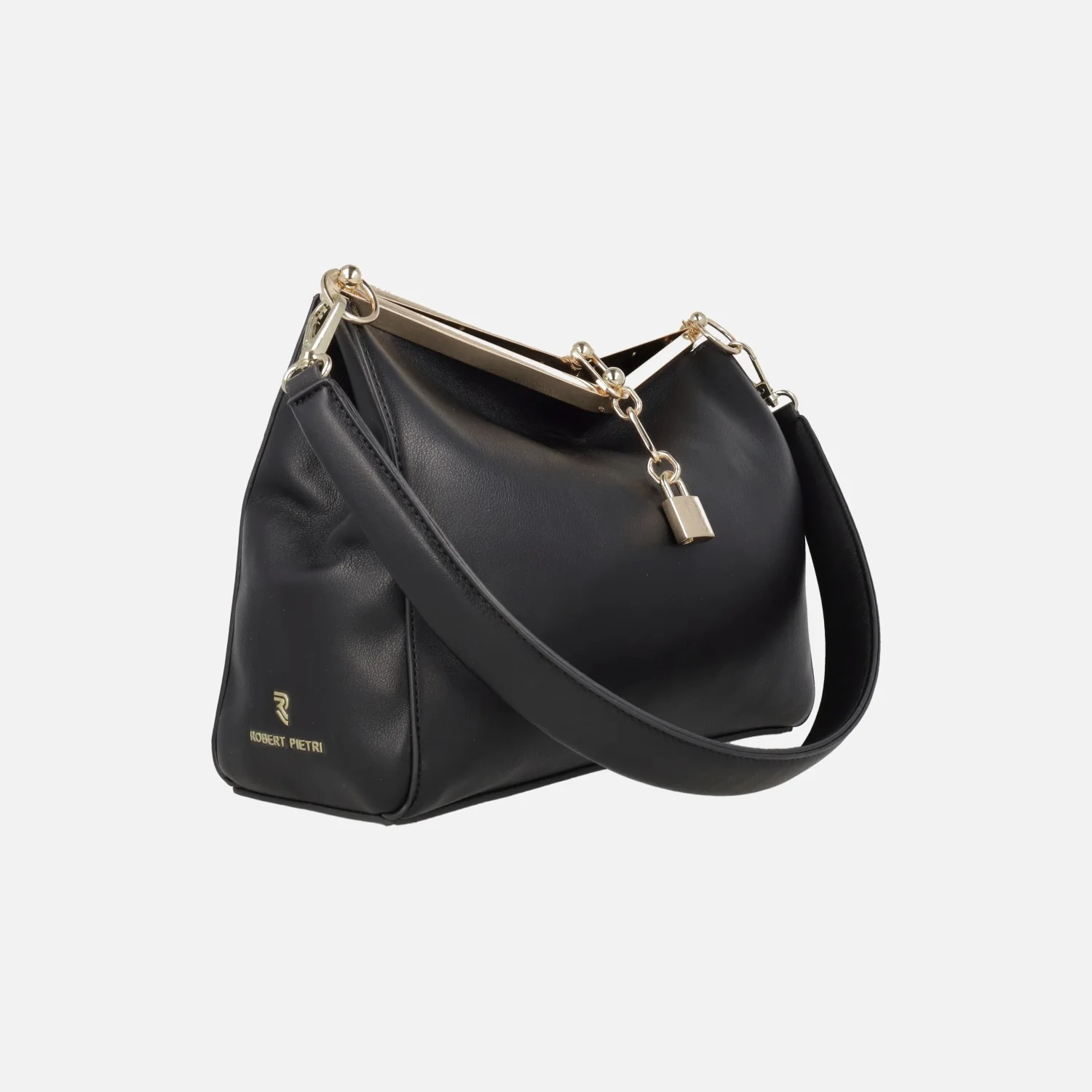 Elegantes bolsos de hombro de estilo clásico marca Robert Pietri, modelo 03380 Fresa, disponibles en negro y en beige clarito. Bolsos elaborados en materiales sintéticos efecto piel con cierre de broche metálico y adorno de candado. Interior textil de aspecto piel, con un monedero extraíble. Asa extraíble para hombro de 28 cm. Medidas: 22 cm de alto x 26,5 cm de ancho x 10 cm de fondo.