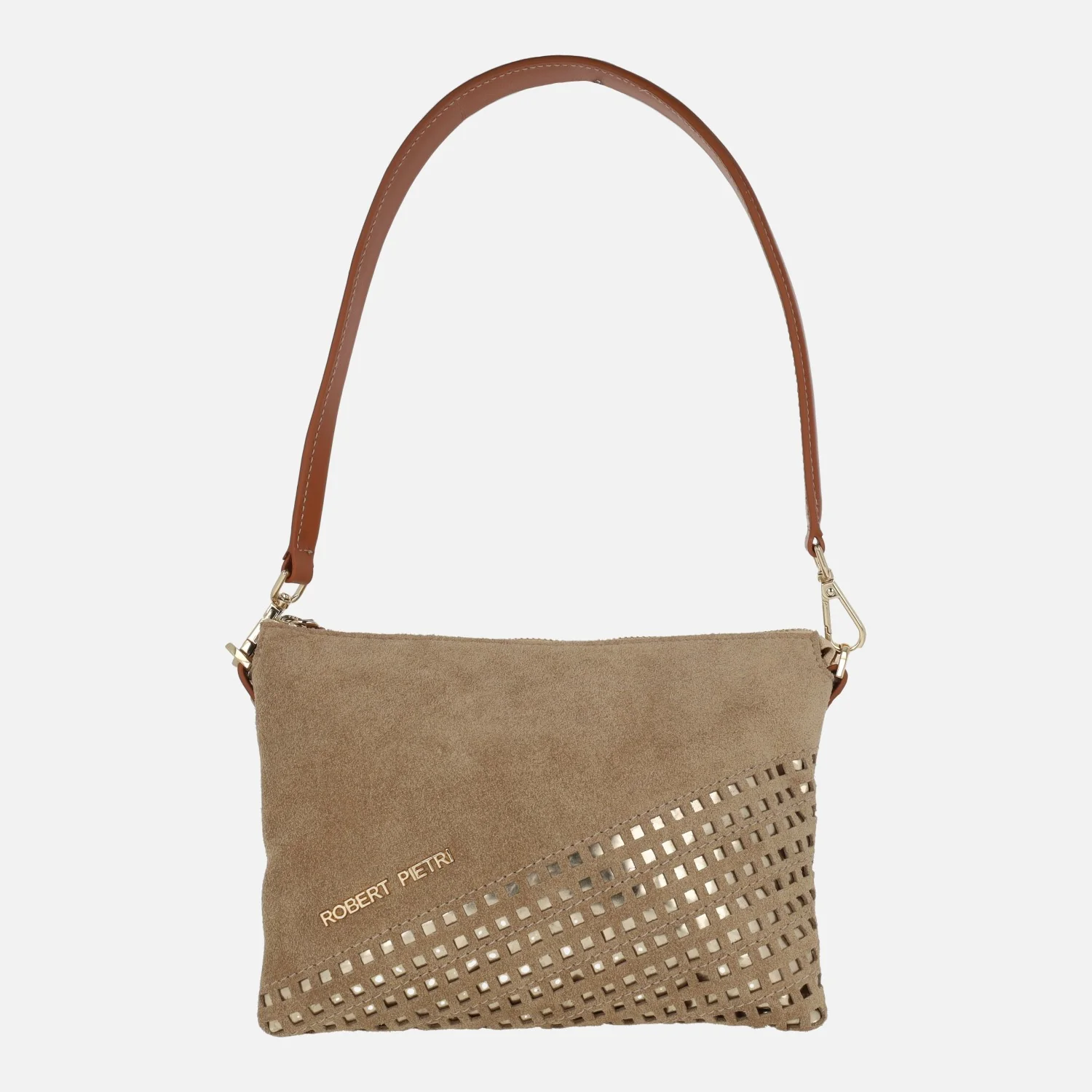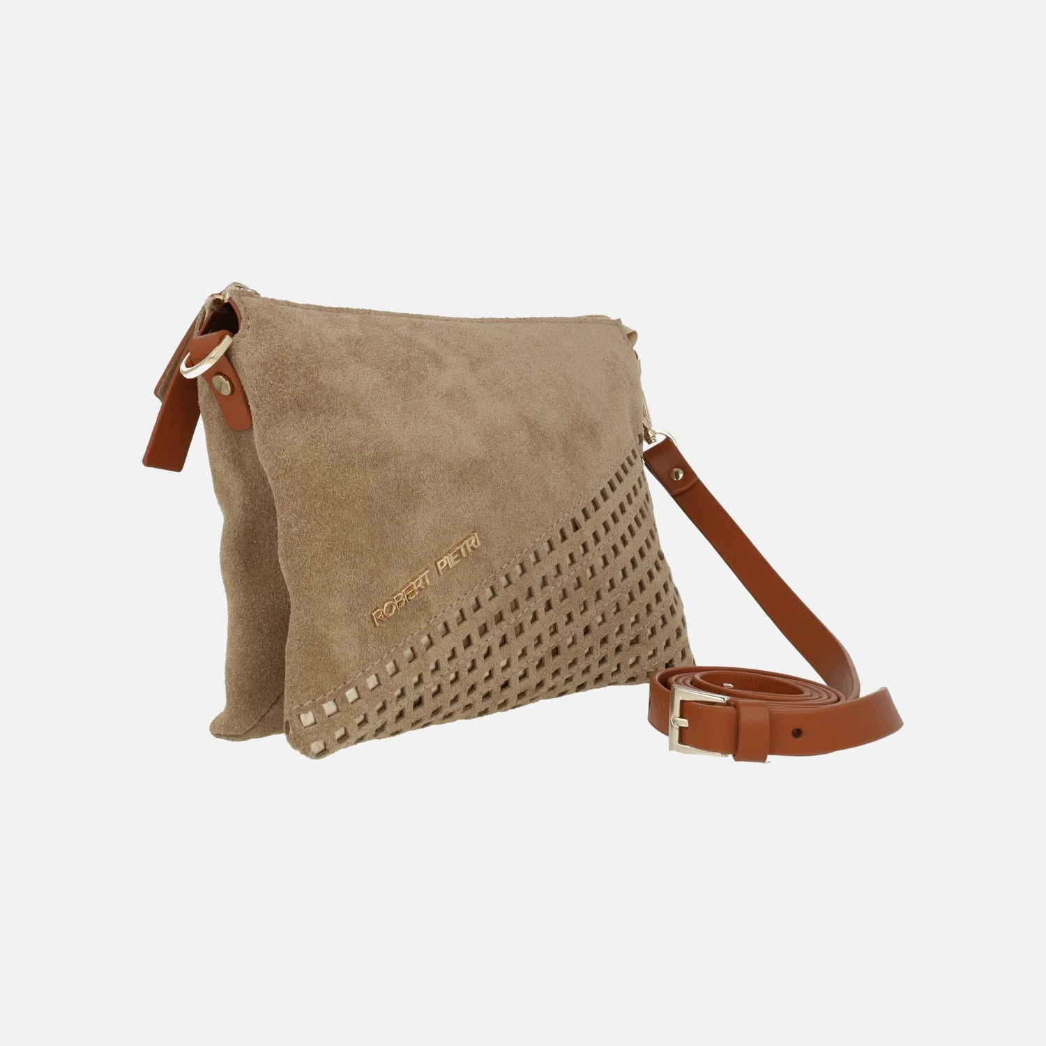 Bolsos Robert pietri colección piel, modelo 01199 arena, línea Marcela. Bolsos elaborados en piel ante color camel, con detalles en metalizado dorado. Cierre principal de cremallera. Un compartimento, con forro textil. Dos asas: por un lado un asa extraíble para hombro y por otro asa bandolera ajustable y extraíble, a un máximo de 65 cm al hombro. Medidas: 19 cm de alto x 24 cm de ancho x 6,5 cm de fondo.
