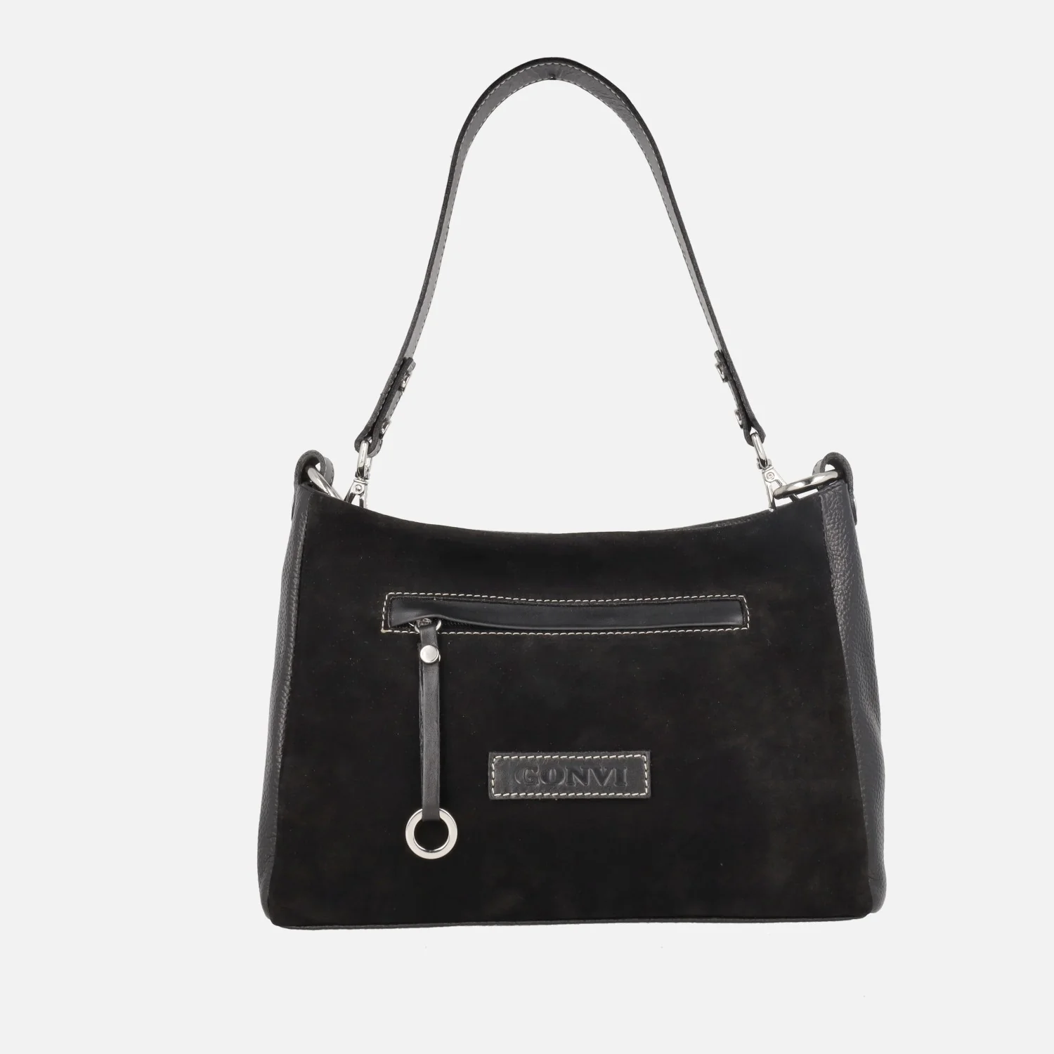 Preciosos bolsos de piel de la marca Gonvi modelo 307, disponibles en negro, verde kaki y en cuero. Bolsos que combinan piel en la parte trasera y serraje en la delantera. Cierre principal de cremallera, así como los bolsillos delantero y trasero. Un asa para hombro, otra para bandolera. Interior textil, con bolsillos interiores. Medidas: 20 cm de alto x 28 cm de ancho x 11 cm de fondo.
