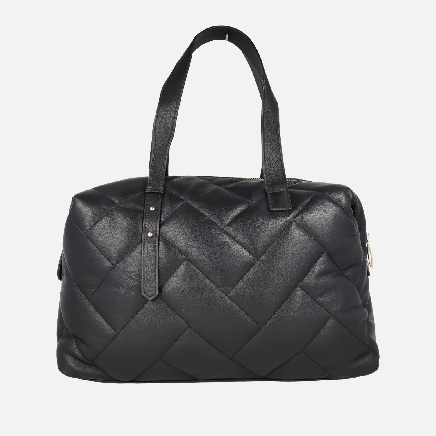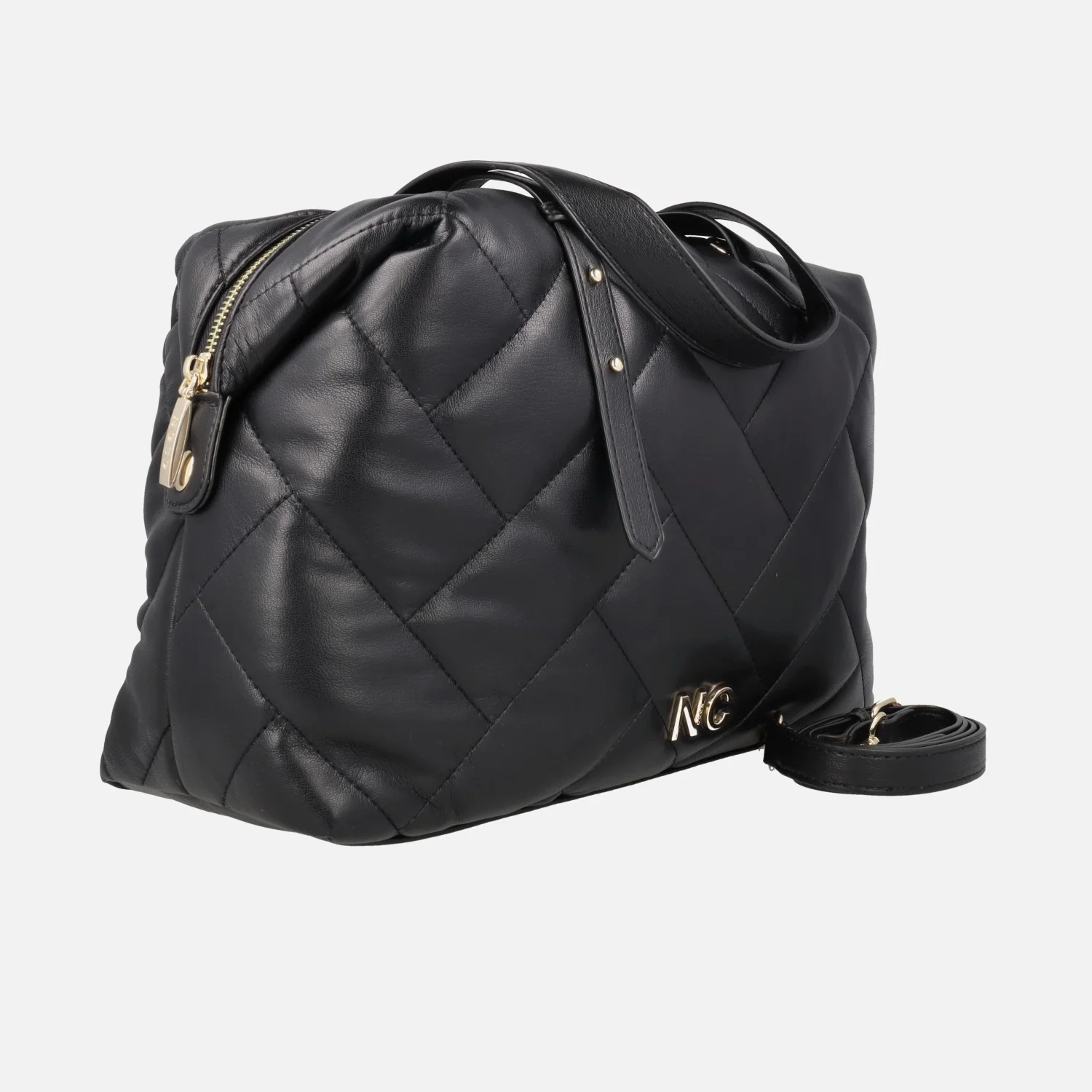Bolsos estilo bowling de la marca Noco, modelo 2425610N, disponibles en negro. Bolsos elaborados en piel vegana (sintética) efecto acolchado, con cierre principal de cremallera. Letras NC metálicas, formando el logo en la parte delantera. Lleva un adorno con borlas y letras que se puede poner o sacar. Interior textil con bolsillos. Dos asas fijas en la parte superior ajustables con broche o botón entre 18 y 21 cms de altura al hombro. Incluye un asa bandolera ajustable con hebilla entre 48 y 58 cms de alto. Medidas aproximadas: 23 cms de alto x 28 cms de ancho x 14 cms de fondo.