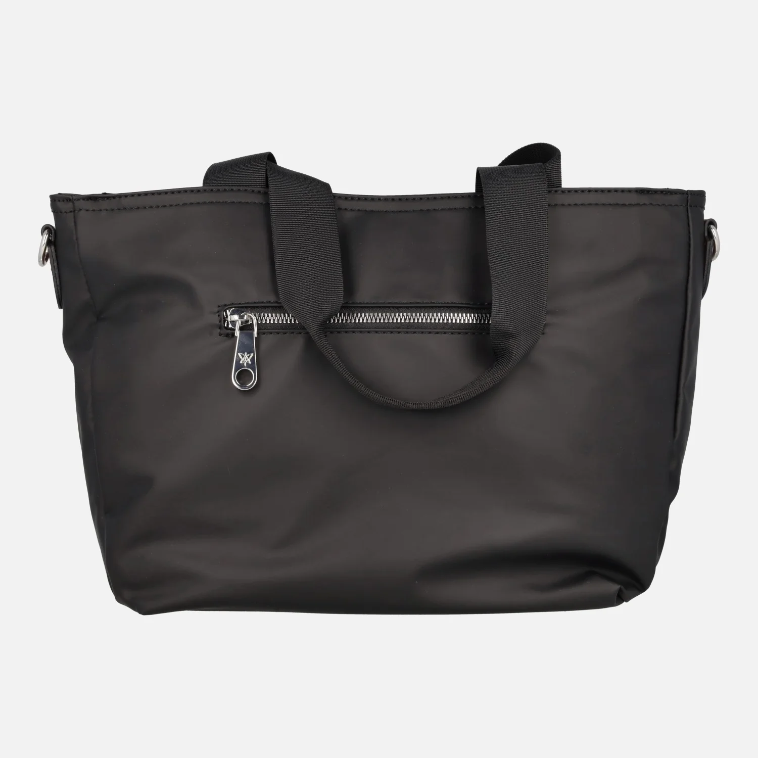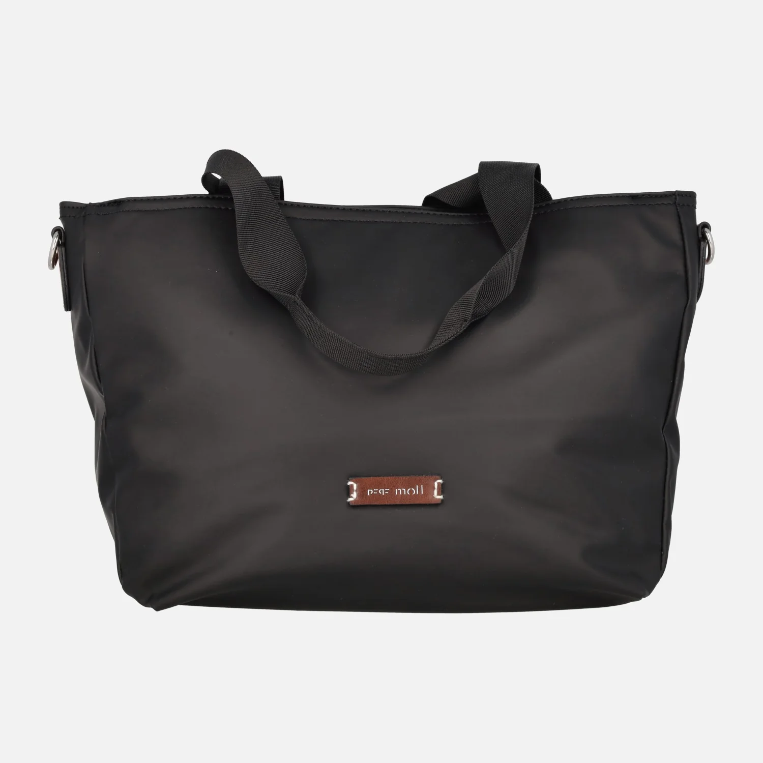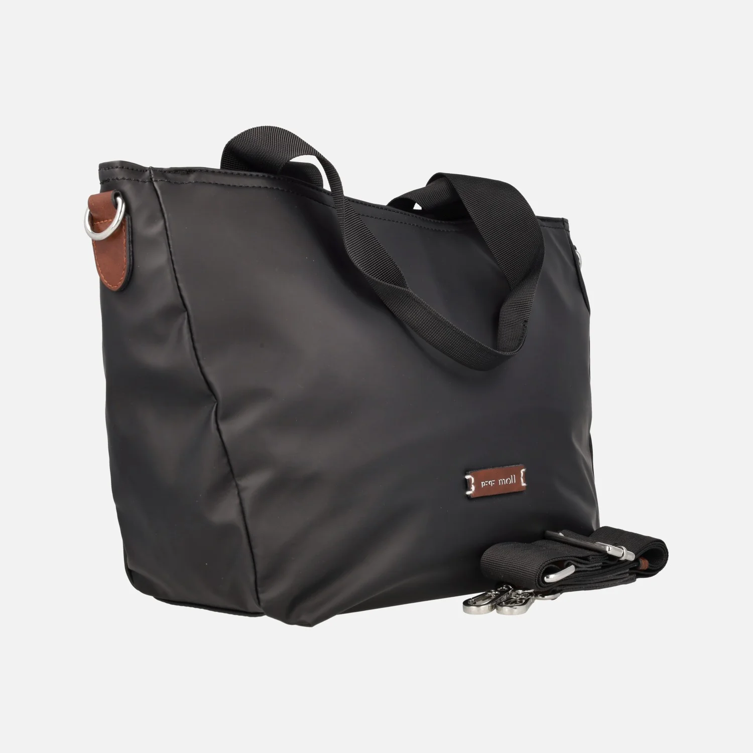 Bolsos estilo shopping de la marca Pepe Moll modelo 242291 Negro. Bolsos elaborados en tejido negro (vegano), con dos asas textiles en la parte superior. Cierre principal de cremallera. Asa bandolera regulable incluida. Bolsillo trasero con cremallera. Detalles en marrón, logo frontal. Interior textil con bolsillos. Asas fijas de una altura de 22 cms al hombro. Asa bandolera regulable de 48 a 70 cms al hombro. Medidas aproximadas del bolso: 27 cms de alto x 38 cms de ancho en la parte superior (29 cms en la inferior) x 13 cms de fondo.