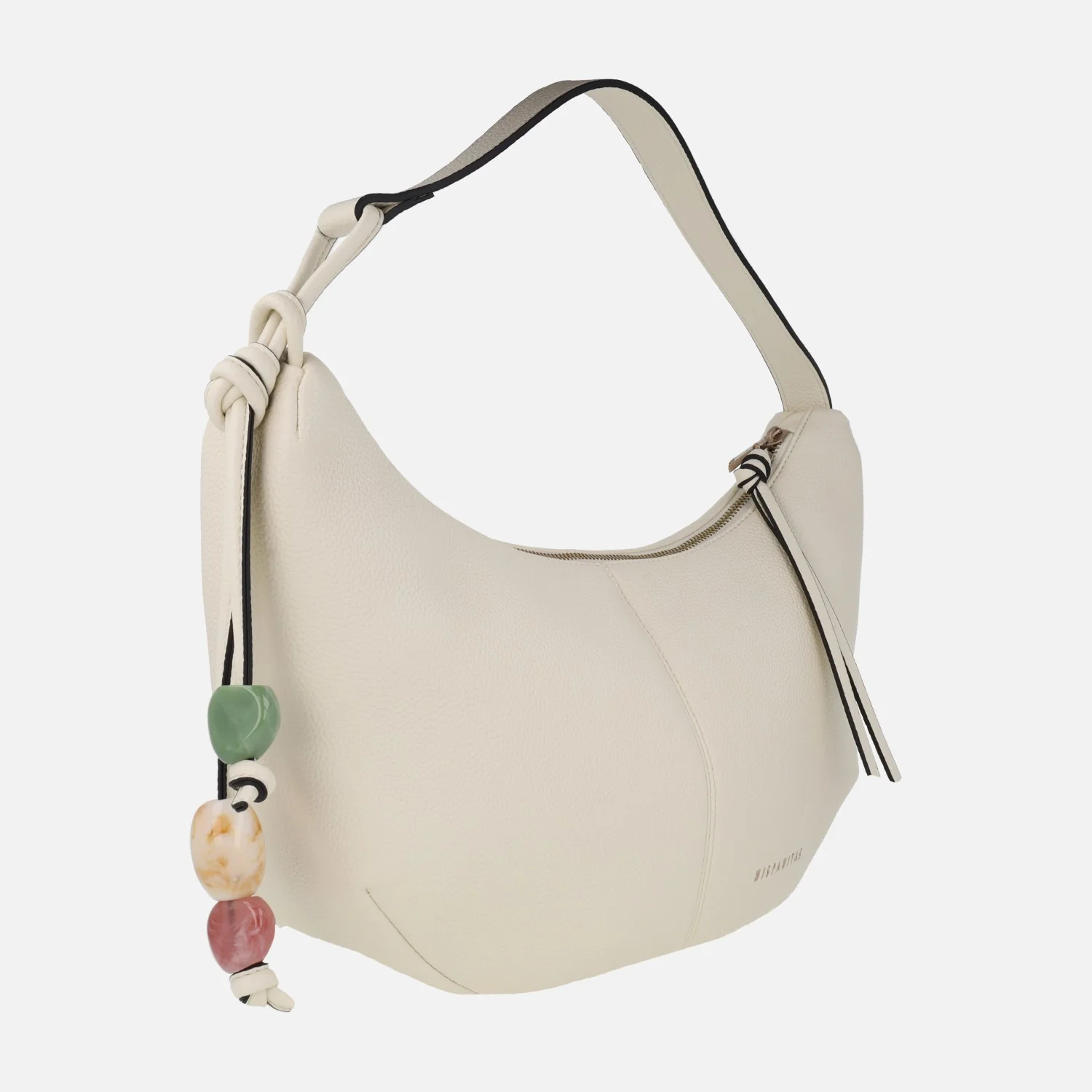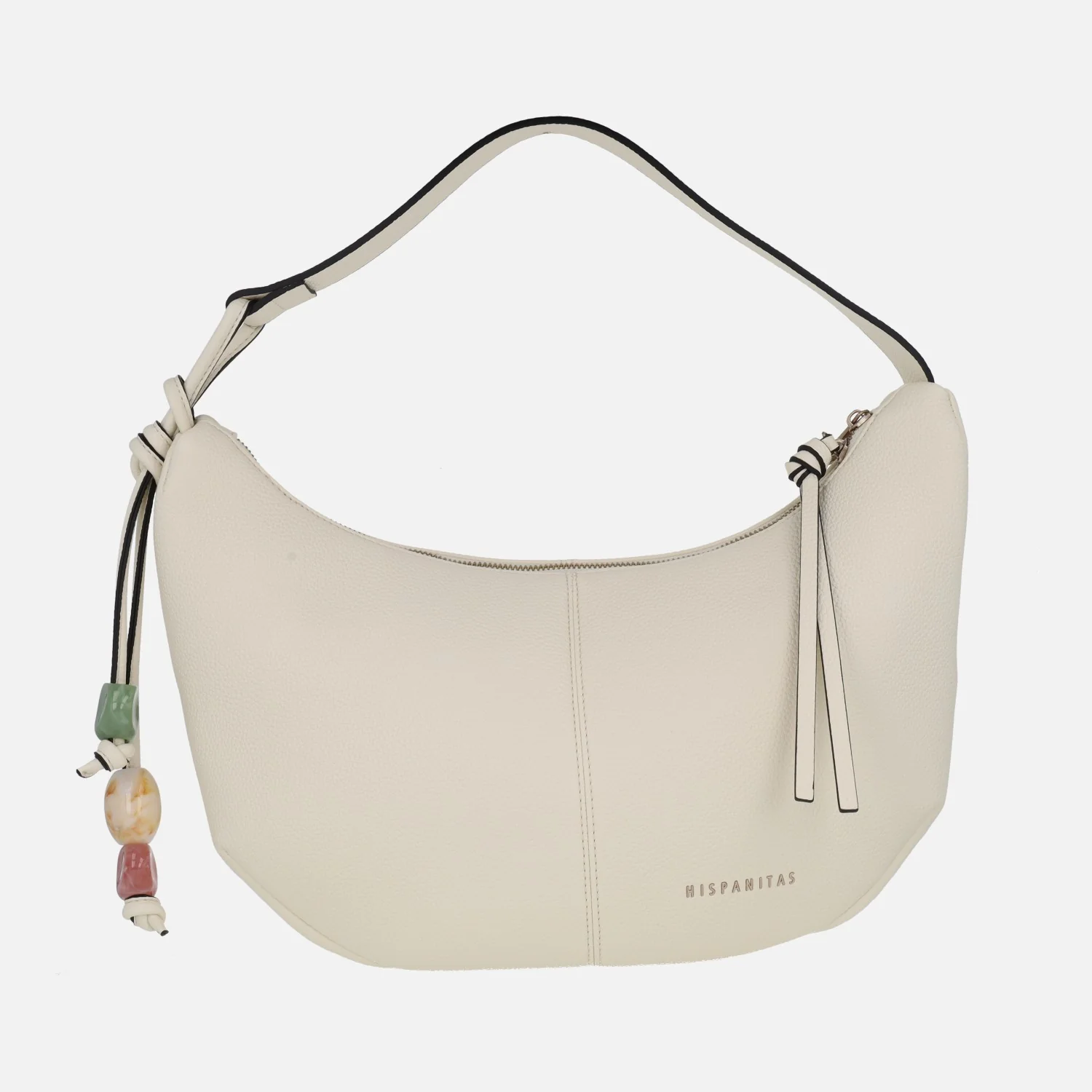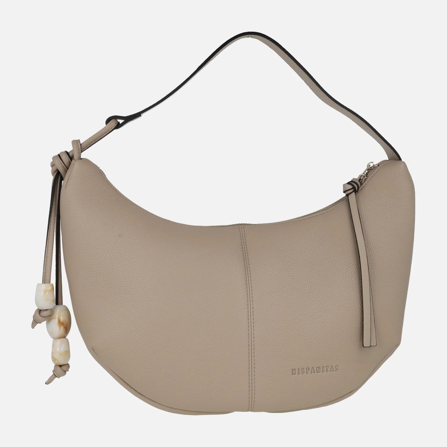Preciosos bolsos Hobo de Hispanitas modelo BV253974, disponibles en latte (beige muy clarito) o taupe. Bolsos estilo góndola, elaborados en materiales sintéticos efecto piel (poliuretano). Cierre principal de cremallera. Adorno lateral emulando piedras naturales (plástico). Interior textil con varios bolsillos, uno de ellos con cremallera. Medidas aproximadas: 27 cms de alto por los lados (21 cms en la parte central) x 39 cms de ancho superior x 33 cms de ancho inferior x 9 cms de fondo. Asa al hombro de 22,5 cms de altura.