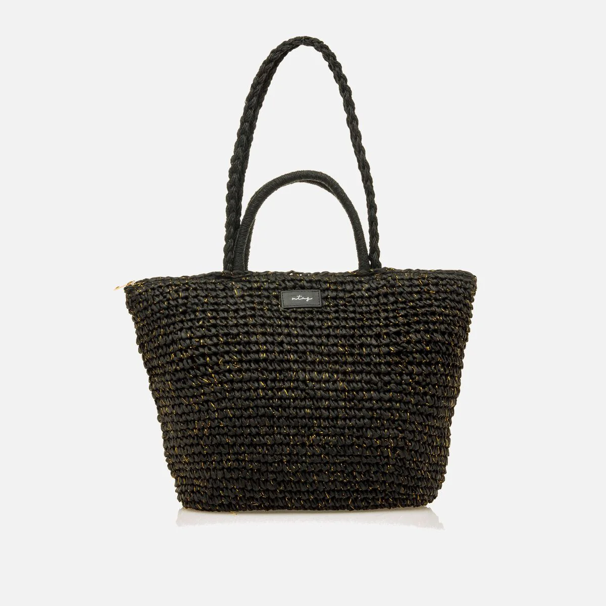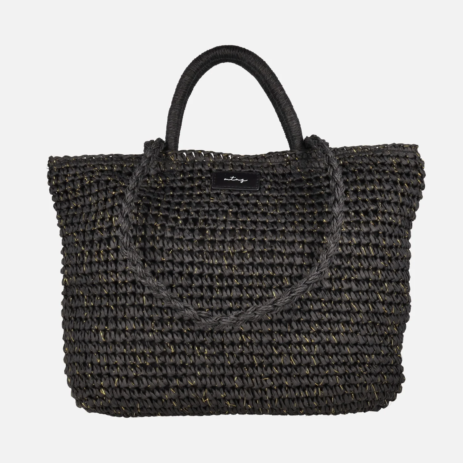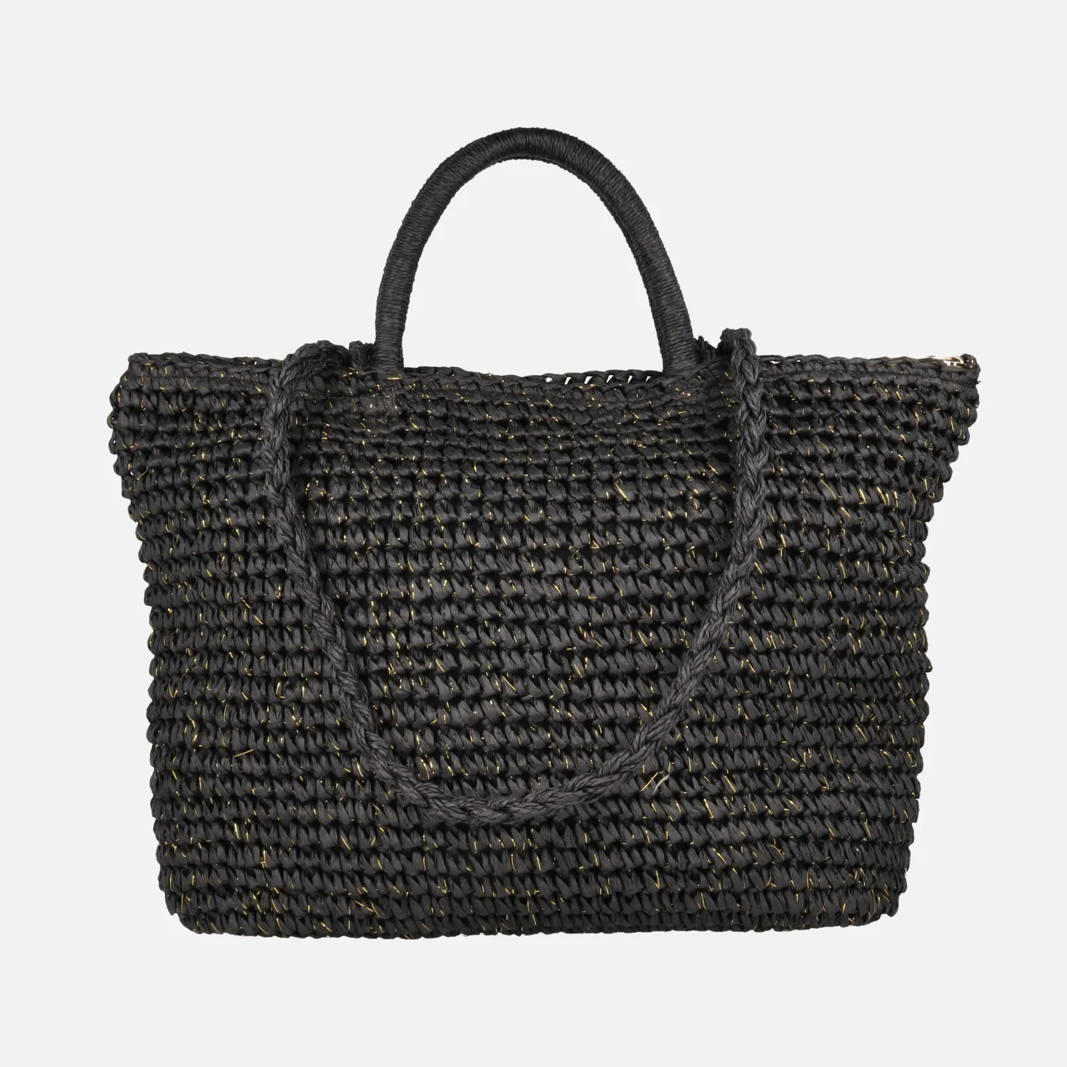 Bolsos estilo shopper para mujer de la marca Mustang modelo Lewis Negro. Bolsos de rafia en color negro con brillos dorados, cierre central de cremallera. Logo MTNG de Mustang en la parte frontal. Interior textil en tejido poliéster, con bolsillo central. Dos asas cortas para llevar de mano y dos asas trenzadas más largas para llevar al hombro (28 cms de largo). Medidas: 34 cms de alto x 40 cms de ancho