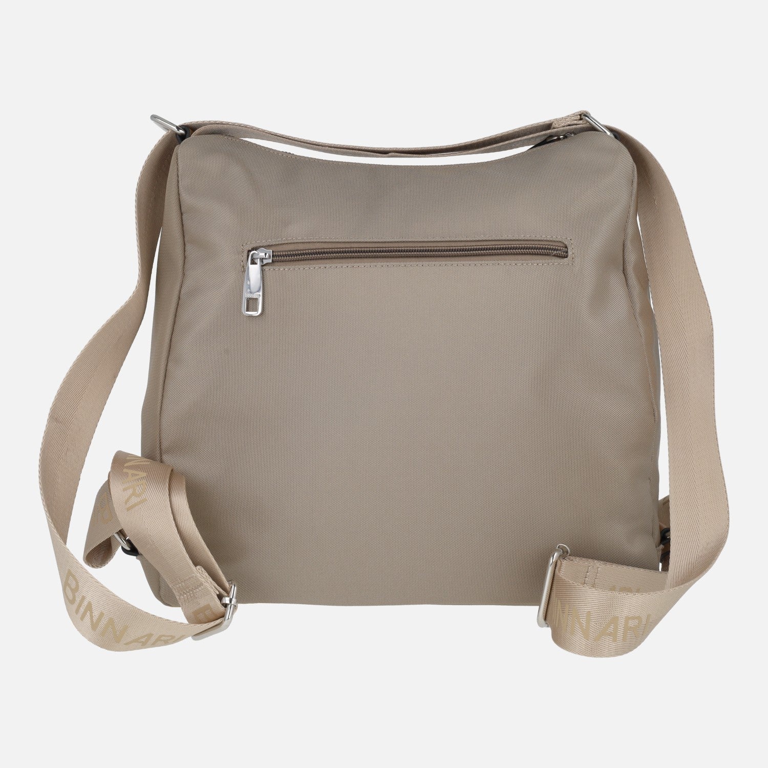 Bolsos mochila de la marca Binnari modelo 20492, disponibles en negro y en camel (color de fábrica camel pero es más bien un taupe). Bolsos elaborados en tejido nylon reciclado y detalles de PU. Bolsillos delanteros y trasero con cremallera. Compartimento principal con cremallera. Interior textil con bolsillos. Asas ajustables para llevar al hombro o de mochila. Medidas: 33,5 cm alto exterior x 32 cm alto central x 34 cm ancho inferior x 30 cm ancho superior x 14 cm de fondo.