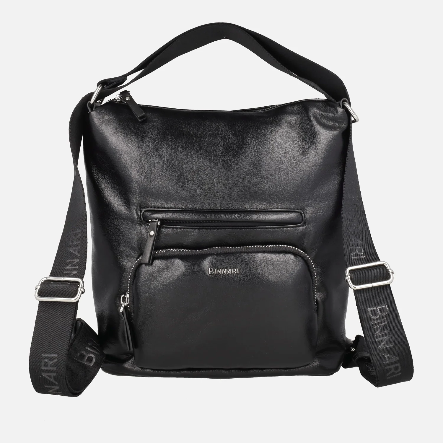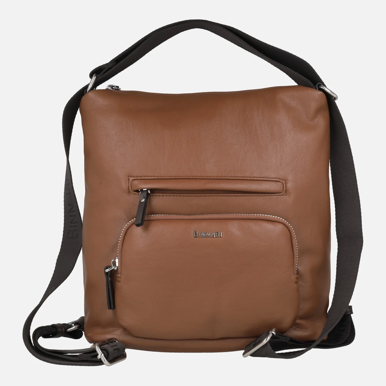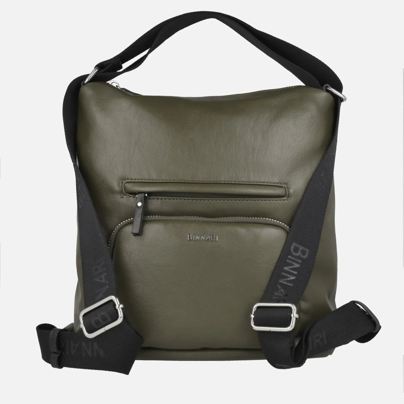 Bolsos doble posición de la marca Binnari modelo Rosie 20892, disponibles en marrón cuero, verde kaki y negro. Bolsos elaborados en materiales sintéticos (PU soft de alta calidad) con cierre principal de cremallera. Pueden llevarse como bolso de hombro o como mochila, según la posición de las asas. Bolsillos delanteros y trasero también con cremallera. Interior textil. Medidas: 31 cm alto x 29 cm de ancho x 13 cm de fondo. Logo metálico Binnari en la parte frontal.